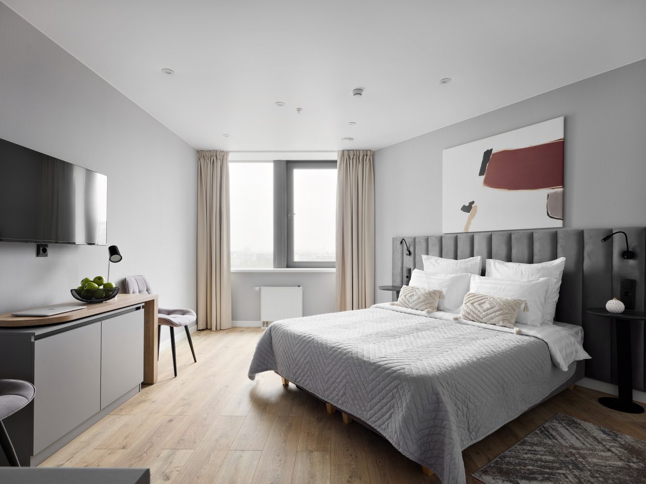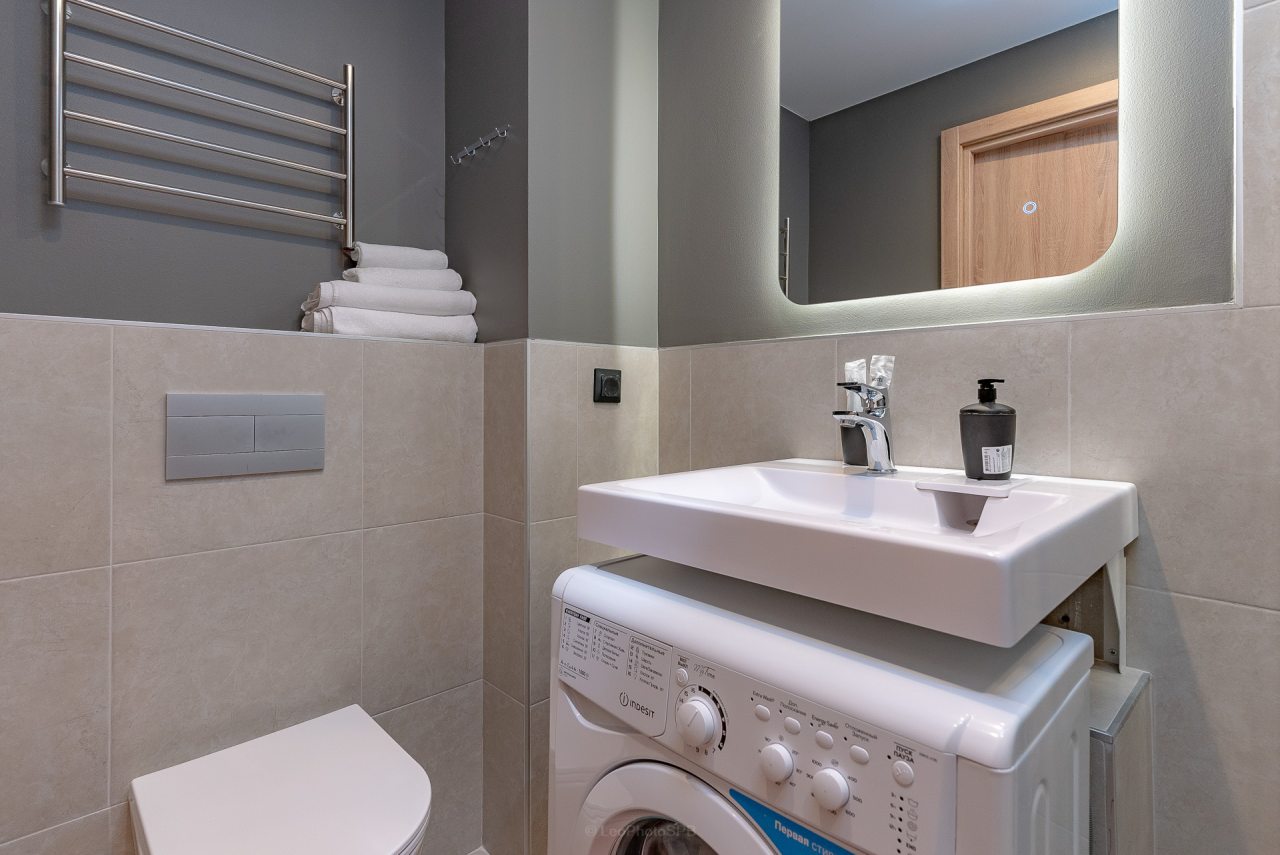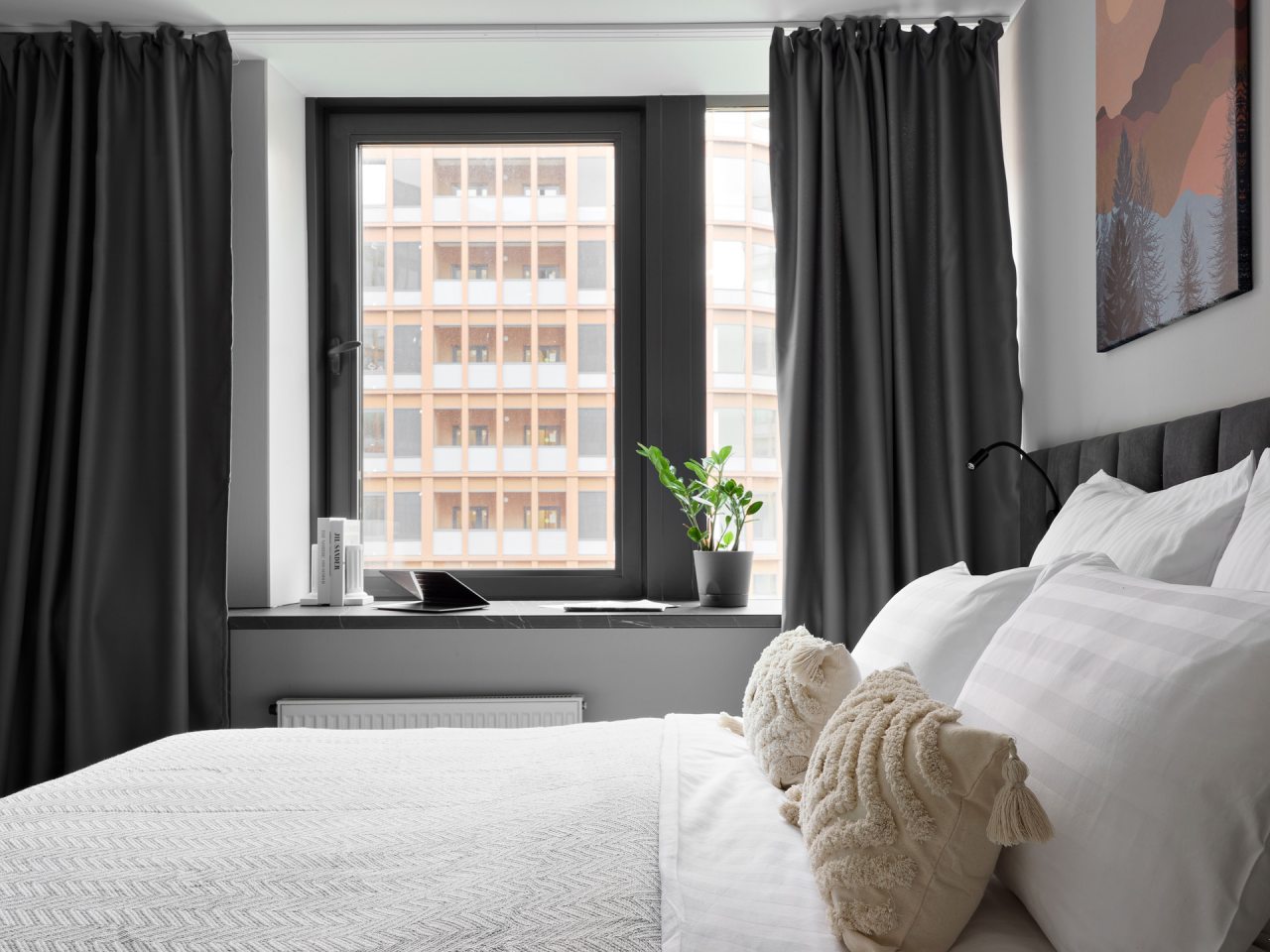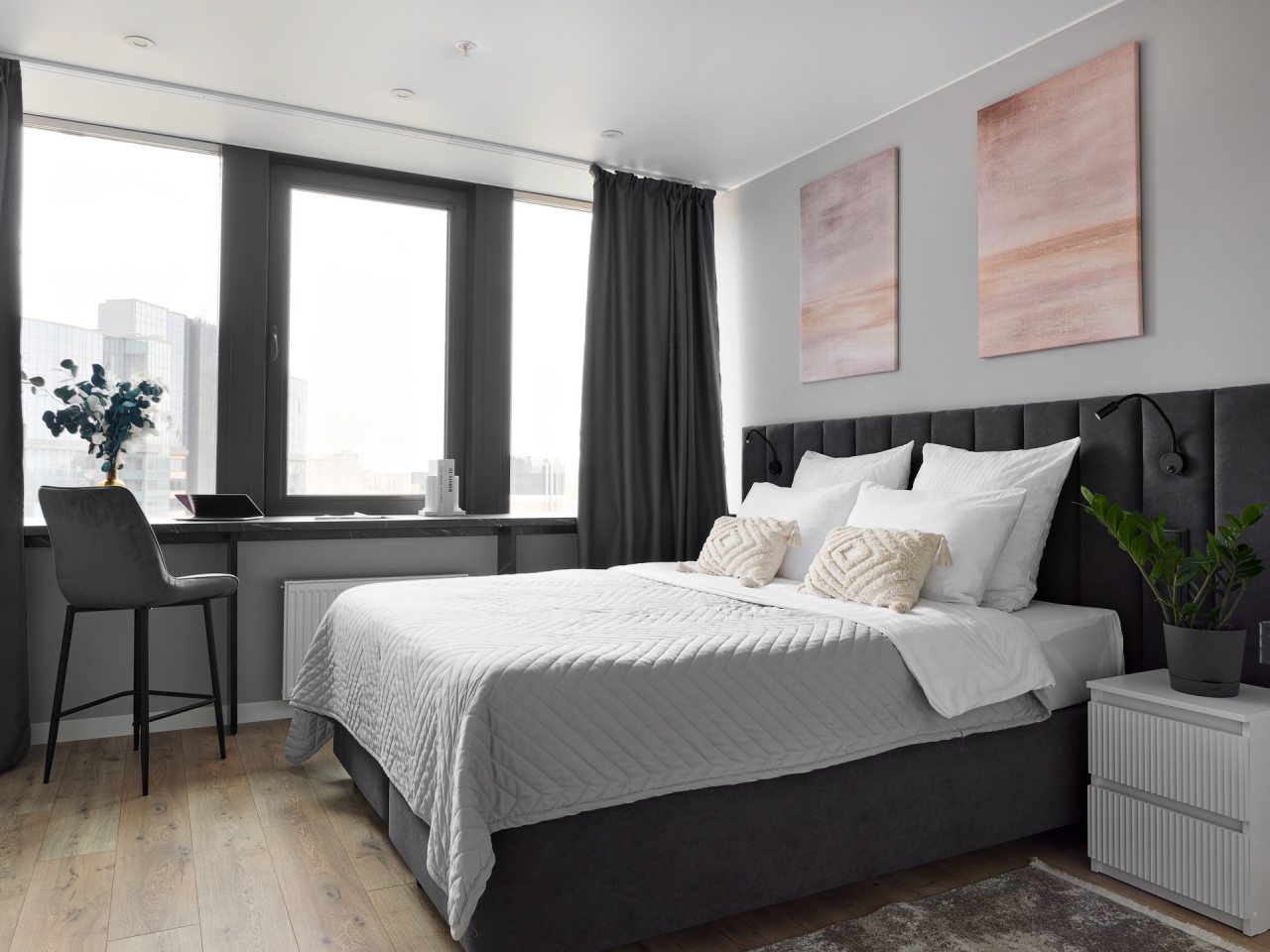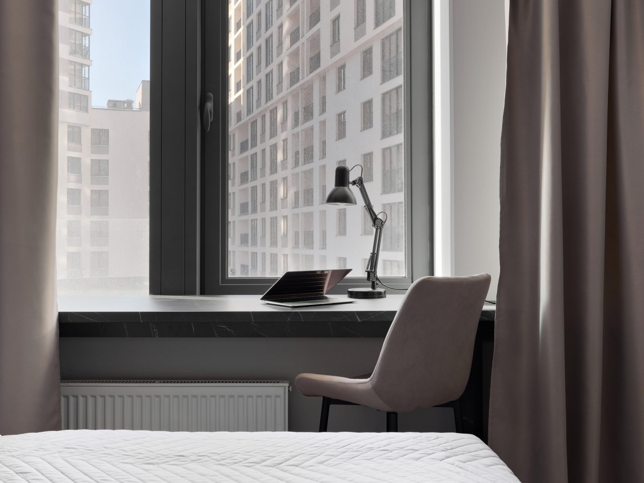 Внутри вас ожидает стильный дизайн, удобная двуспальная кровать с мягким изголовьем, затемнённые шторы, широкий подоконник, который может выступать рабочей и обеденной зоной, зеркало, сплит-система, ЖК-телевизор, а также санузел с необходимыми туалетно-косметическими средствами и стиральной машиной.