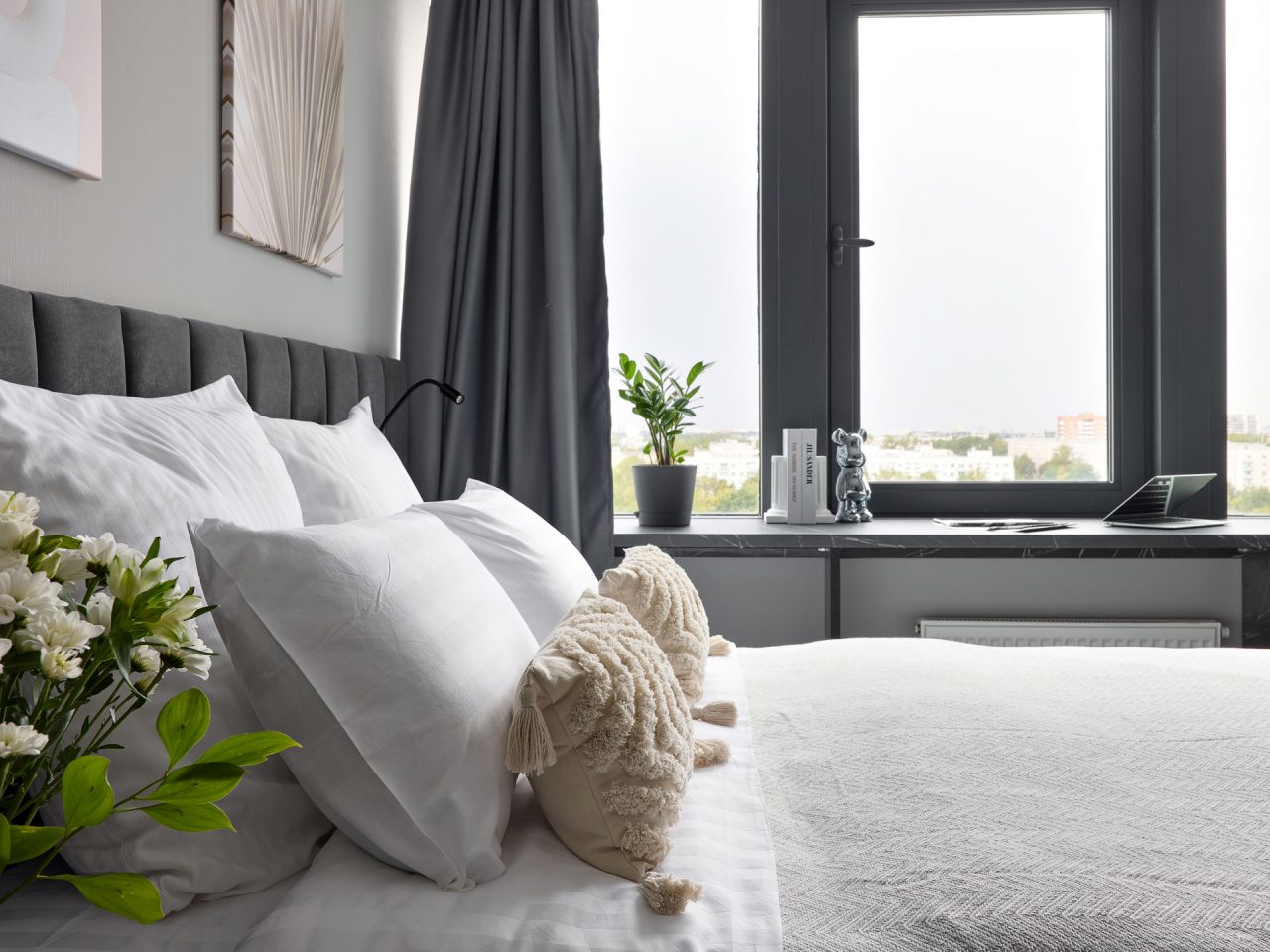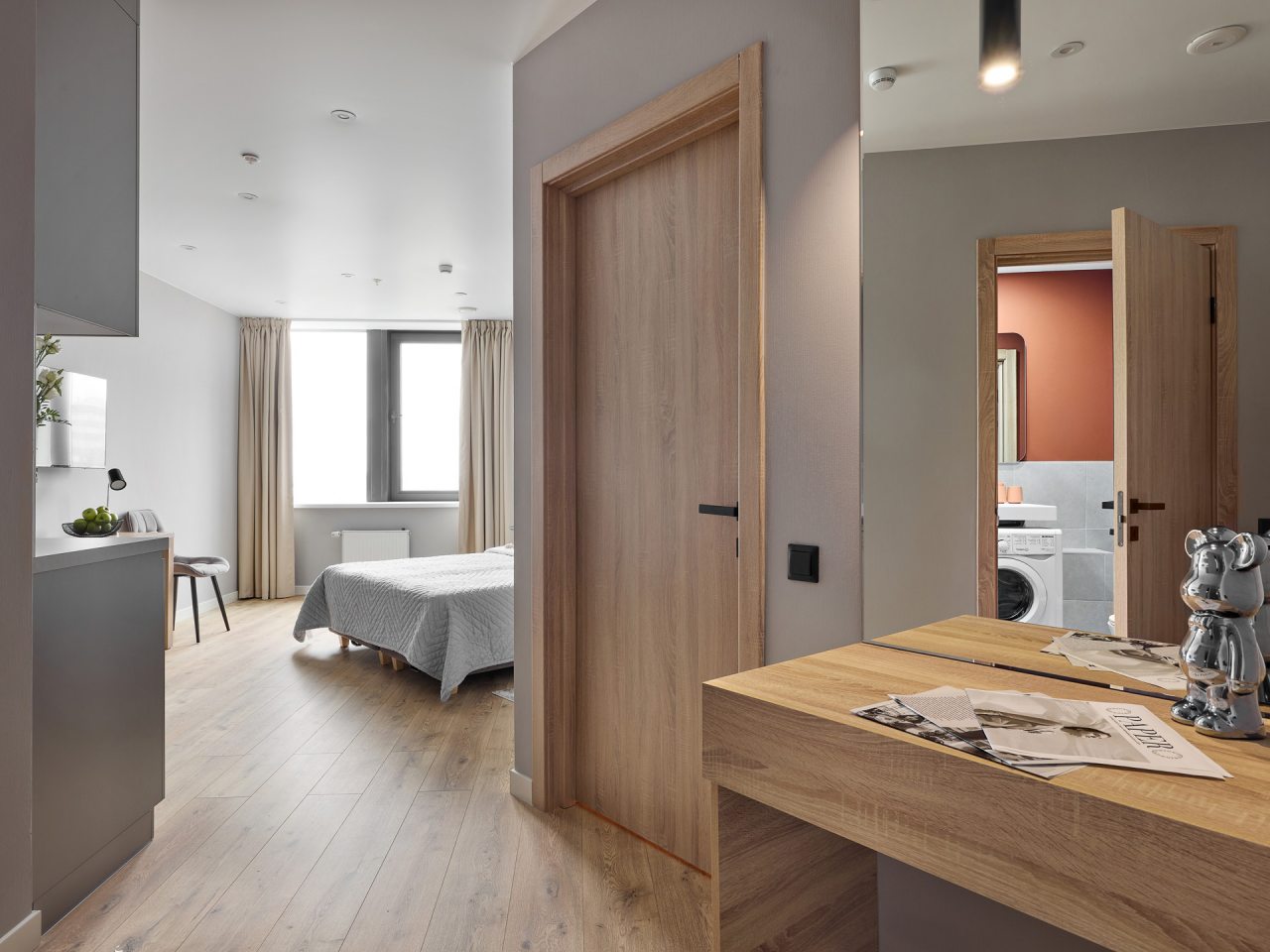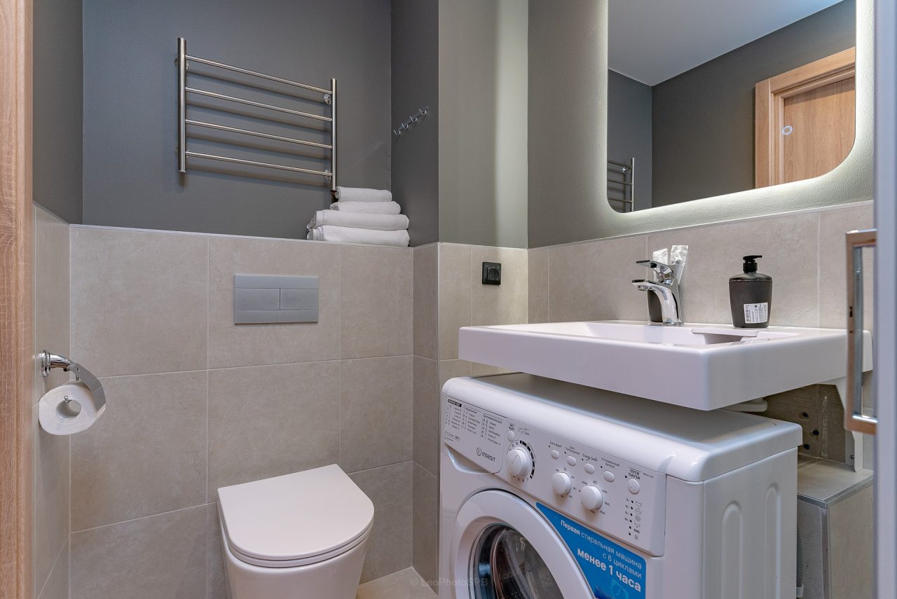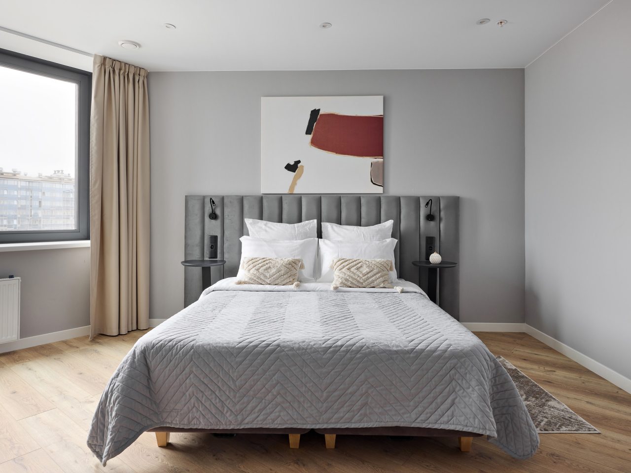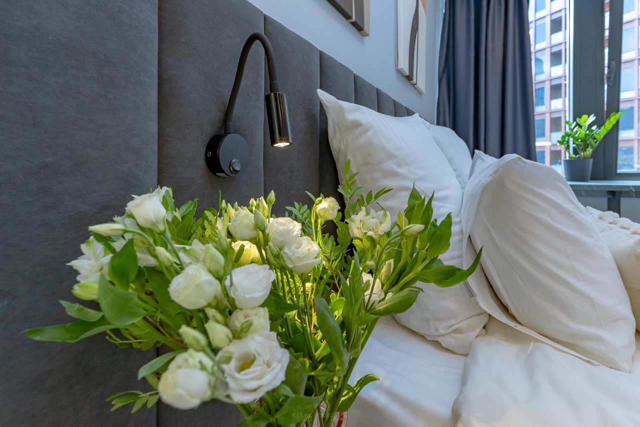Внутри вас ожидает стильный дизайн, удобная двуспальная кровать с мягким изголовьем, затемнённые шторы, широкий подоконник, который может выступать рабочей и обеденной зоной, зеркало, сплит-система, ЖК-телевизор, а также санузел с необходимыми туалетно-косметическими средствами и стиральной машиной.