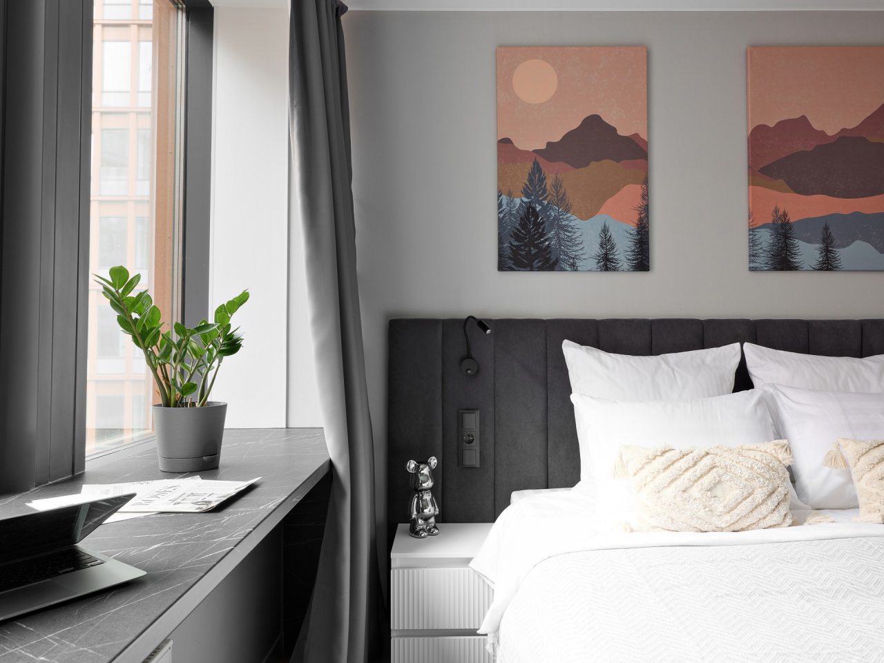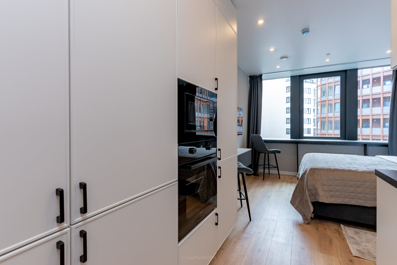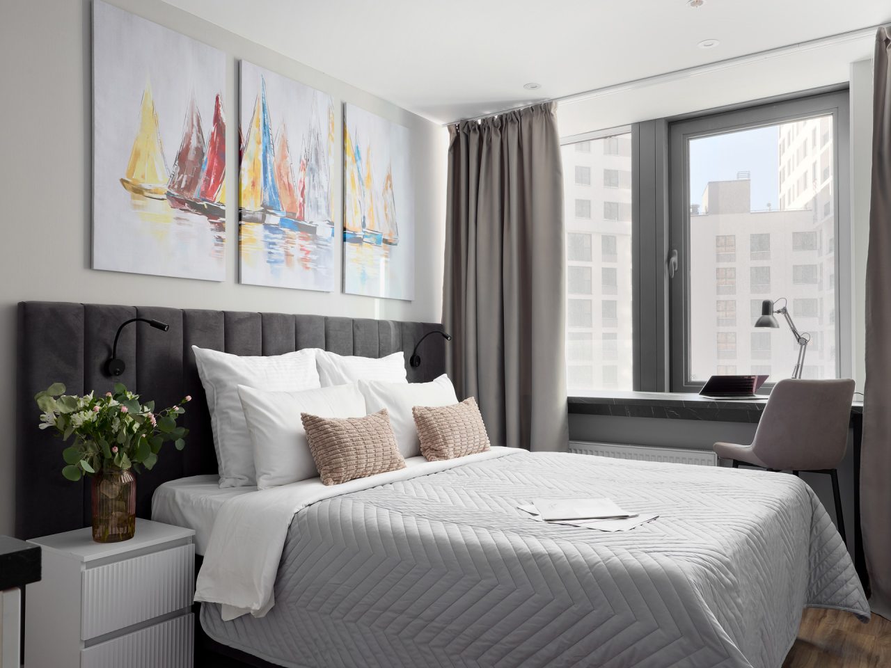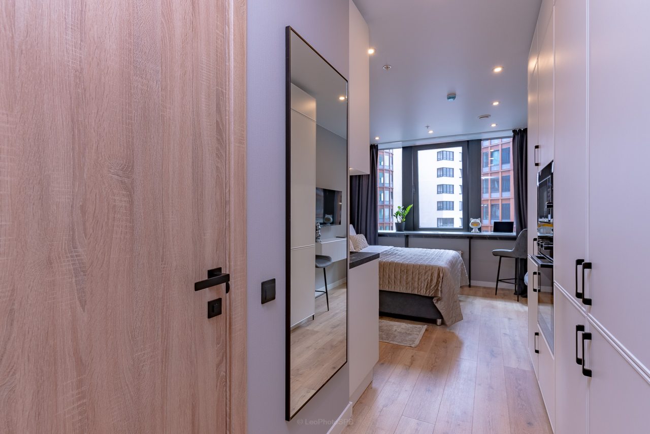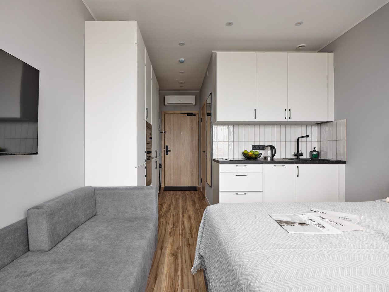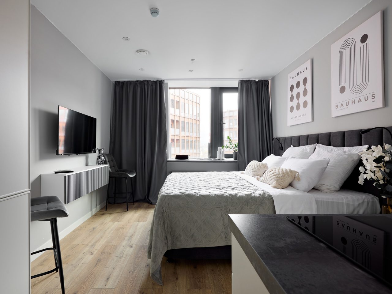 Внутри вас ожидает стильный дизайн, удобная двуспальная кровать с мягким изголовьем, затемнённые шторы, широкий подоконник, который может выступать рабочей и обеденной зоной, зеркало, сплит-система, ЖК-телевизор, а также санузел с необходимыми туалетно-косметическими средствами и стиральной машиной.