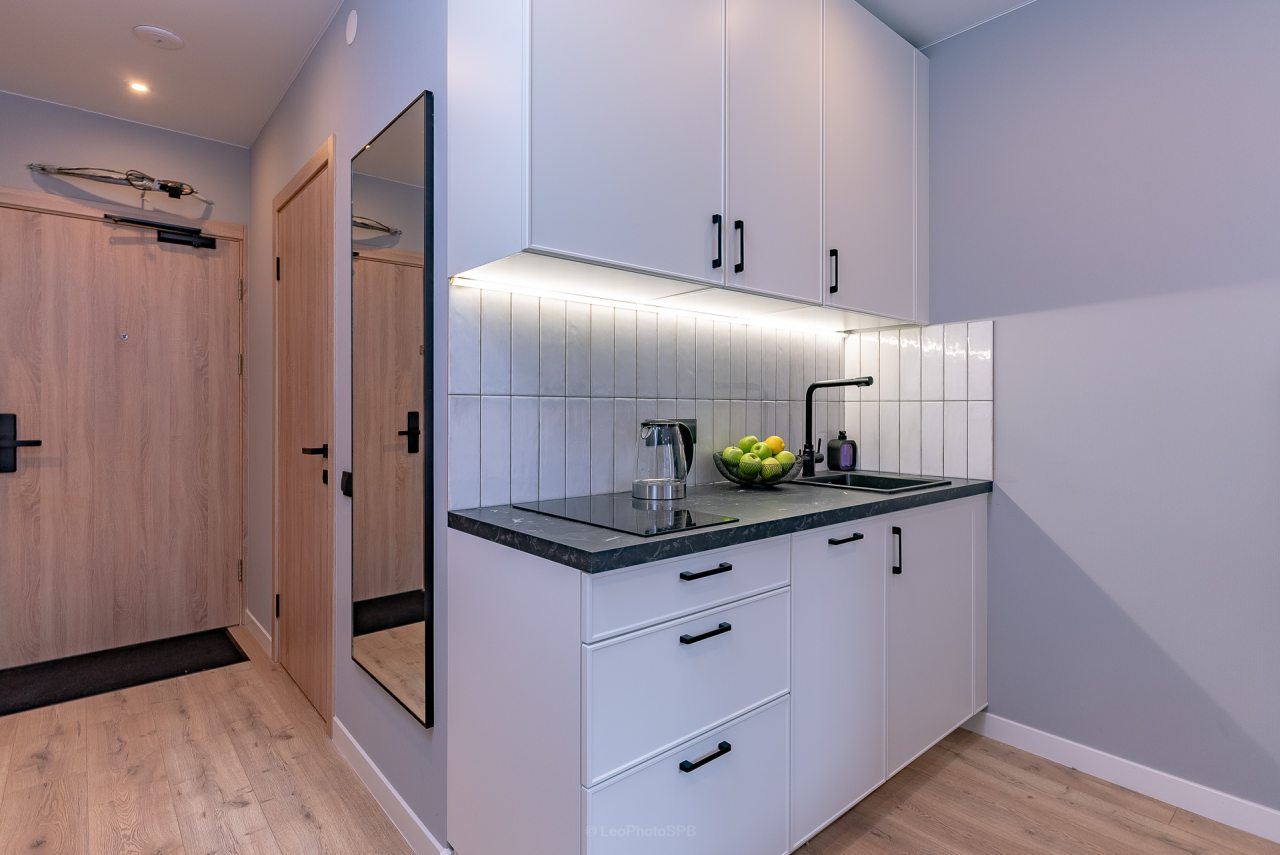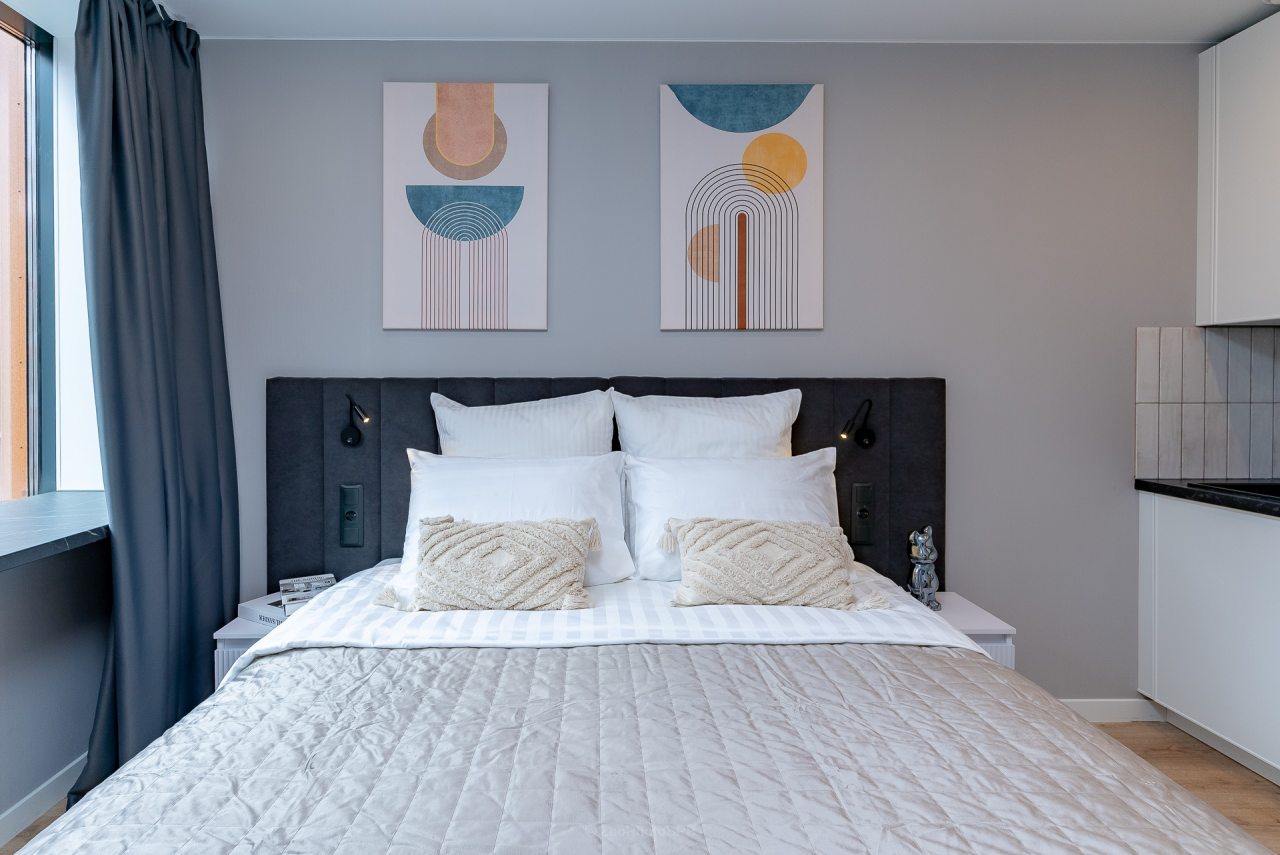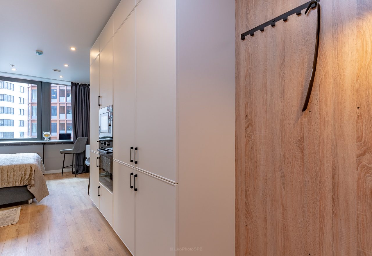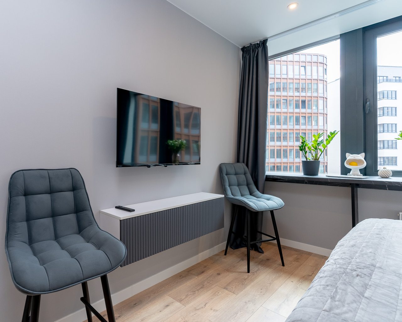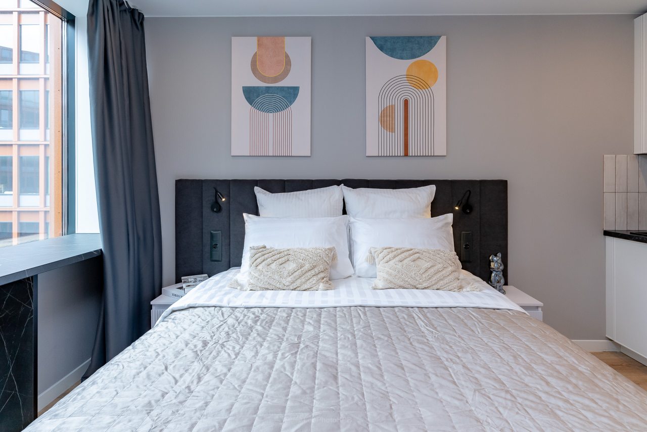 Внутри вас ожидает стильный дизайн, удобная двуспальная кровать с мягким изголовьем, затемнённые шторы, широкий подоконник, который может выступать рабочей и обеденной зоной, зеркало, сплит-система, ЖК-телевизор, а также санузел с необходимыми туалетно-косметическими средствами и стиральной машиной.