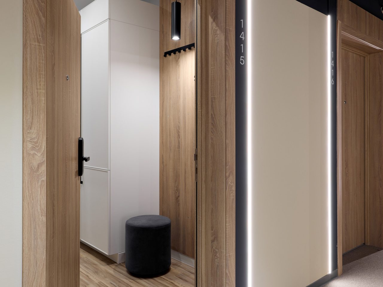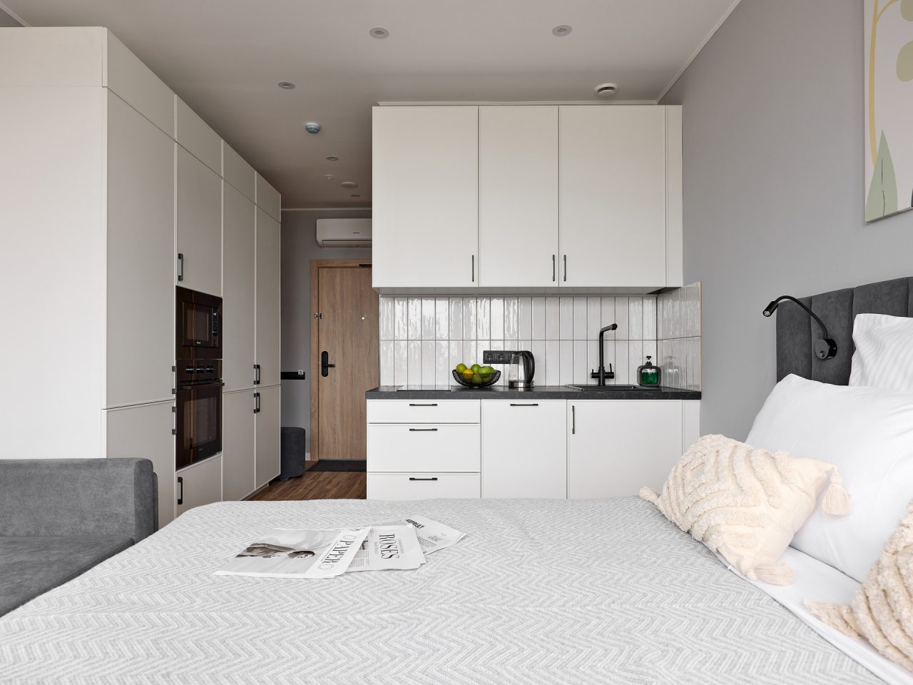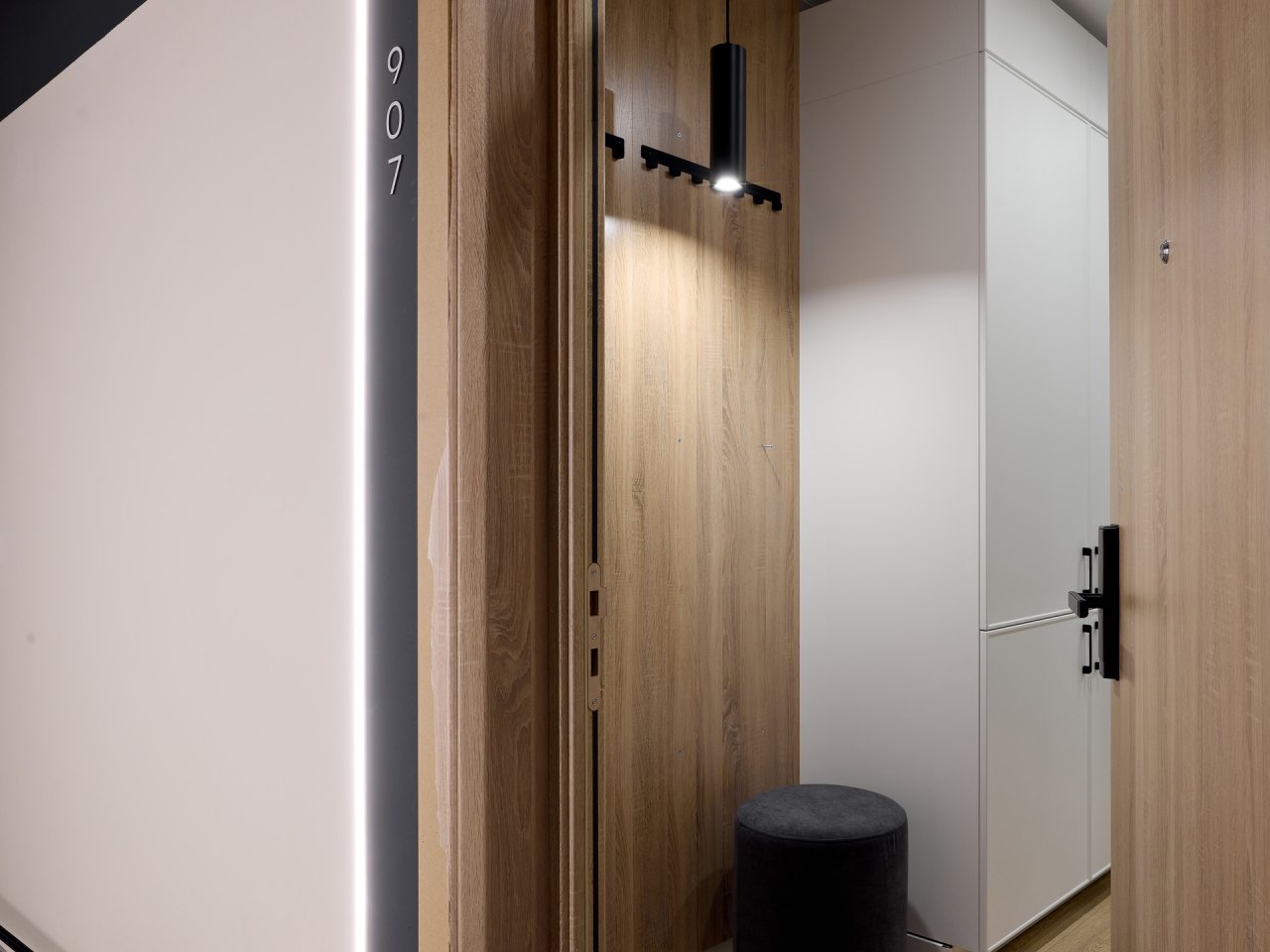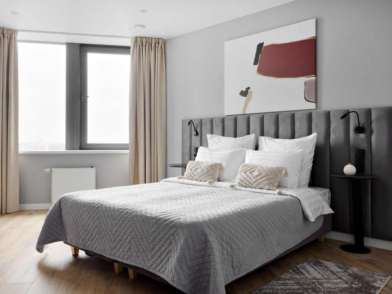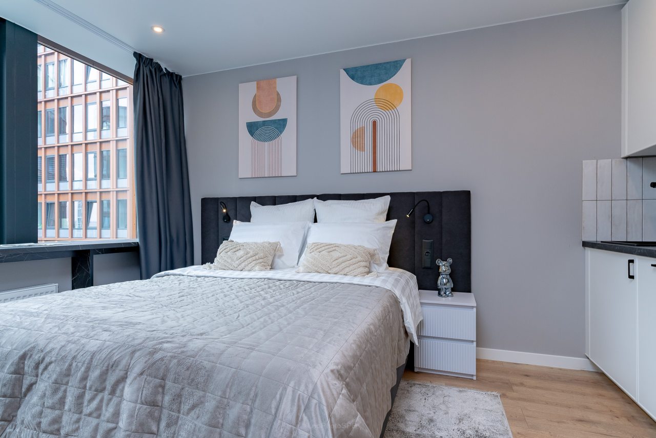 Внутри вас ожидает стильный дизайн, удобная двуспальная кровать с мягким изголовьем, затемнённые шторы, широкий подоконник, который может выступать рабочей и обеденной зоной, зеркало, сплит-система, ЖК-телевизор, а также санузел с необходимыми туалетно-косметическими средствами и стиральной машиной.