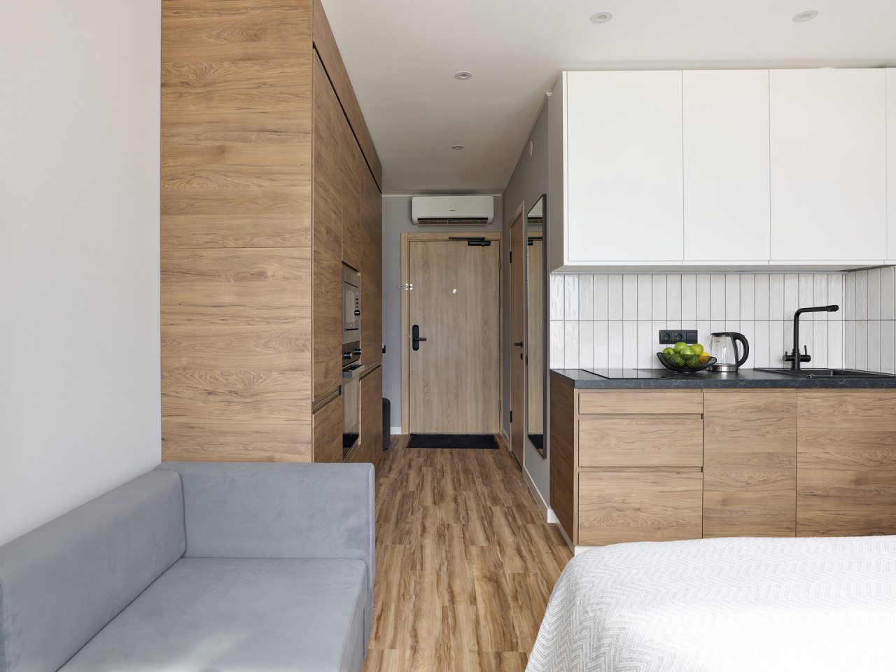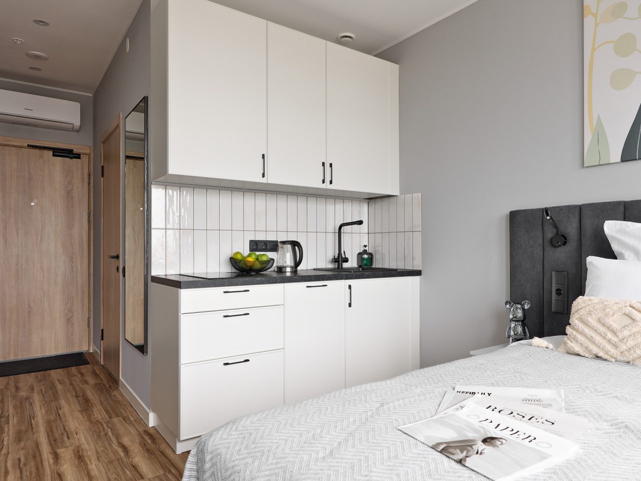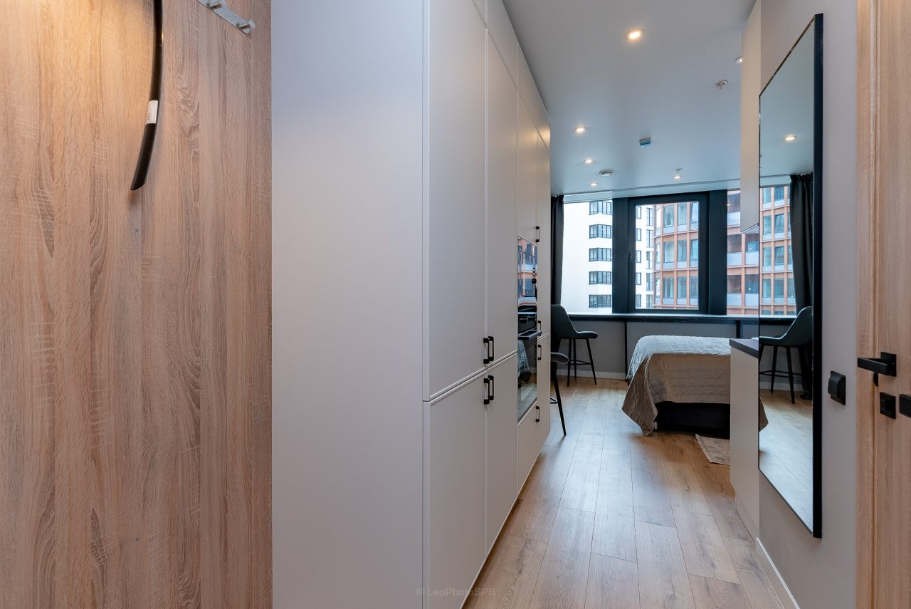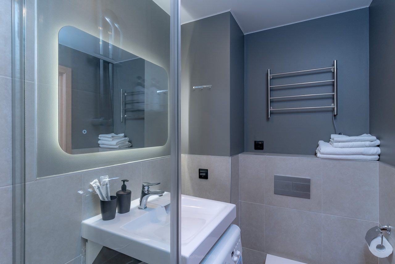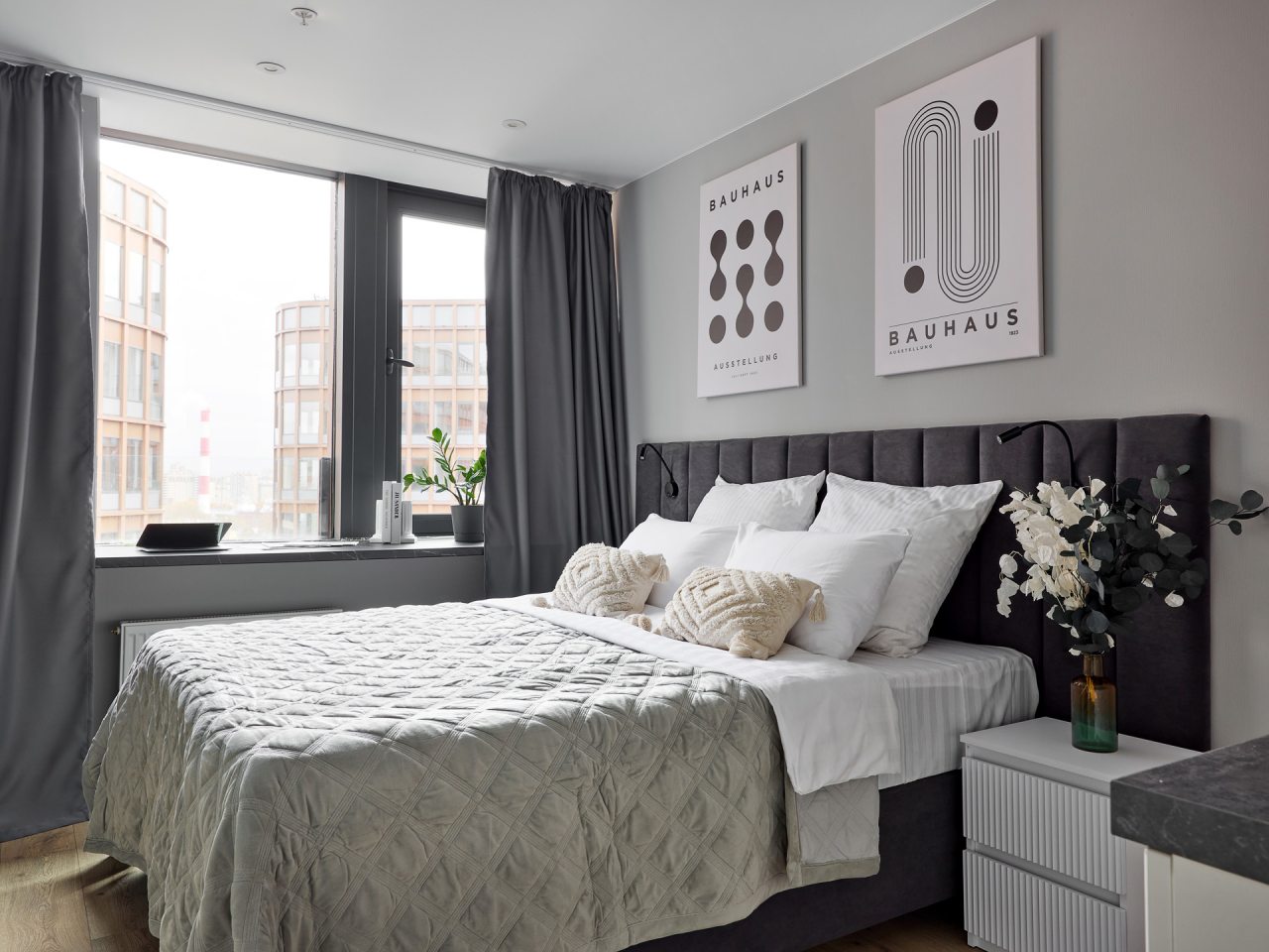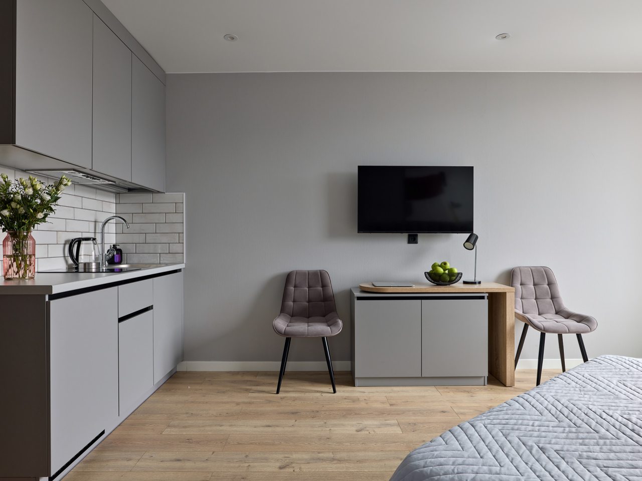 Внутри вас ожидает стильный дизайн, удобная двуспальная кровать с мягким изголовьем, затемнённые шторы, широкий подоконник, который может выступать рабочей и обеденной зоной, зеркало, сплит-система, ЖК-телевизор, а также санузел с необходимыми туалетно-косметическими средствами и стиральной машиной.