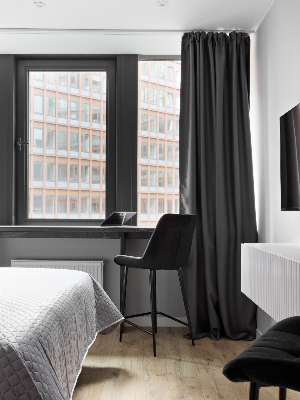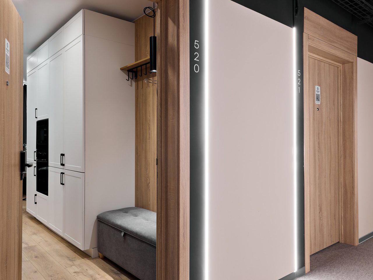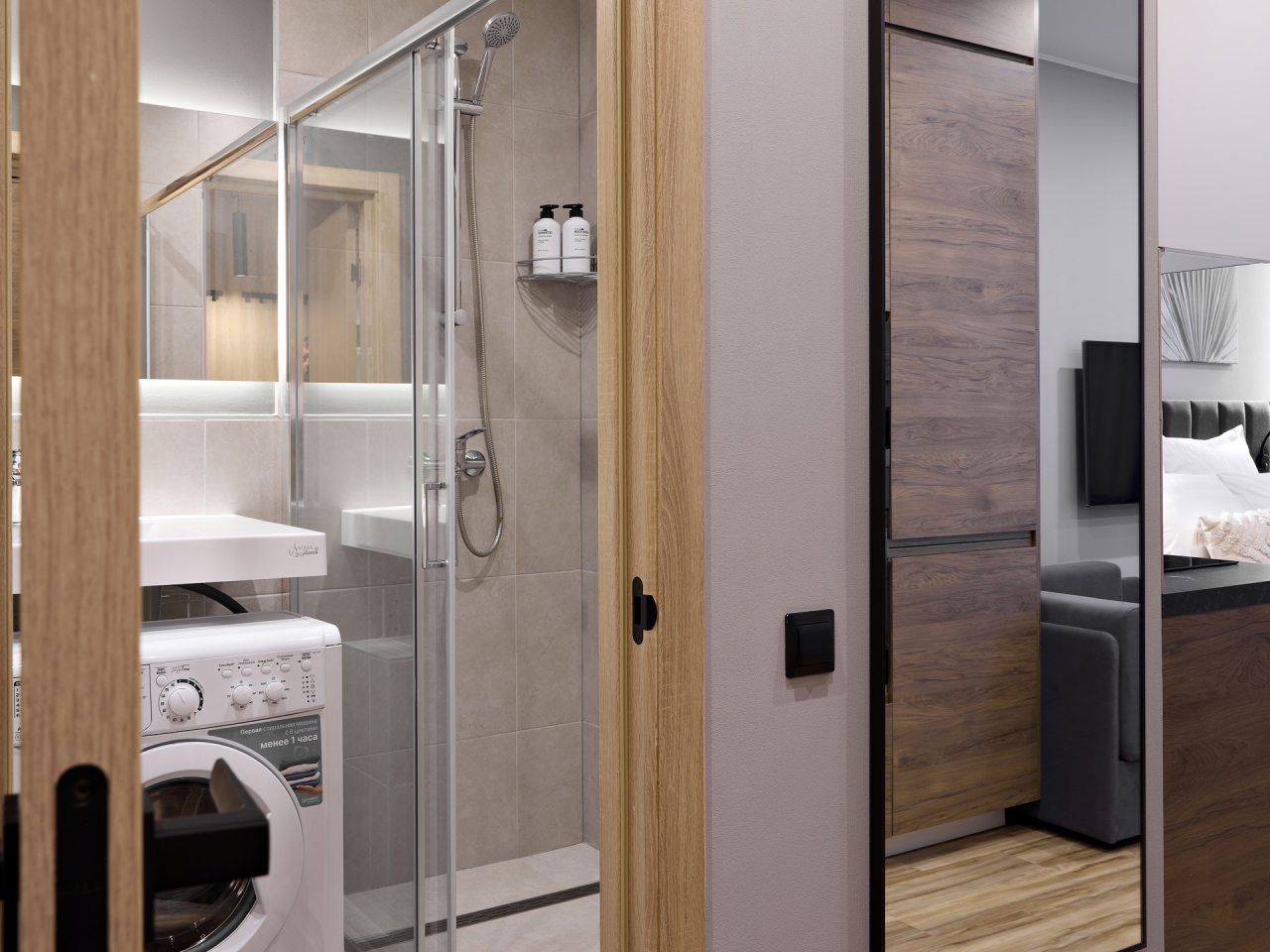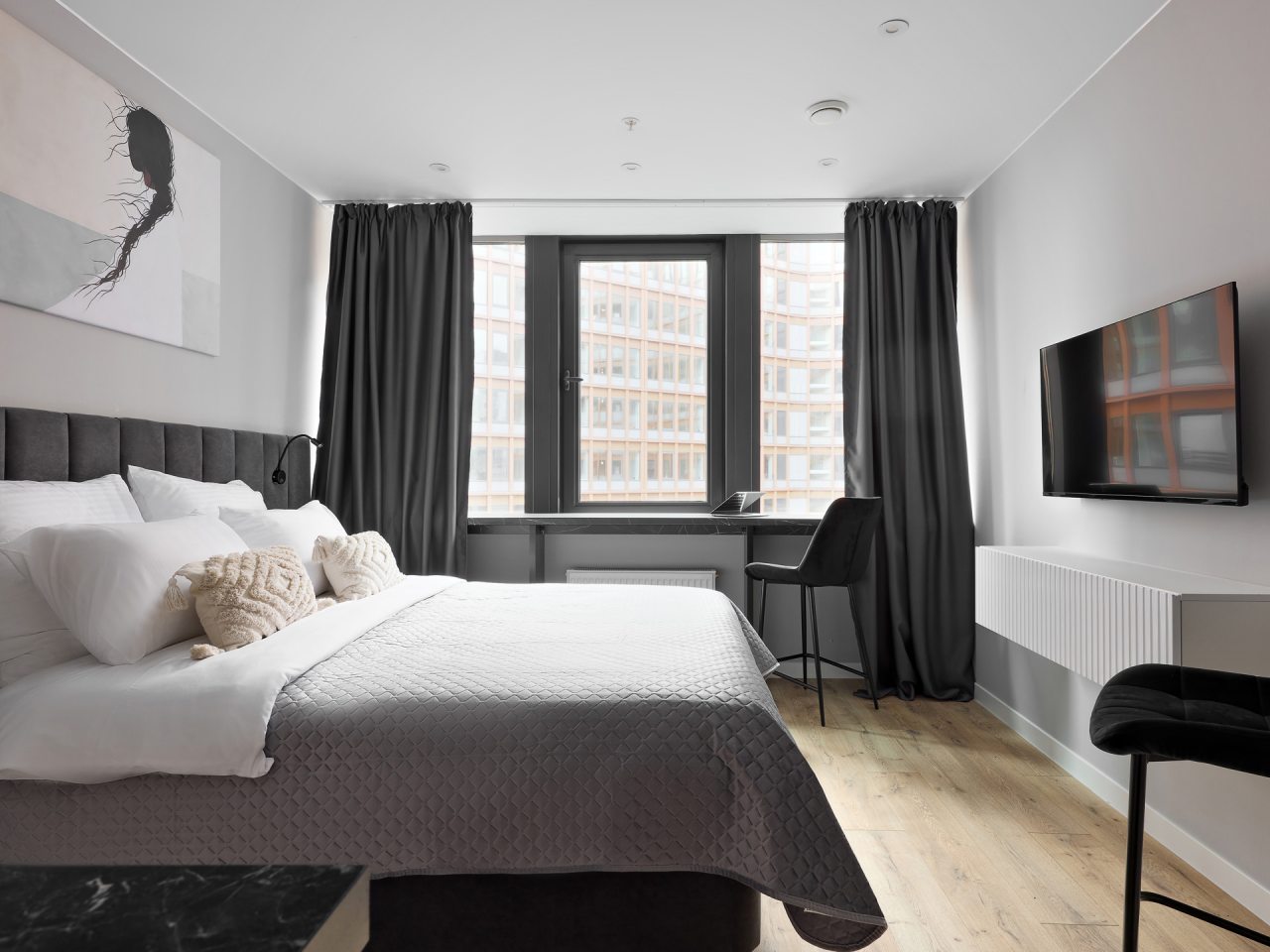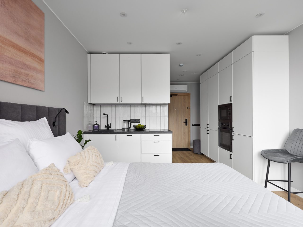 Внутри вас ожидает стильный дизайн, удобная двуспальная кровать с мягким изголовьем, затемнённые шторы, широкий подоконник, который может выступать рабочей и обеденной зоной, зеркало, сплит-система, ЖК-телевизор, а также санузел с необходимыми туалетно-косметическими средствами и стиральной машиной.
