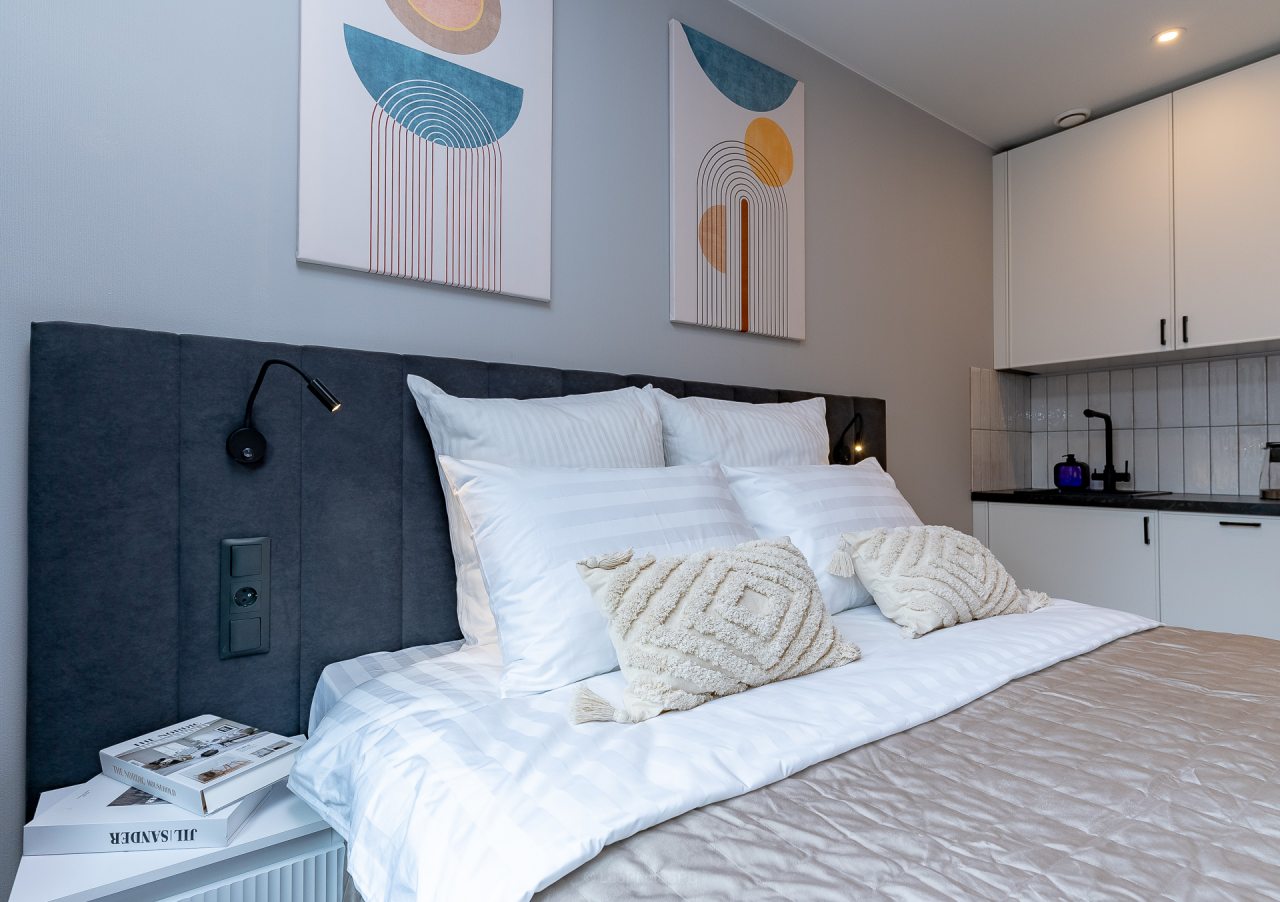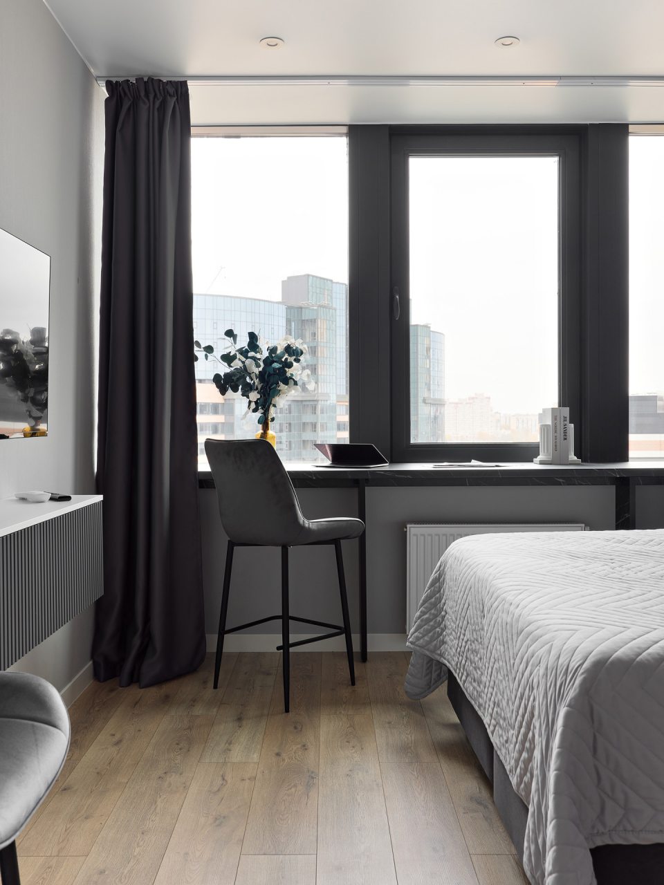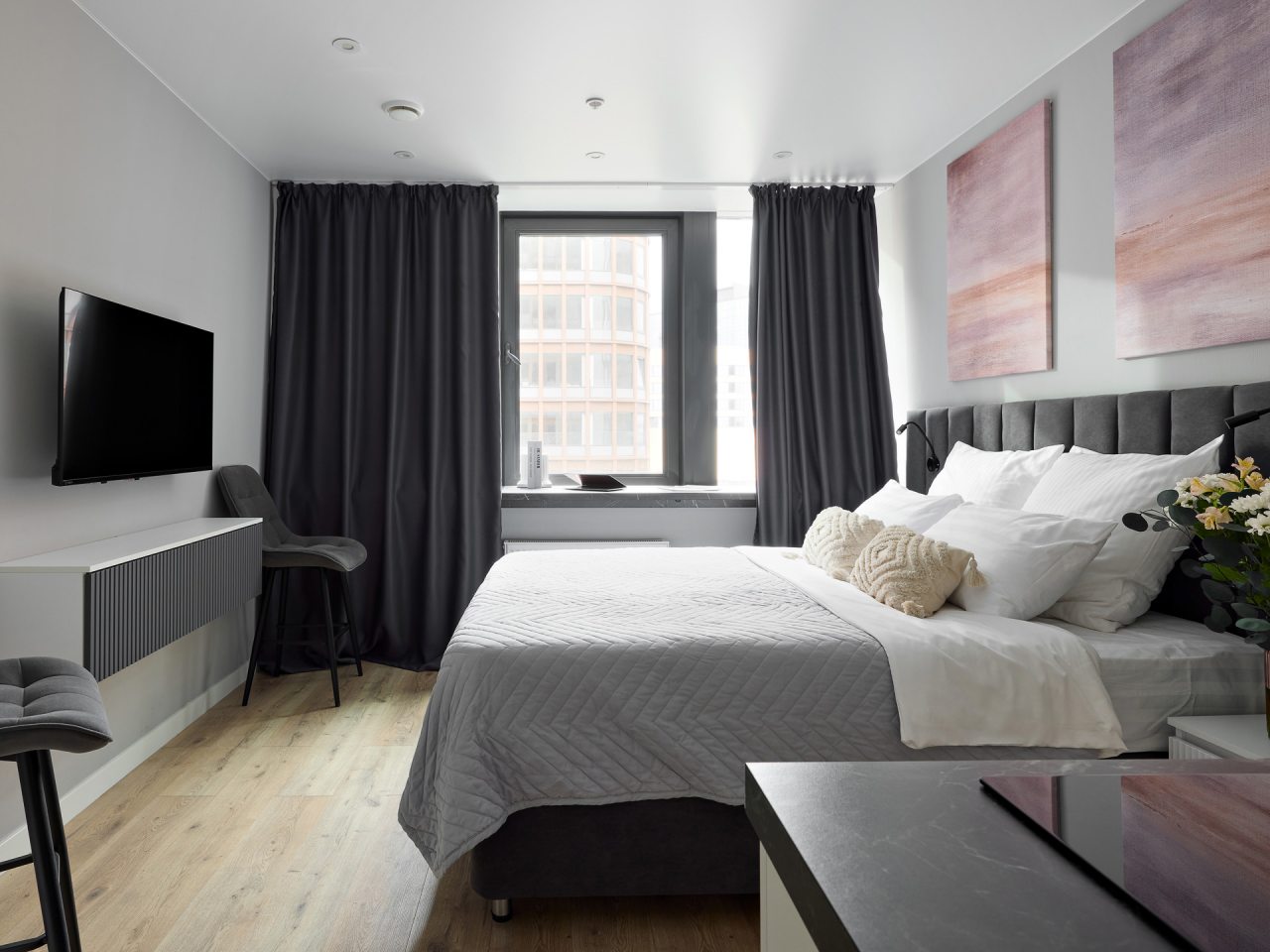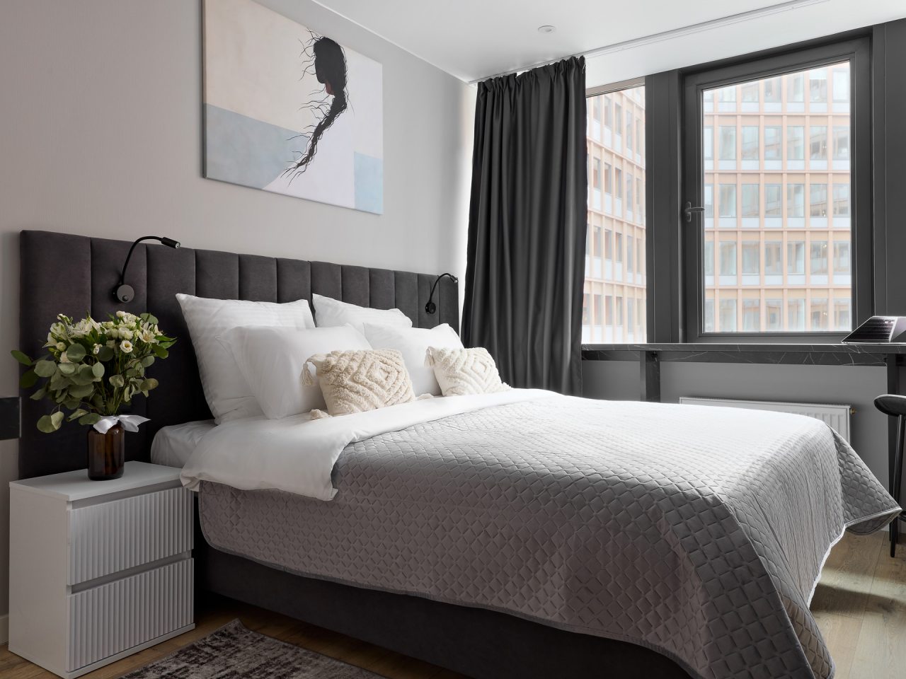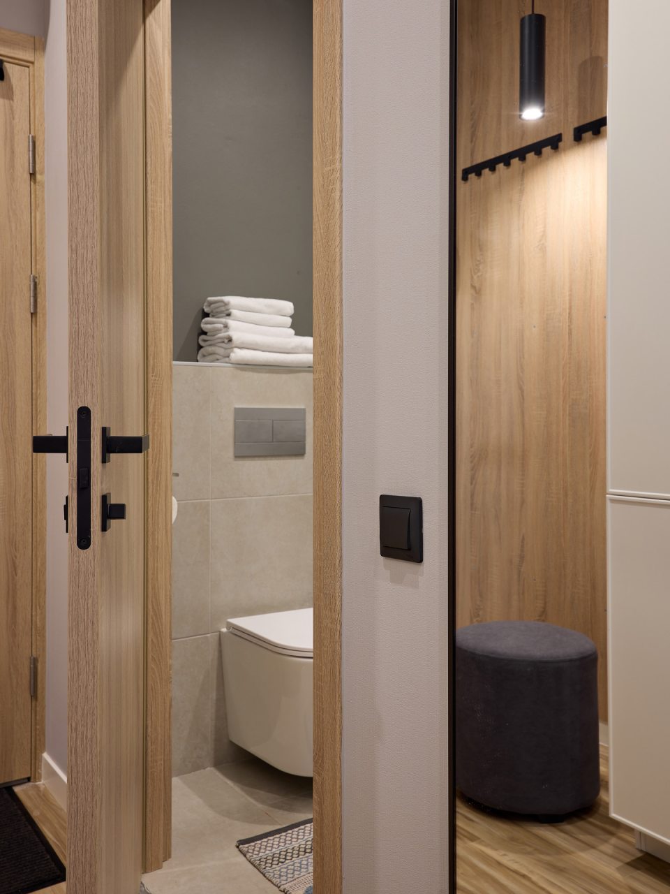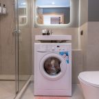 Внутри вас ожидает стильный дизайн, удобная двуспальная кровать с мягким изголовьем, затемнённые шторы, широкий подоконник, который может выступать рабочей и обеденной зоной, зеркало, сплит-система, ЖК-телевизор, а также санузел с необходимыми туалетно-косметическими средствами и стиральной машиной.