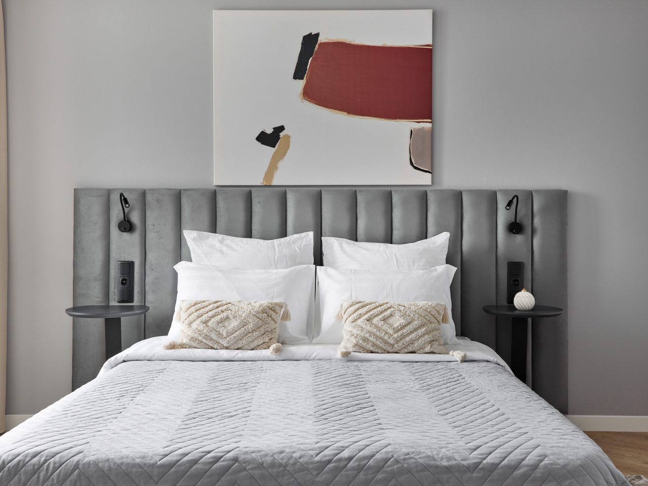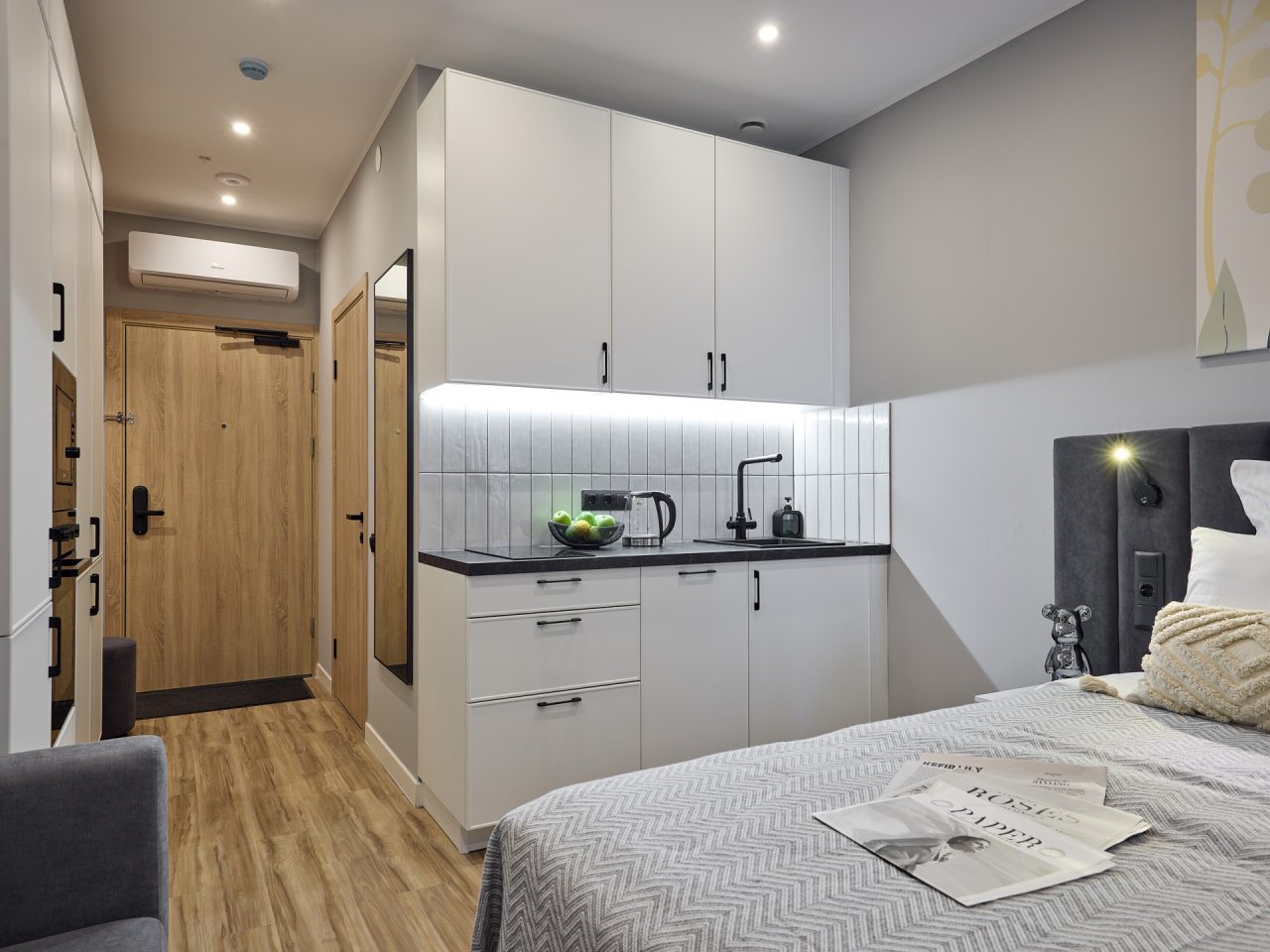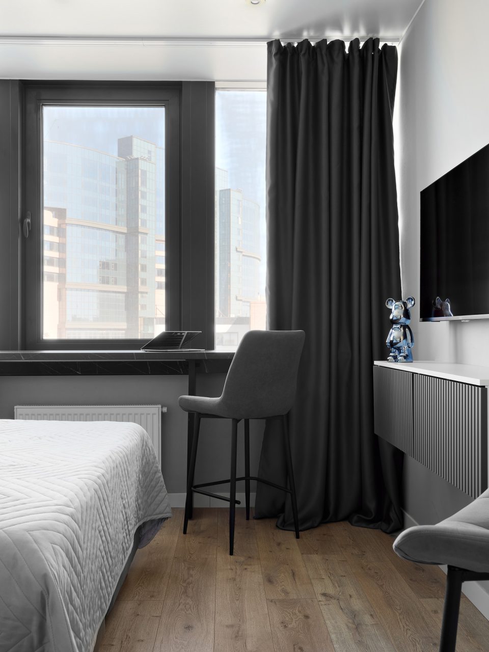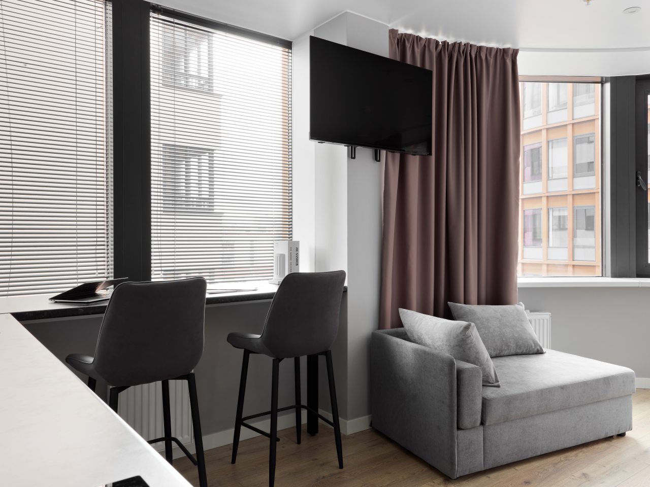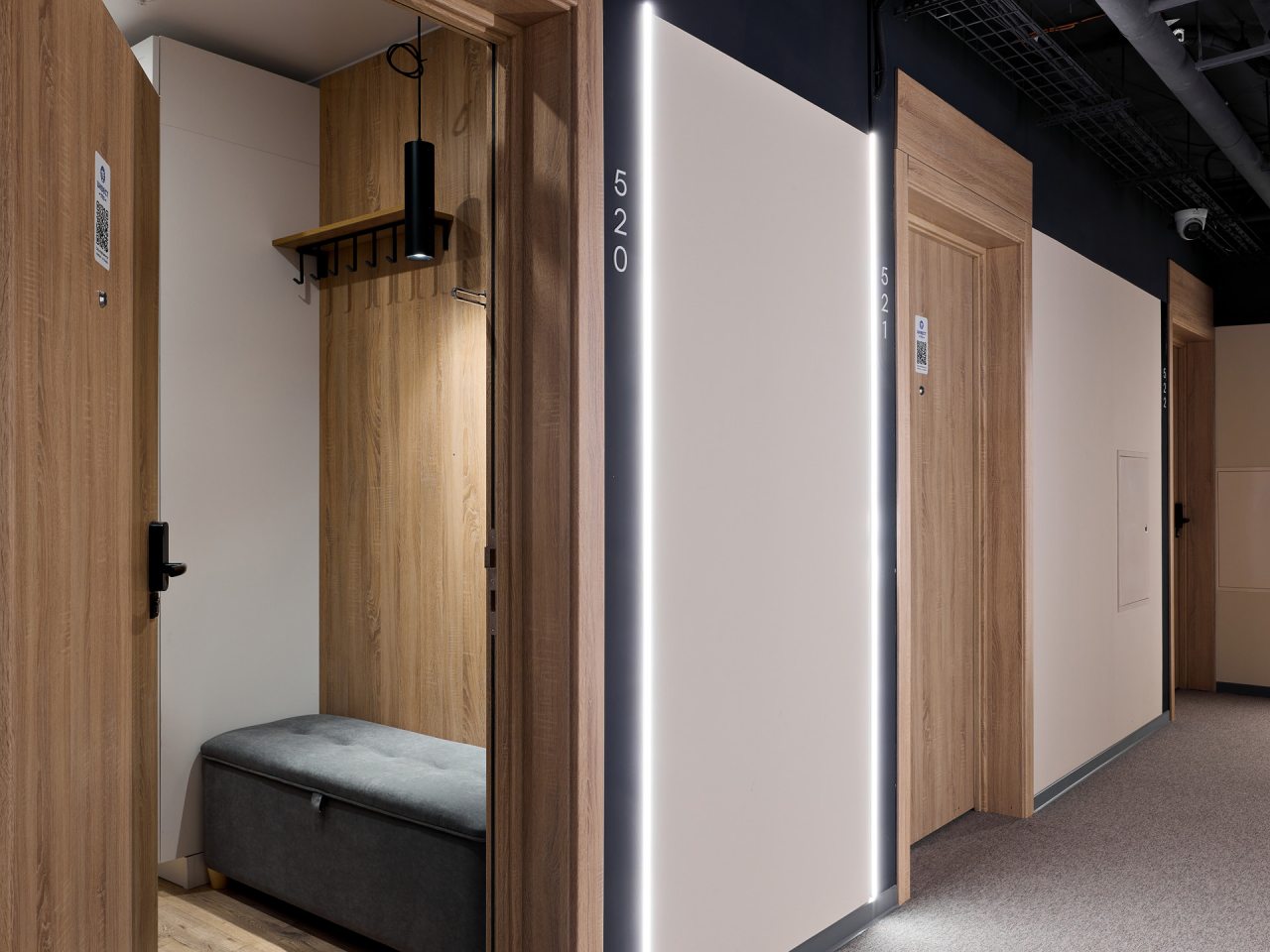 Внутри вас ожидает стильный дизайн, удобная двуспальная кровать с мягким изголовьем, затемнённые шторы, широкий подоконник, который может выступать рабочей и обеденной зоной, зеркало, сплит-система, ЖК-телевизор, а также санузел с необходимыми туалетно-косметическими средствами и стиральной машиной.