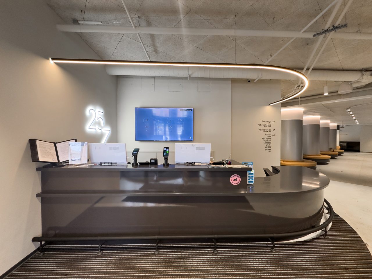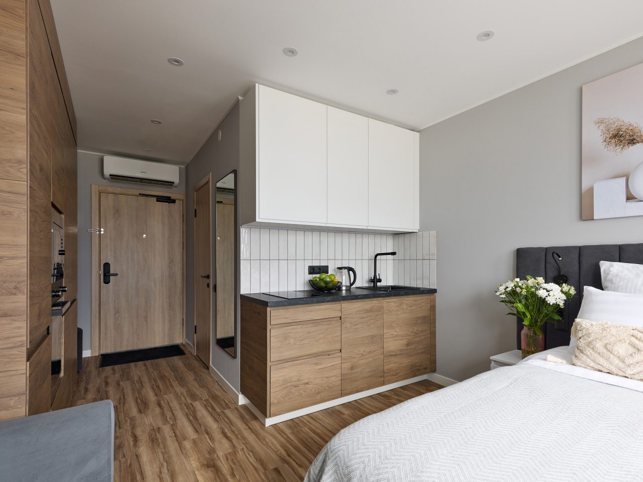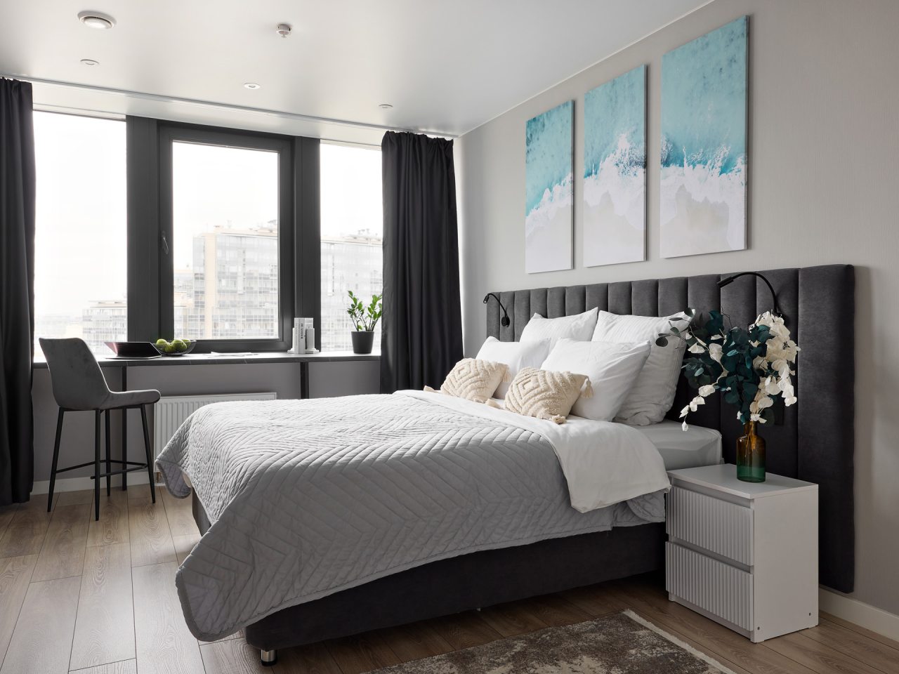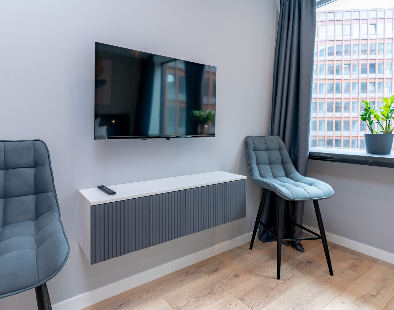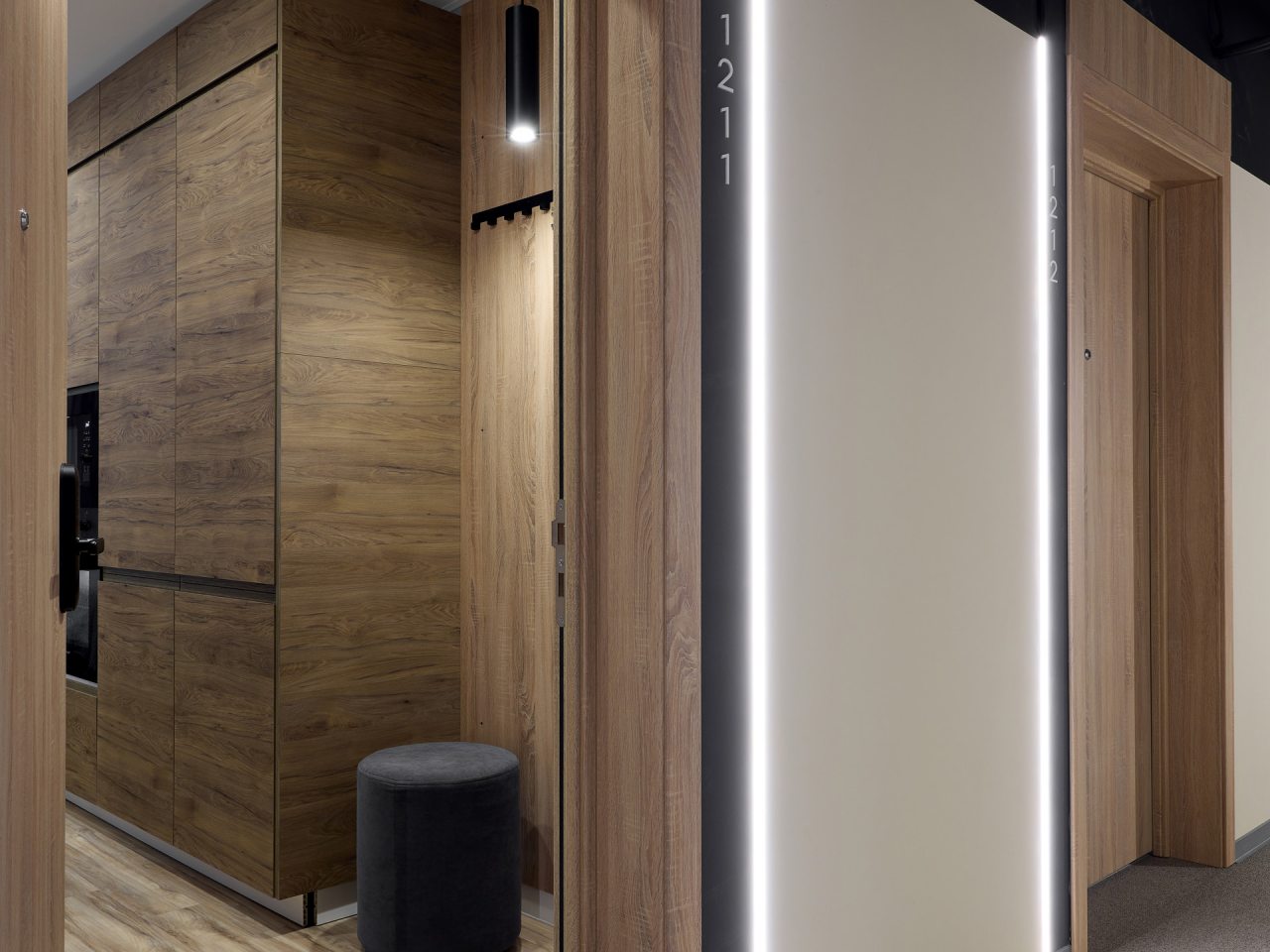 Внутри вас ожидает стильный дизайн, удобная двуспальная кровать с мягким изголовьем, затемнённые шторы, широкий подоконник, который может выступать рабочей и обеденной зоной, зеркало, сплит-система, ЖК-телевизор, а также санузел с необходимыми туалетно-косметическими средствами и стиральной машиной.