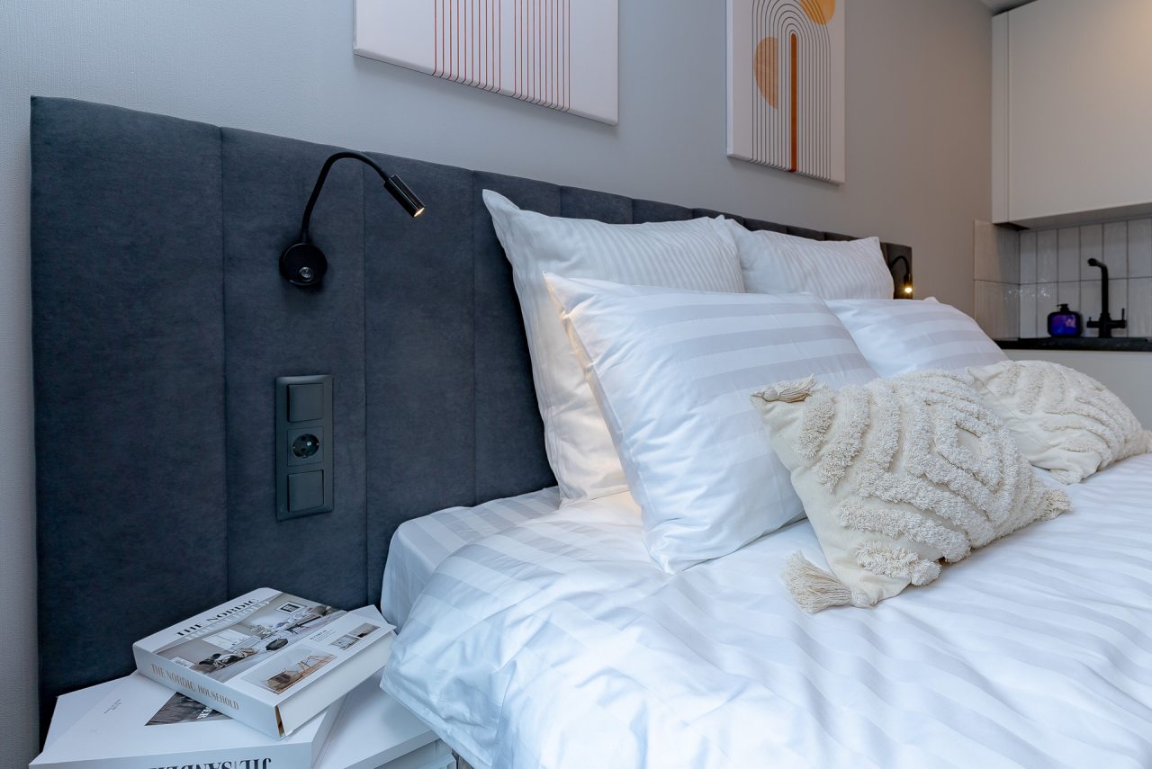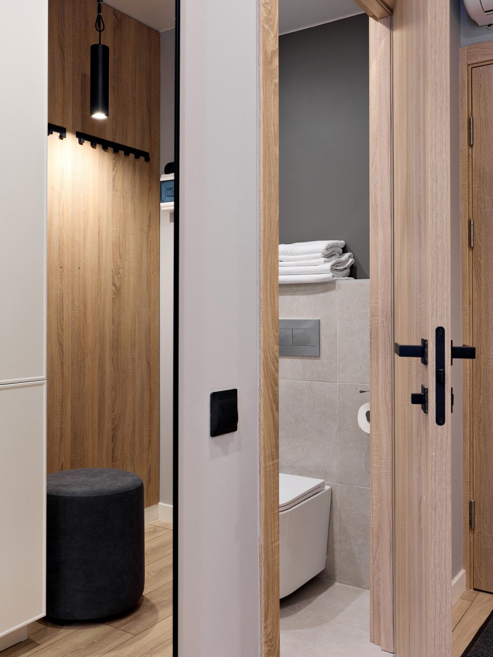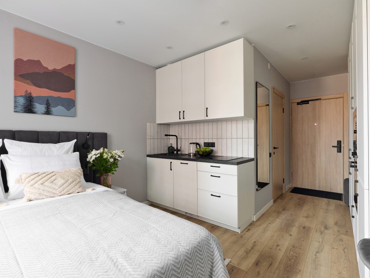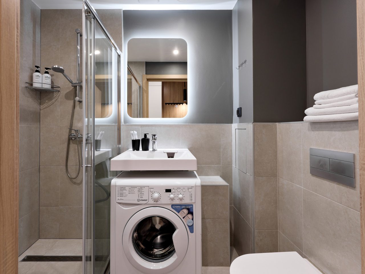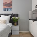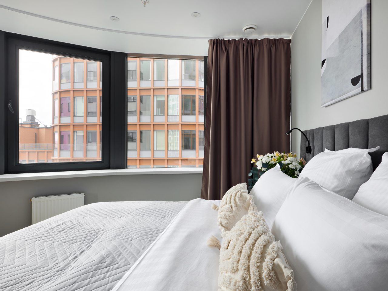 Внутри вас ожидает стильный дизайн, удобная двуспальная кровать с мягким изголовьем, затемнённые шторы, широкий подоконник, который может выступать рабочей и обеденной зоной, зеркало, сплит-система, ЖК-телевизор, а также санузел с необходимыми туалетно-косметическими средствами и стиральной машиной.
