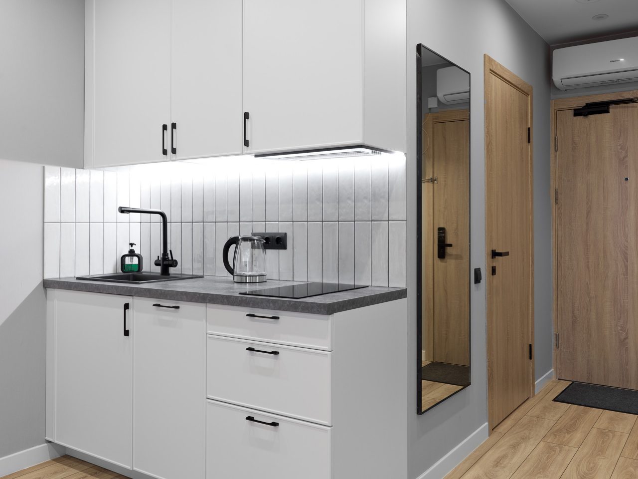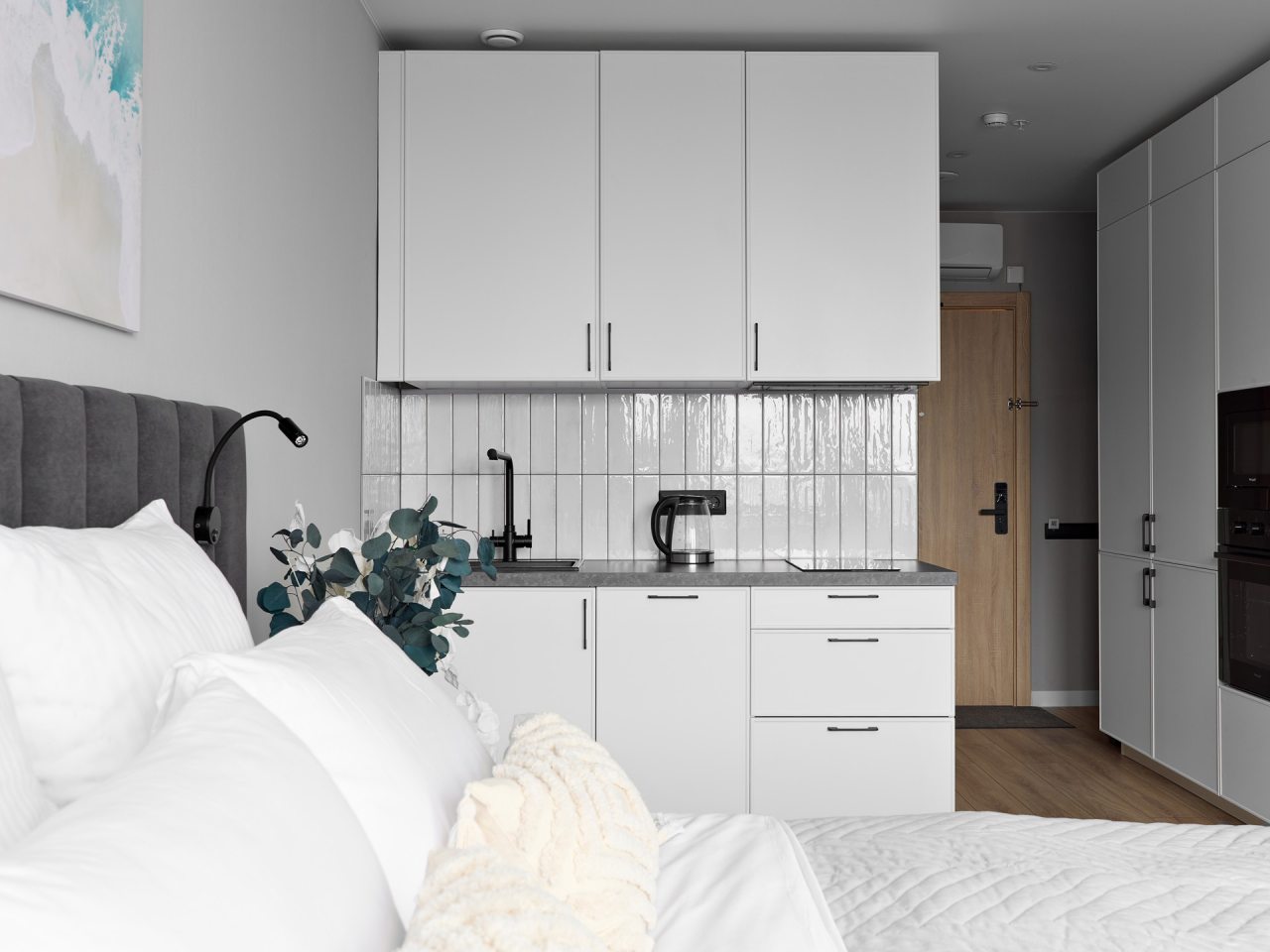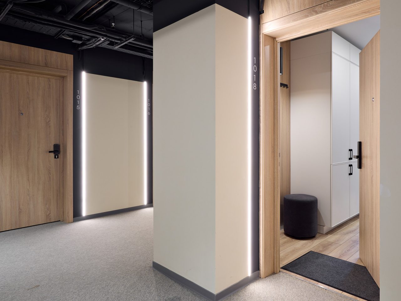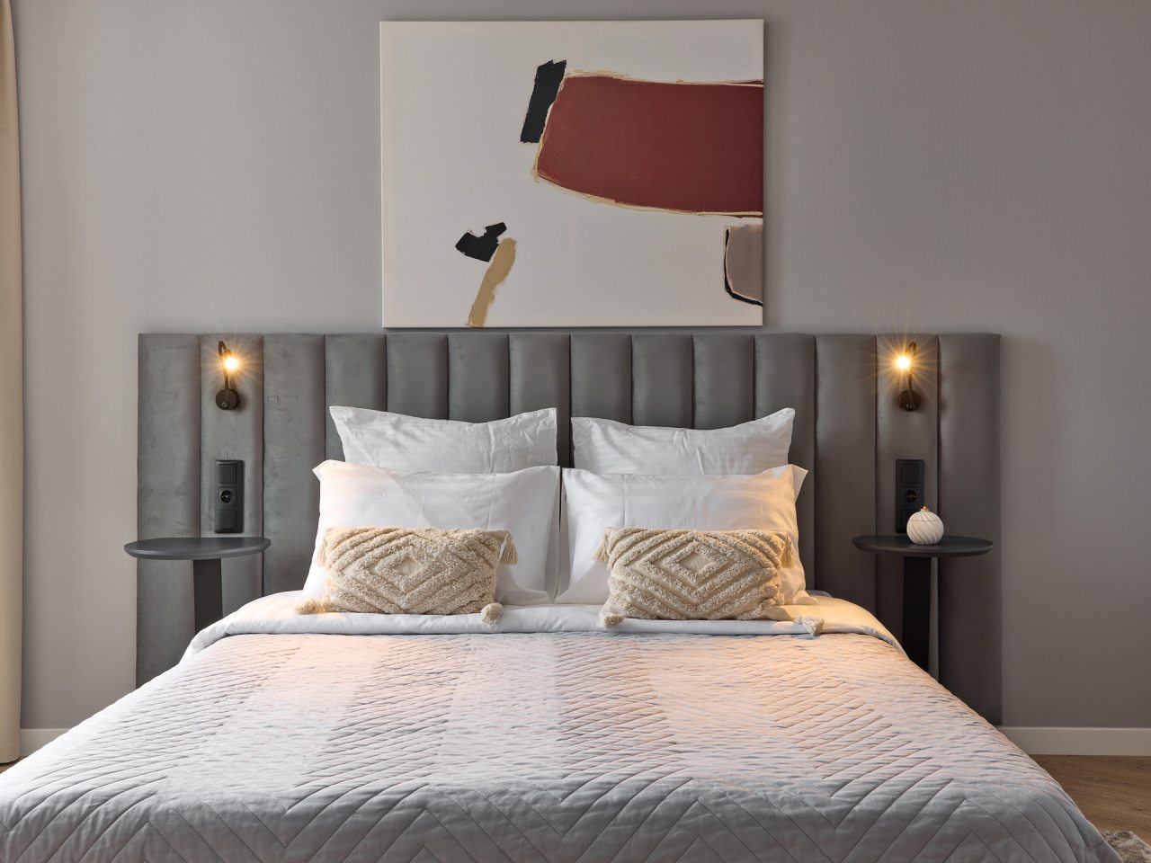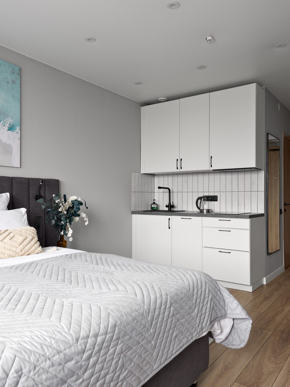 Внутри вас ожидает стильный дизайн, удобная двуспальная кровать с мягким изголовьем, затемнённые шторы, широкий подоконник, который может выступать рабочей и обеденной зоной, зеркало, сплит-система, ЖК-телевизор, а также санузел с необходимыми туалетно-косметическими средствами и стиральной машиной.