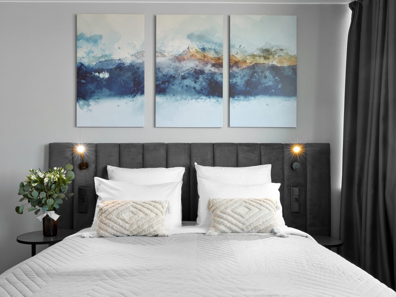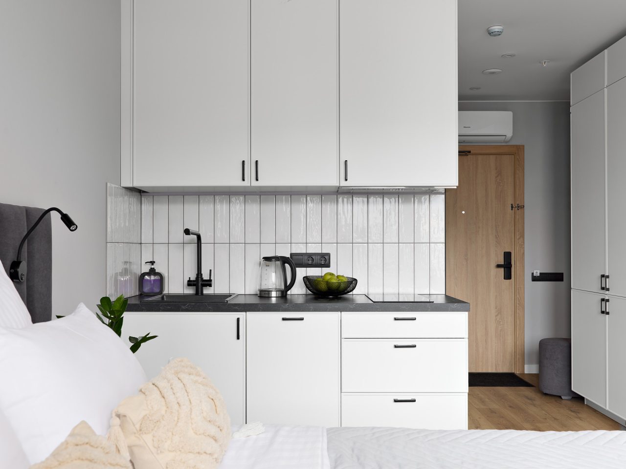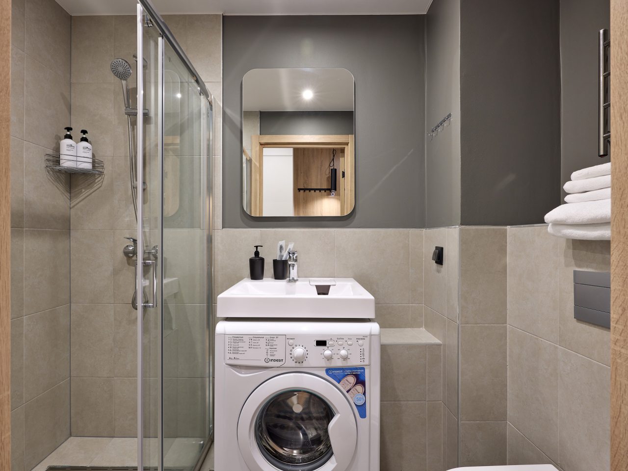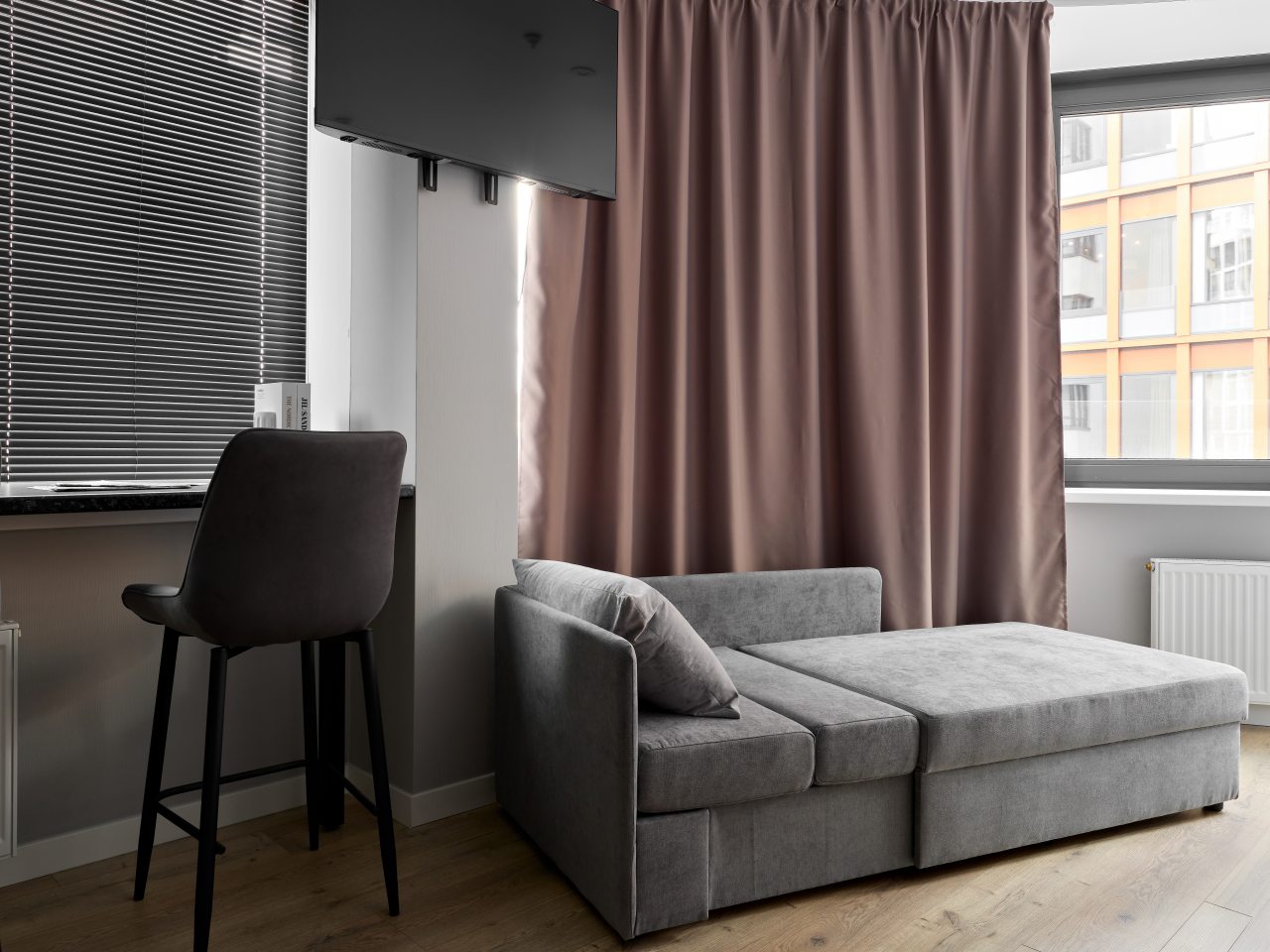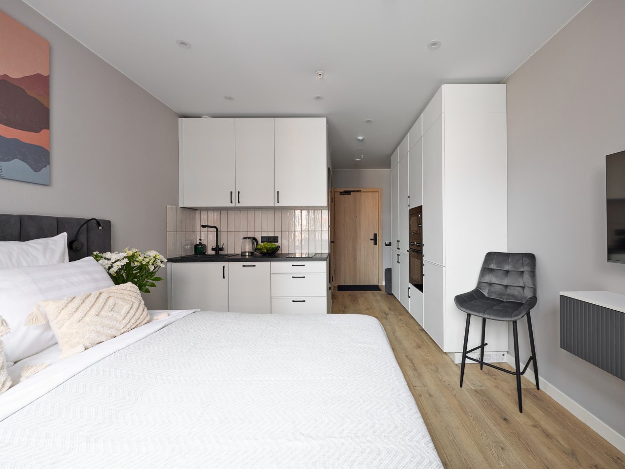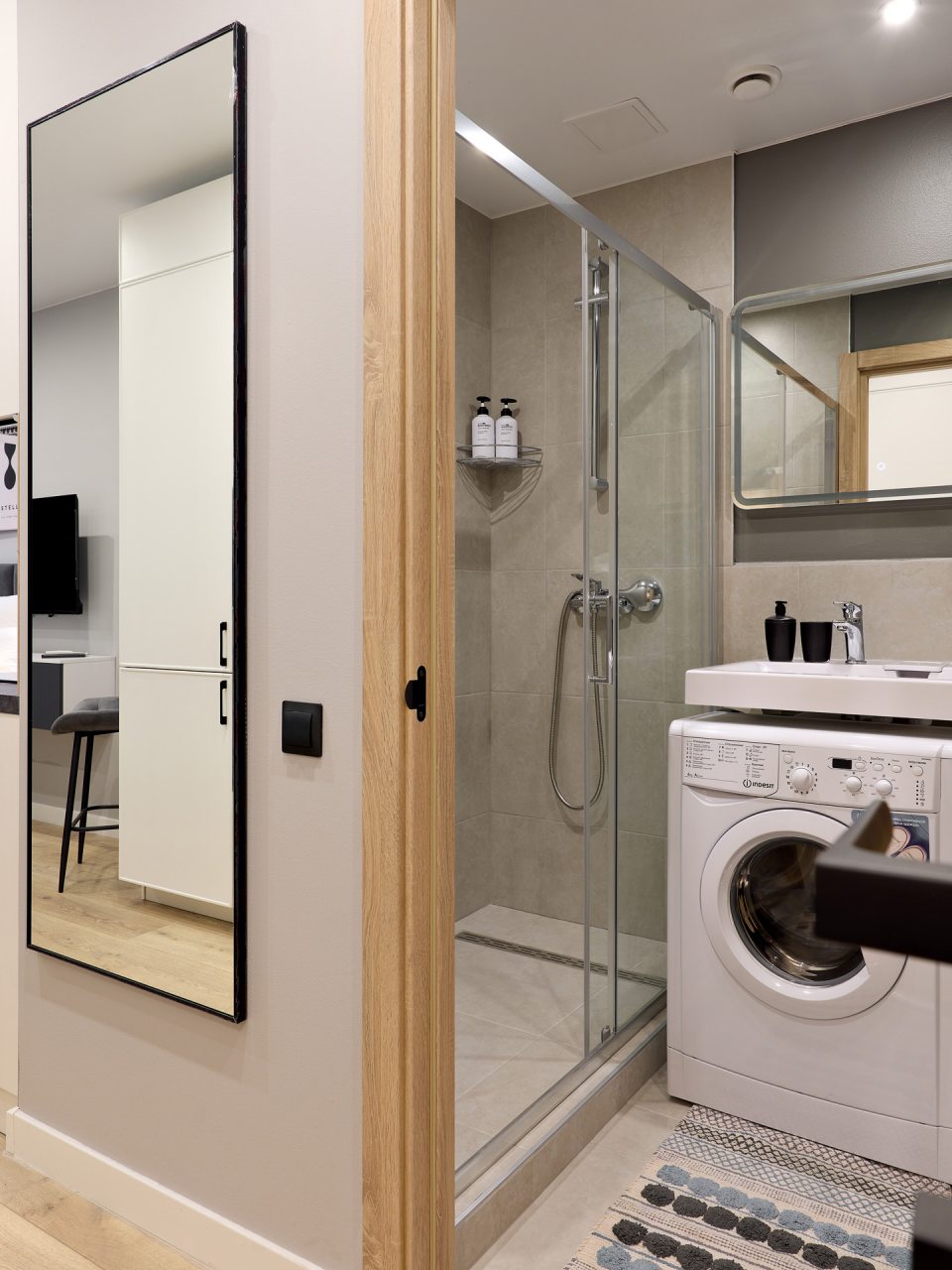 Внутри вас ожидает стильный дизайн, удобная двуспальная кровать с мягким изголовьем, затемнённые шторы, широкий подоконник, который может выступать рабочей и обеденной зоной, зеркало, сплит-система, ЖК-телевизор, а также санузел с необходимыми туалетно-косметическими средствами и стиральной машиной.