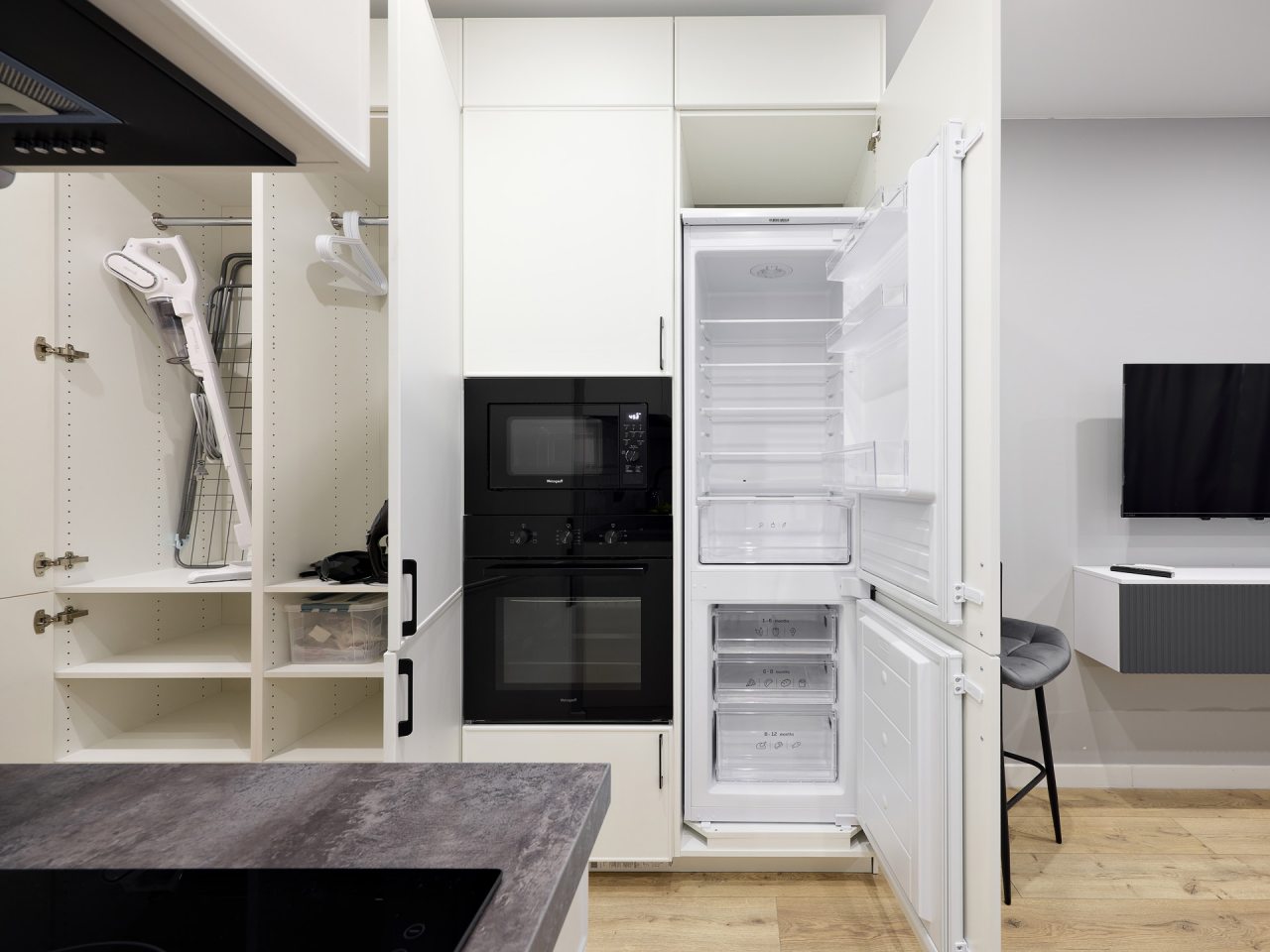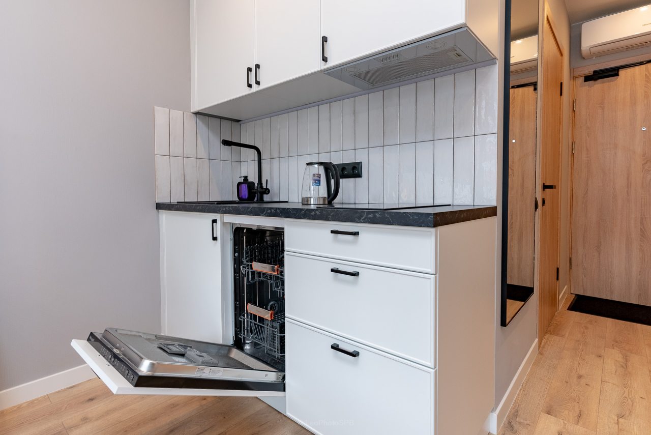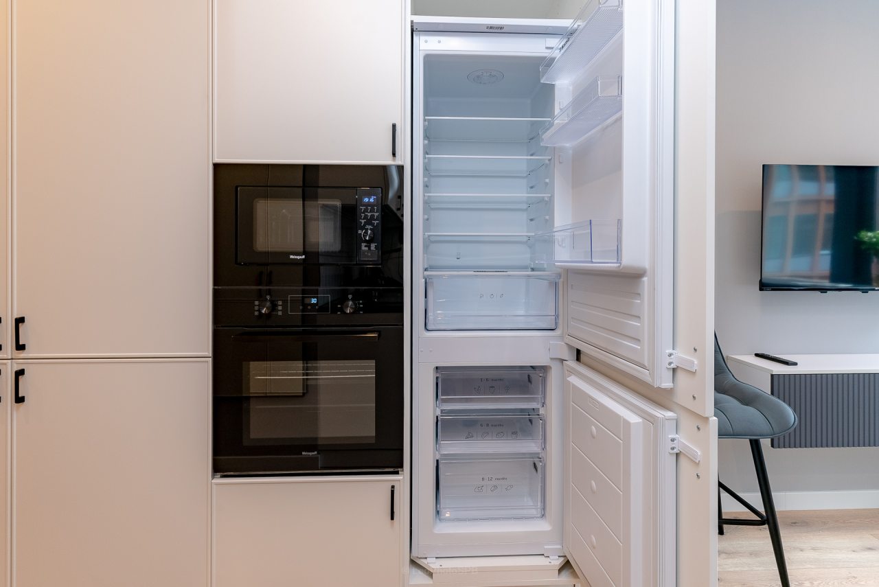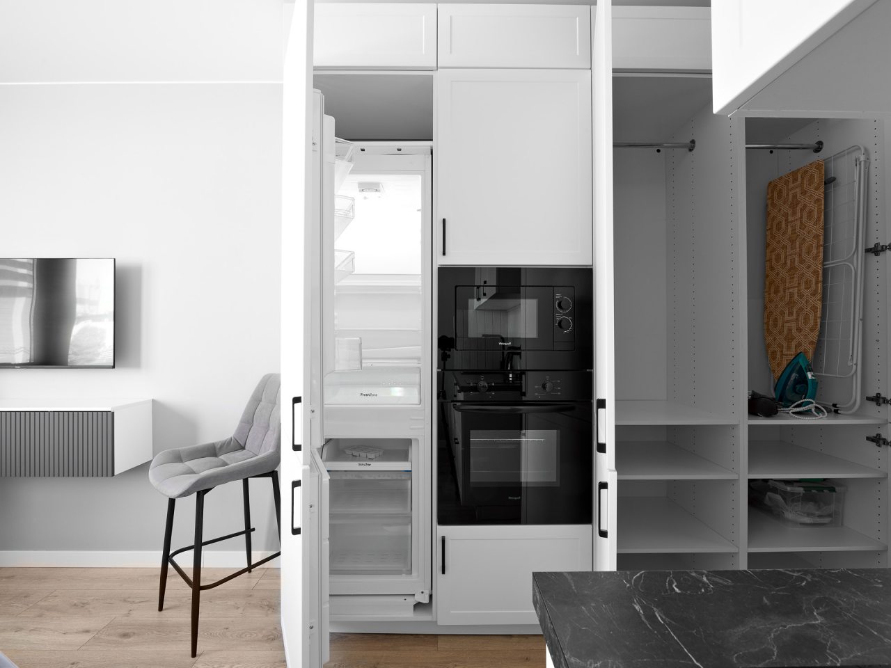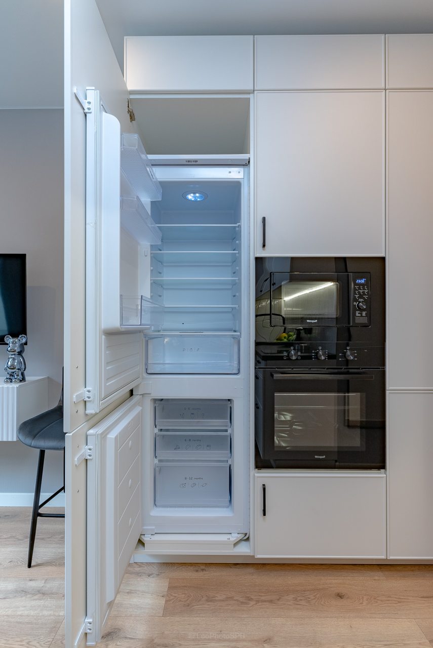 Кухонная зона порадует вас наличием посудомоечной машины, варочной панели, большого холодильника, духового шкафа, СВЧ-печи и электрического чайника, благодаря чему вы сможете приготовить абсолютно любое блюдо.