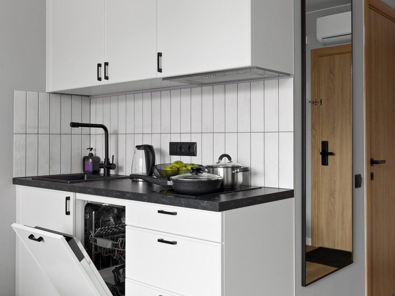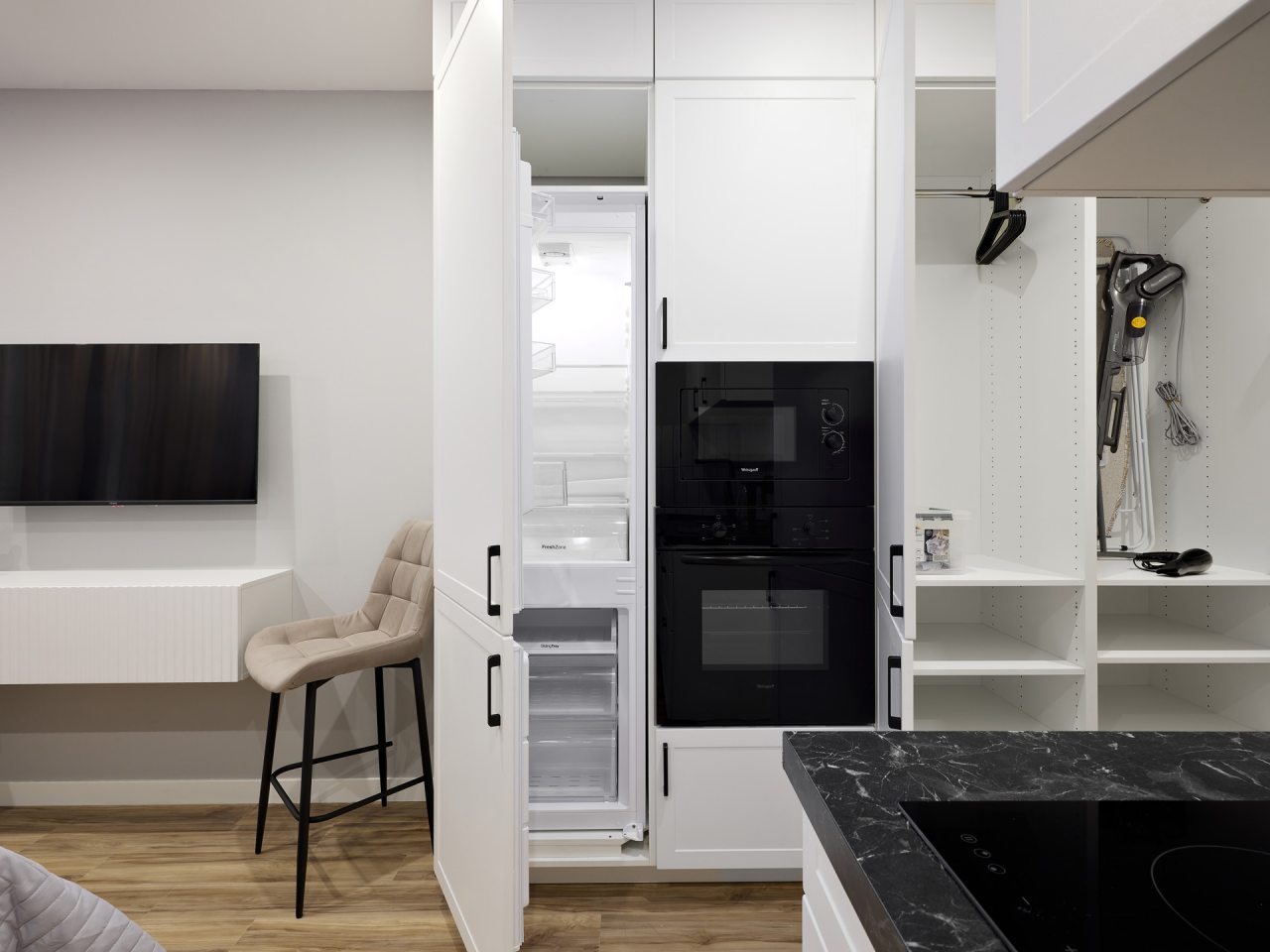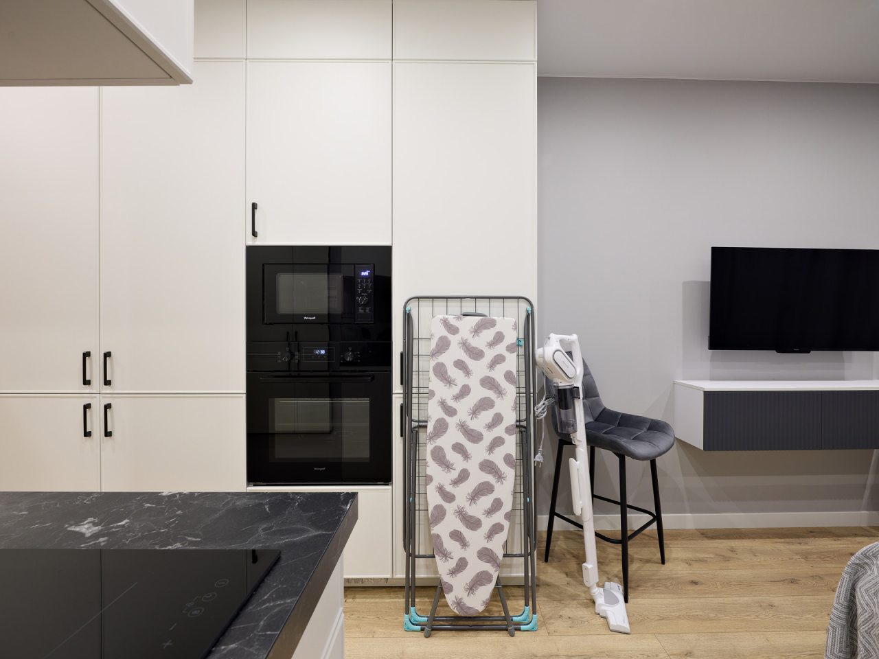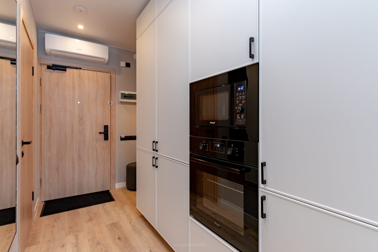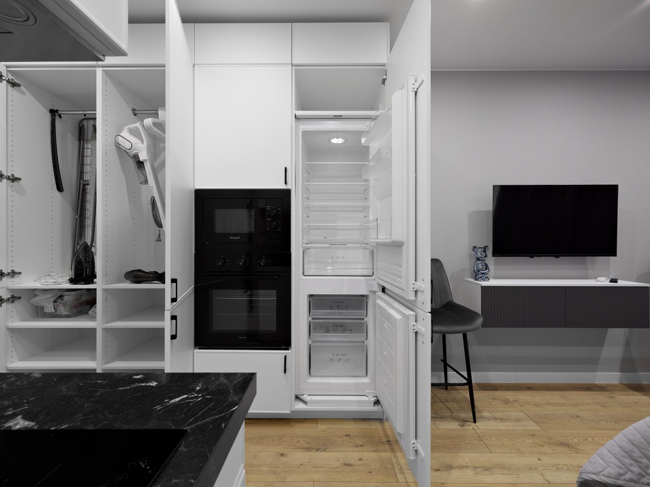 Кухонная зона порадует вас наличием посудомоечной машины, варочной панели, большого холодильника, духового шкафа, СВЧ-печи и электрического чайника, благодаря чему вы сможете приготовить абсолютно любое блюдо.