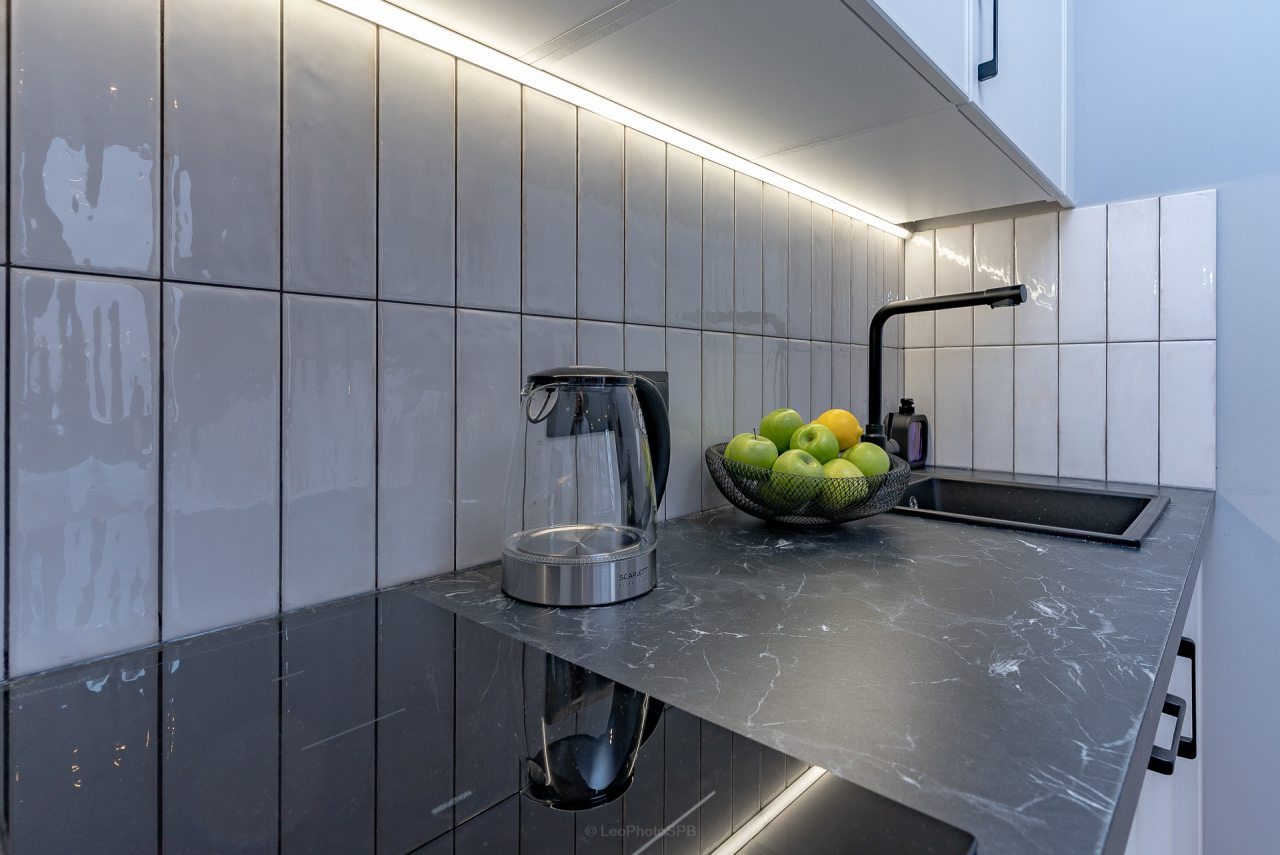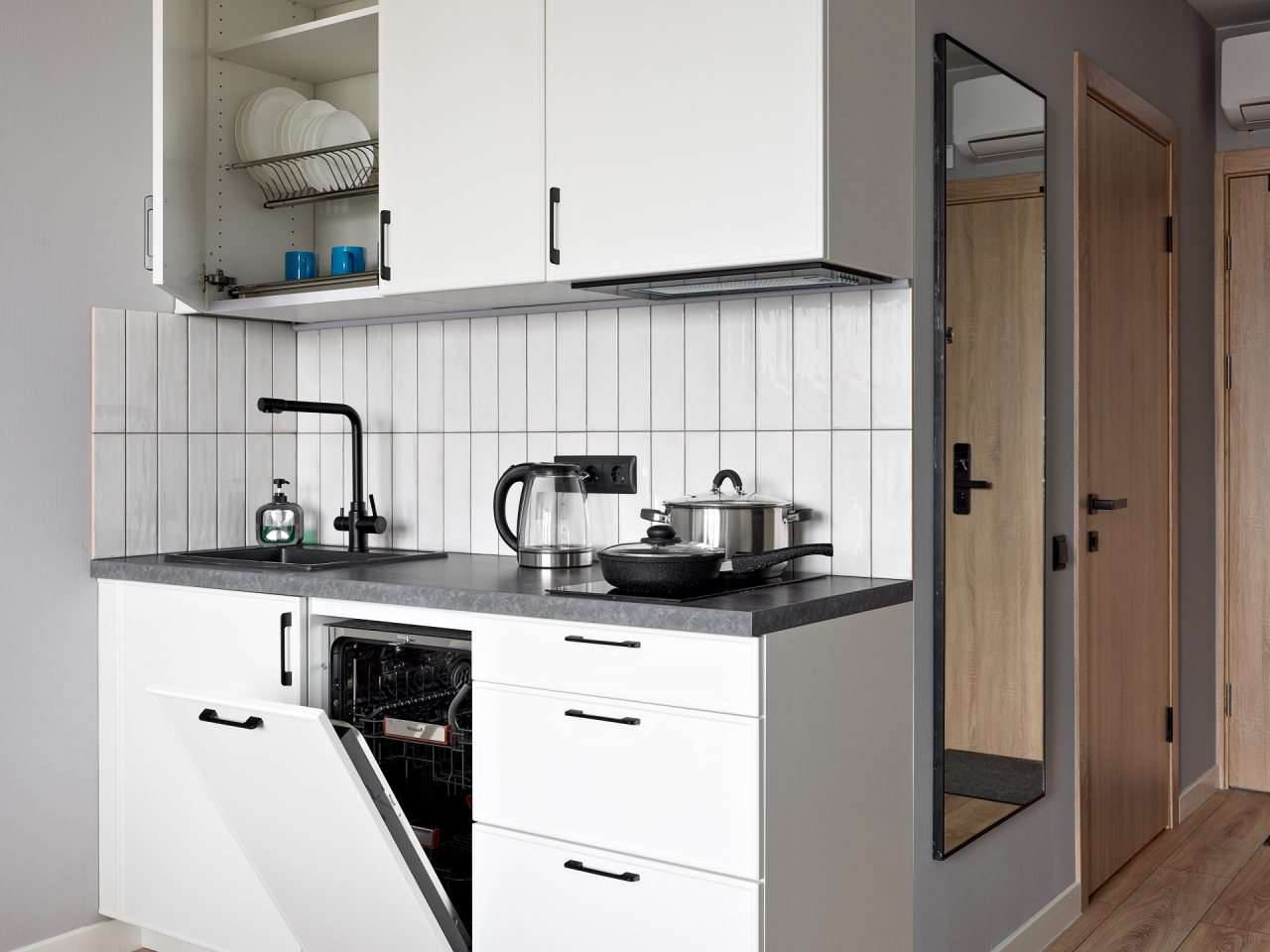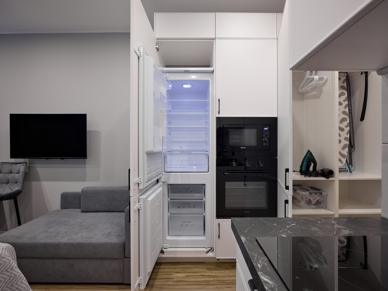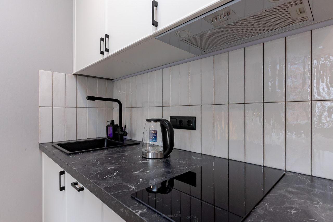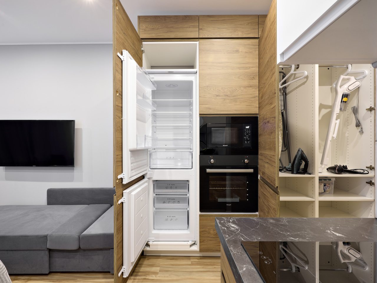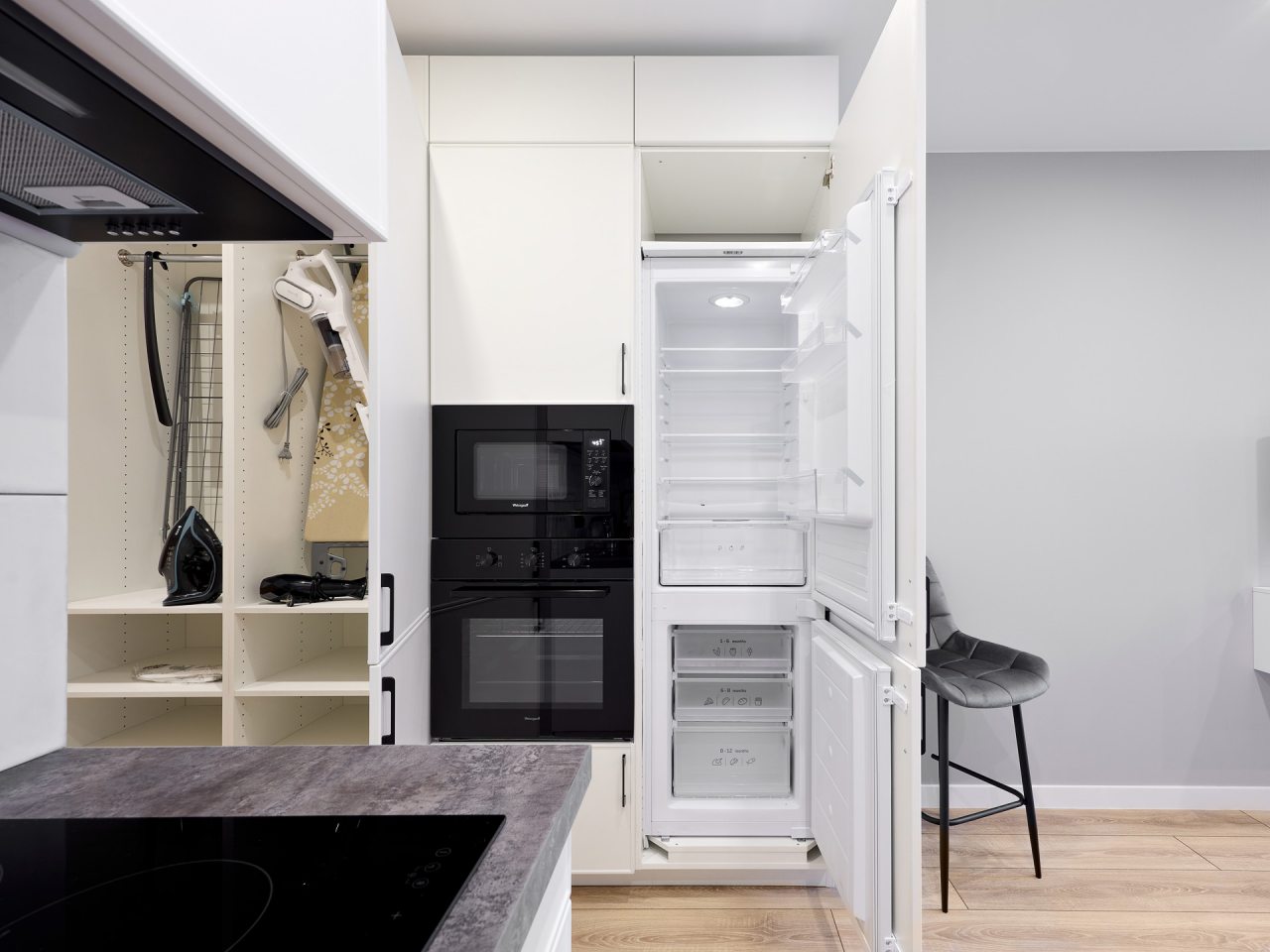 Кухонная зона порадует вас наличием посудомоечной машины, варочной панели, большого холодильника, духового шкафа, СВЧ-печи и электрического чайника, благодаря чему вы сможете приготовить абсолютно любое блюдо.