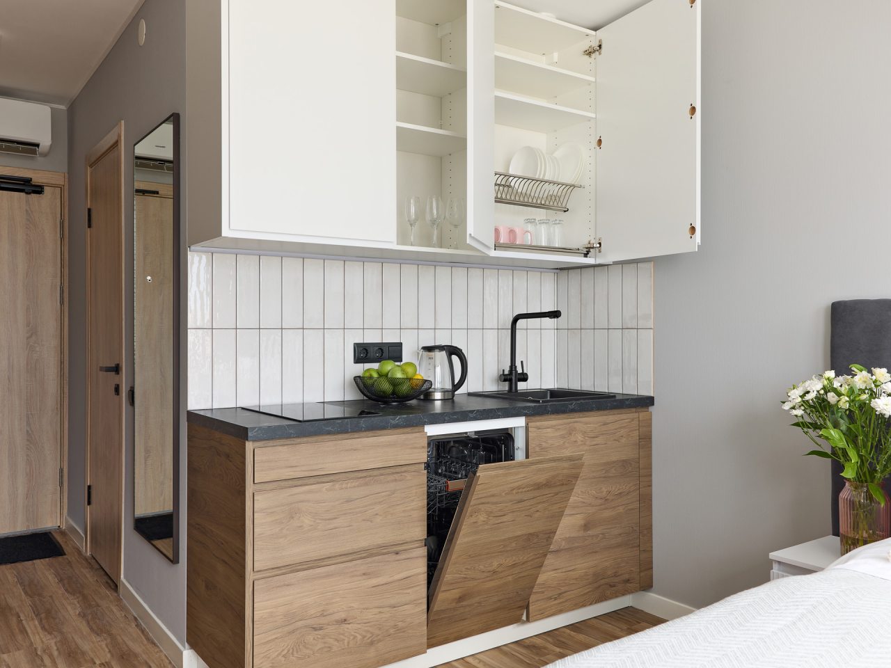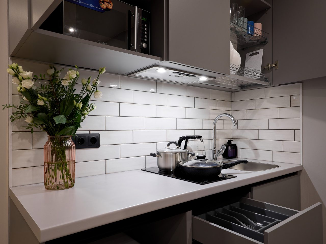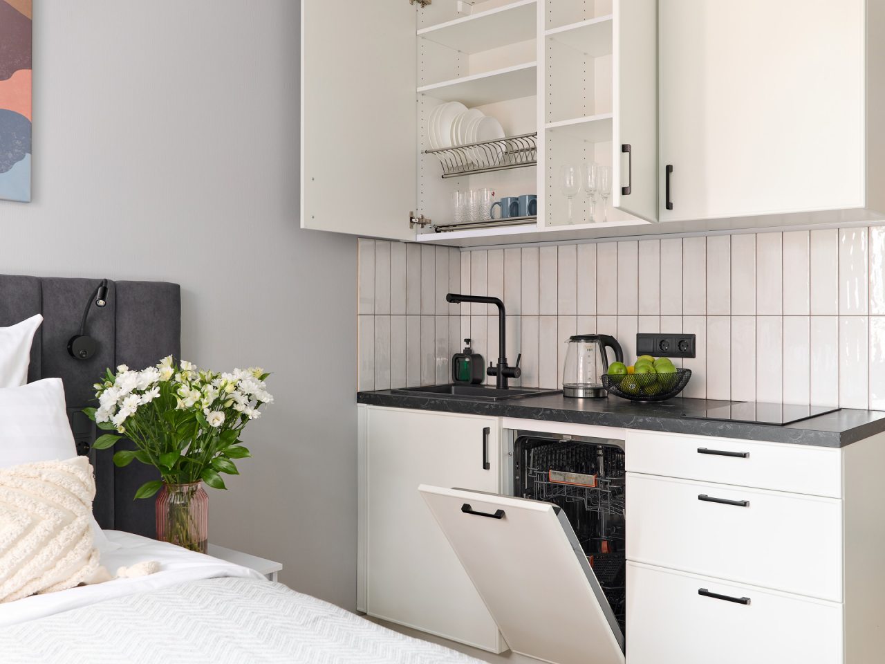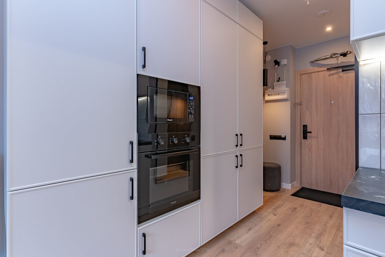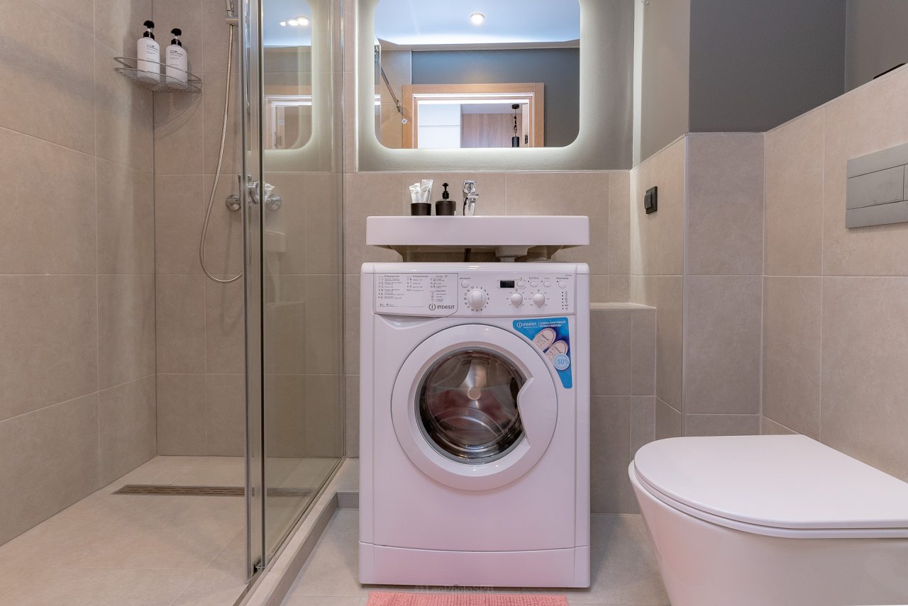 Кухонная зона порадует вас наличием посудомоечной машины, варочной панели, большого холодильника, духового шкафа, СВЧ-печи и электрического чайника, благодаря чему вы сможете приготовить абсолютно любое блюдо.