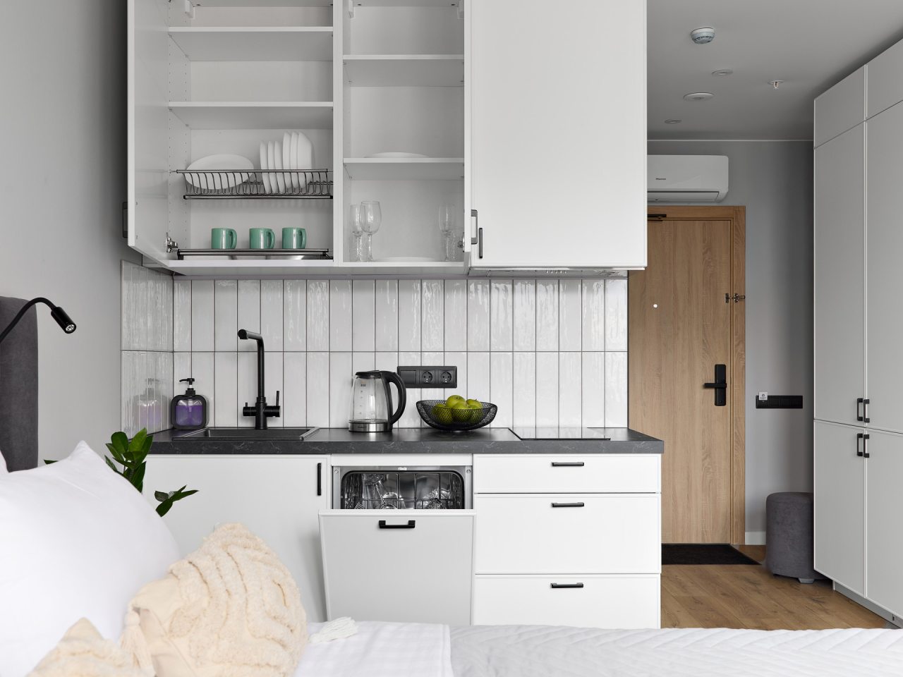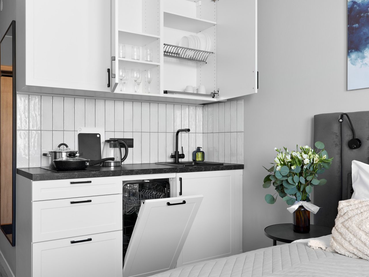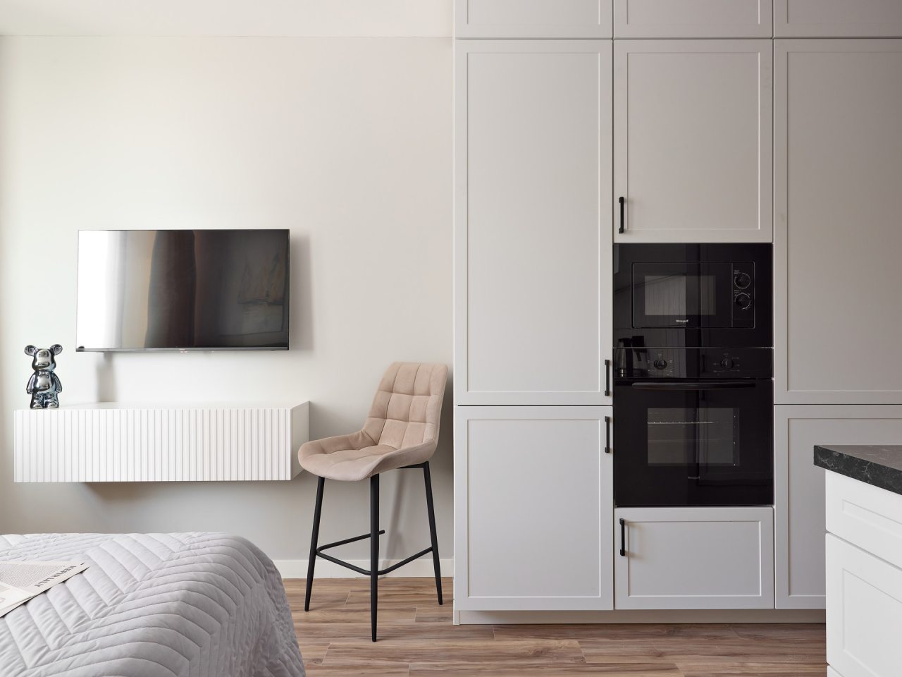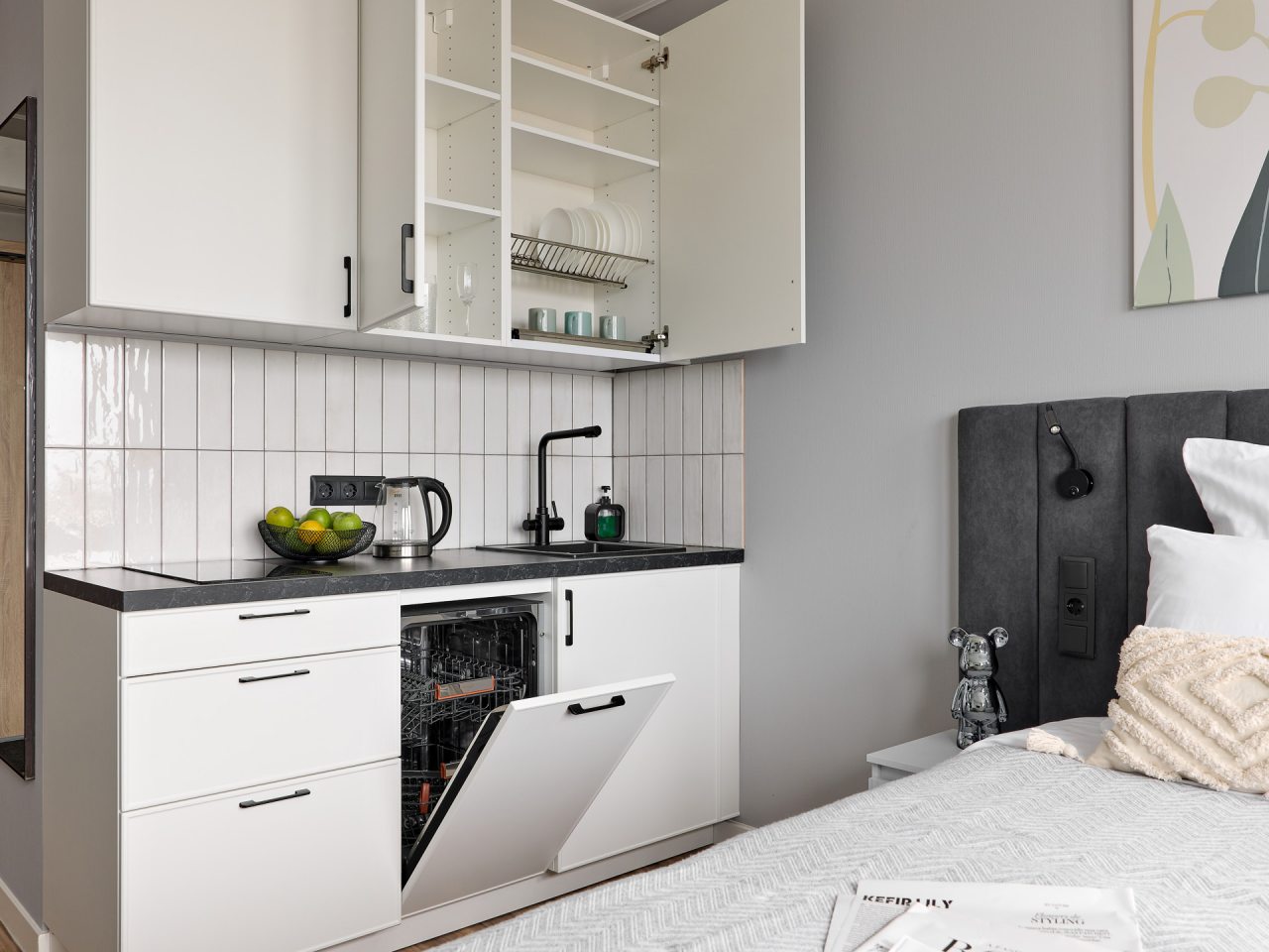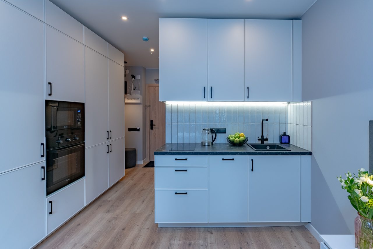 Кухонная зона порадует вас наличием посудомоечной машины, варочной панели, большого холодильника, духового шкафа, СВЧ-печи и электрического чайника, благодаря чему вы сможете приготовить абсолютно любое блюдо.