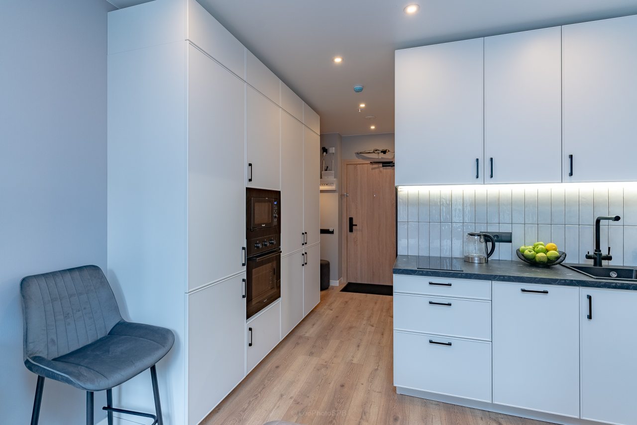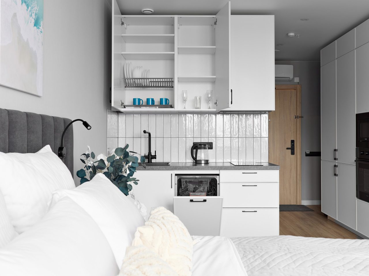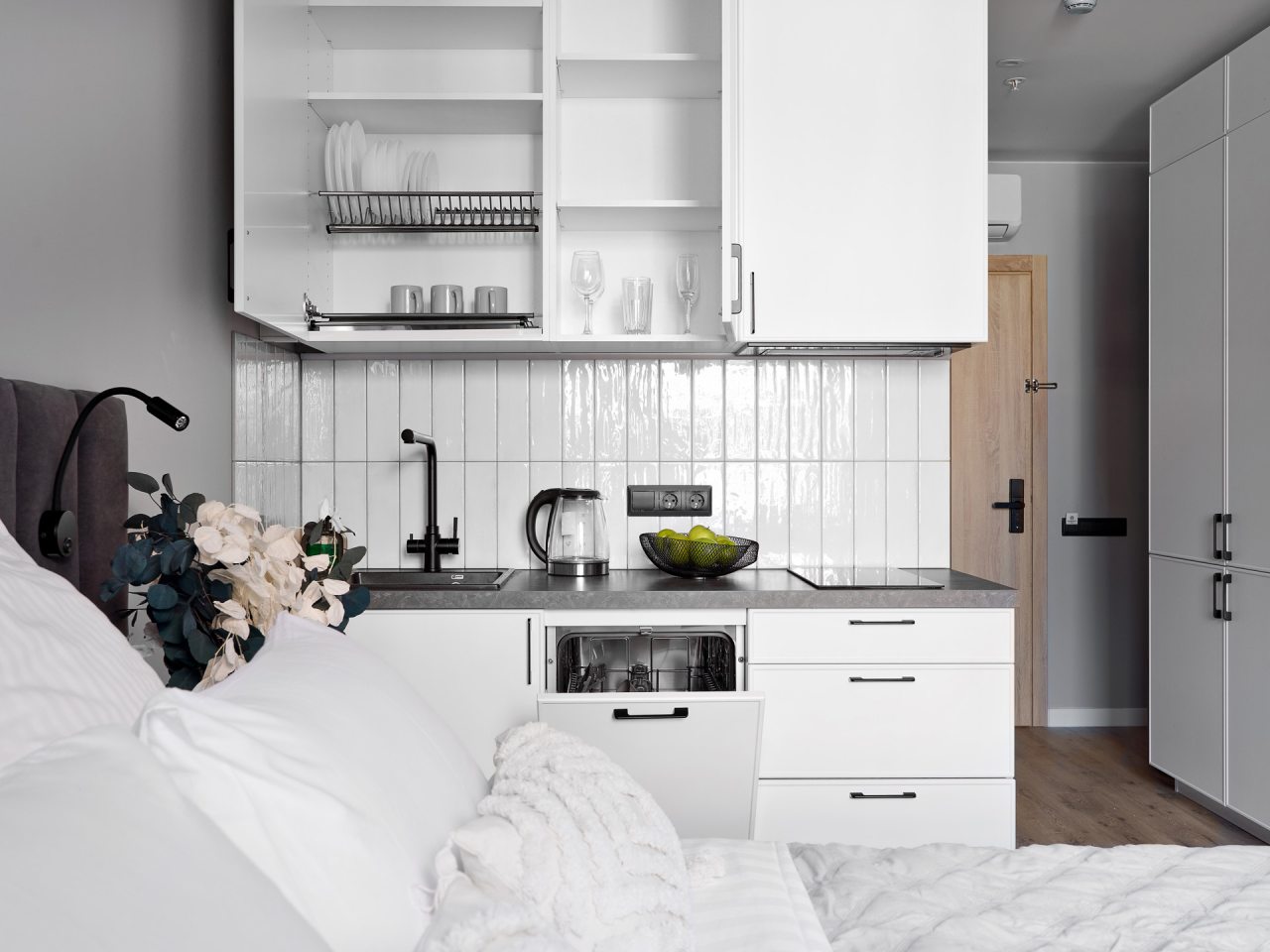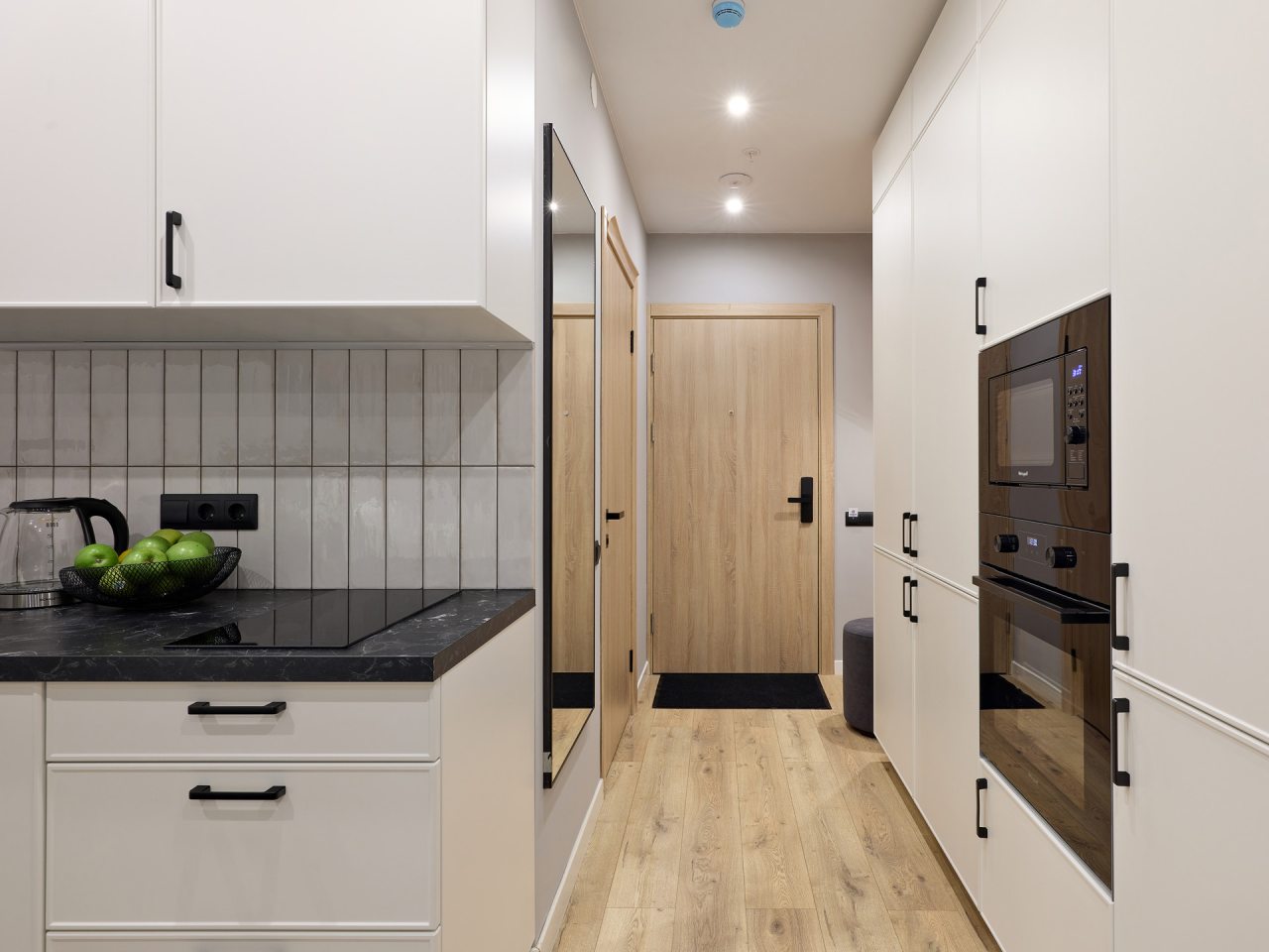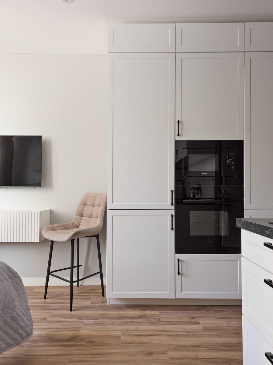 Кухонная зона порадует вас наличием посудомоечной машины, варочной панели, большого холодильника, духового шкафа, СВЧ-печи и электрического чайника, благодаря чему вы сможете приготовить абсолютно любое блюдо.