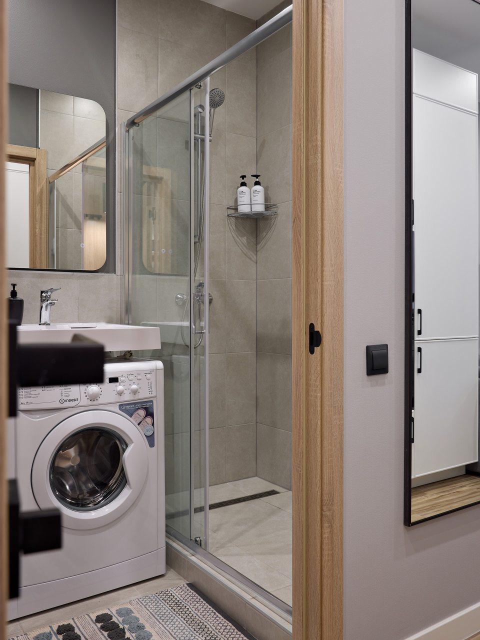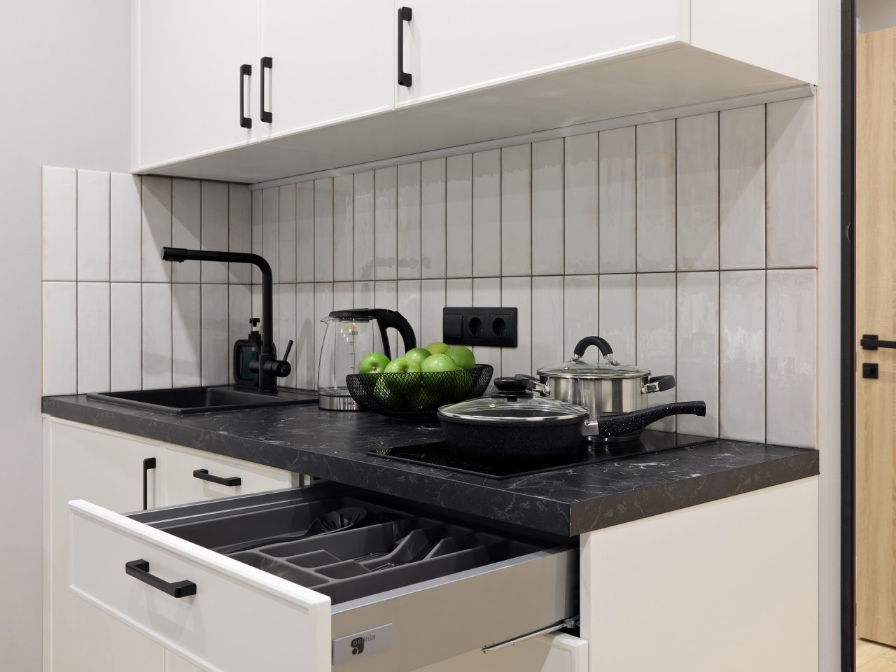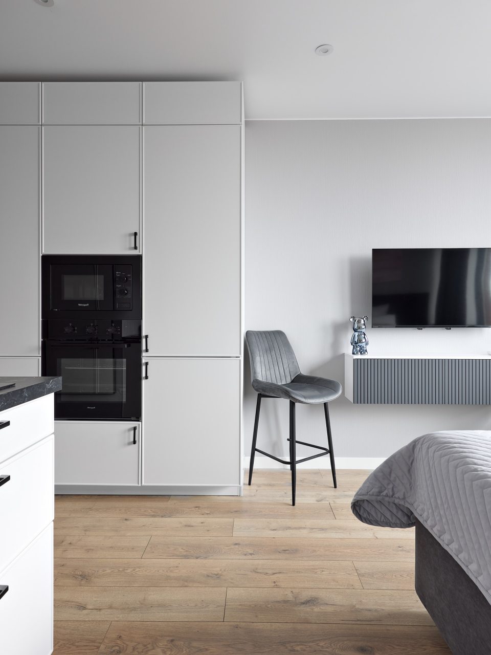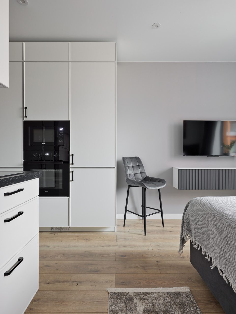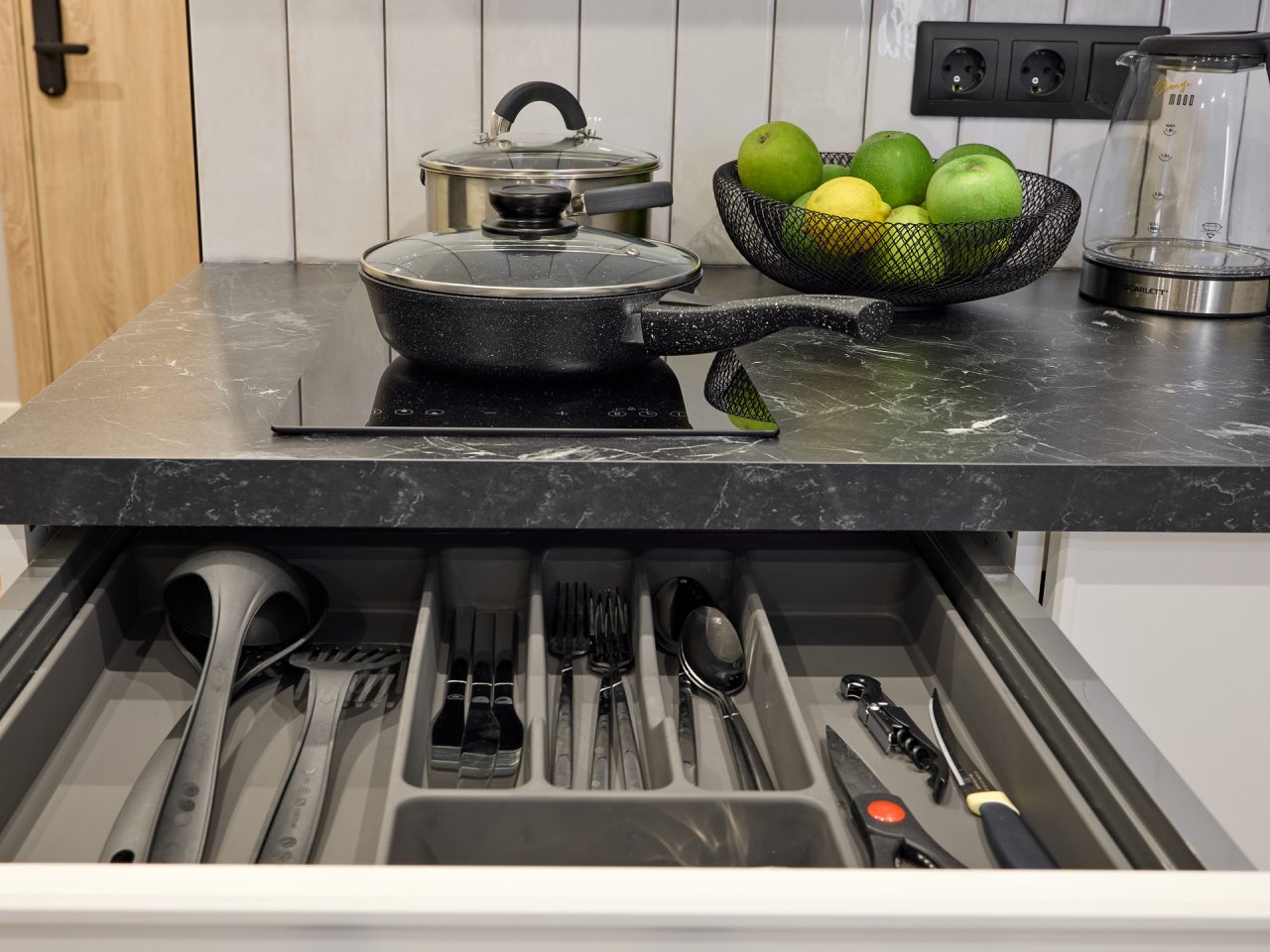 Кухонная зона порадует вас наличием посудомоечной машины, варочной панели, большого холодильника, духового шкафа, СВЧ-печи и электрического чайника, благодаря чему вы сможете приготовить абсолютно любое блюдо.