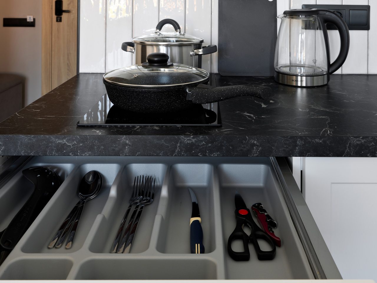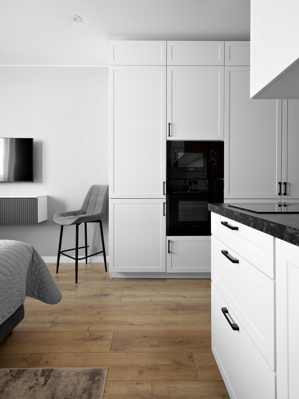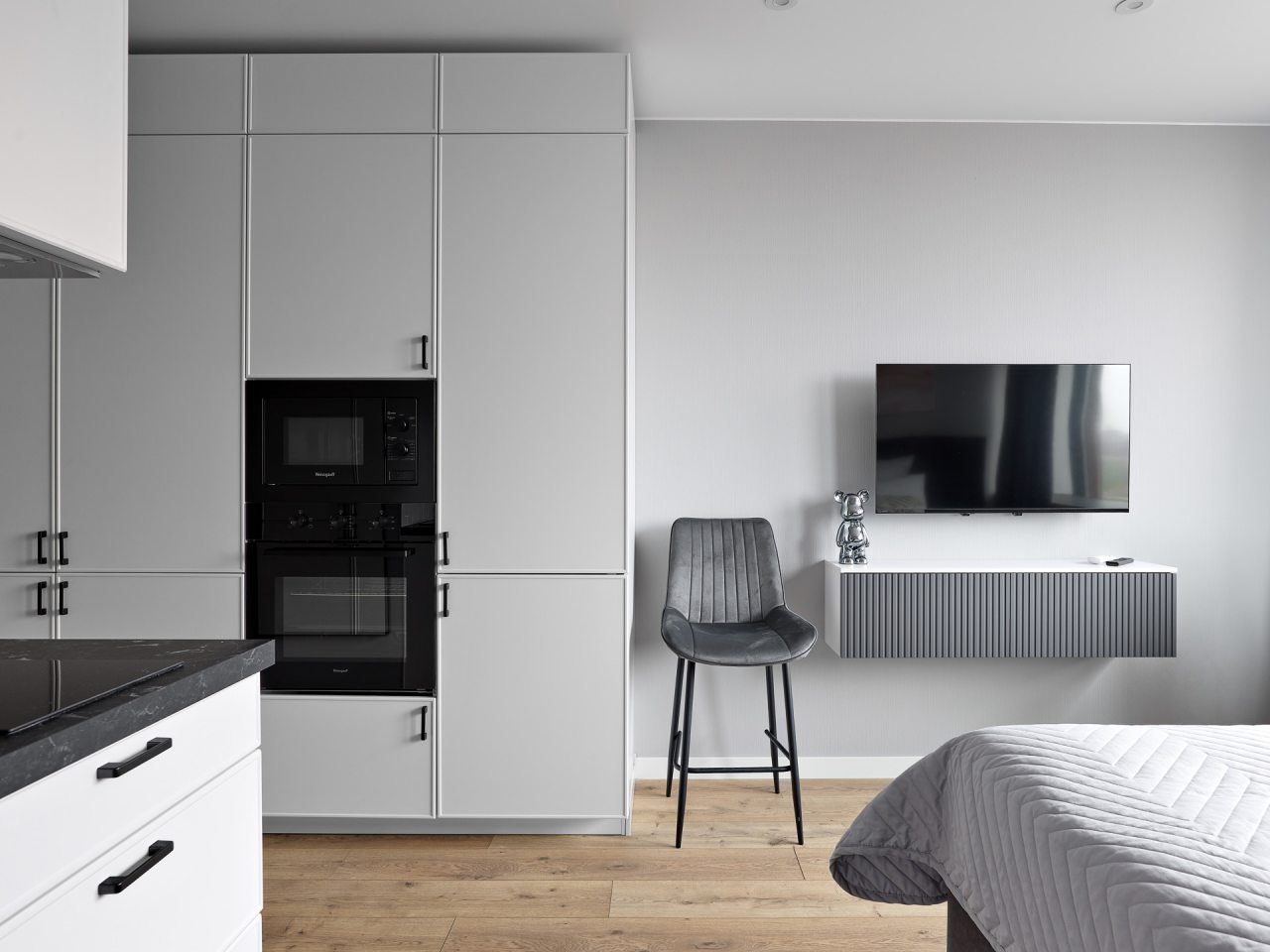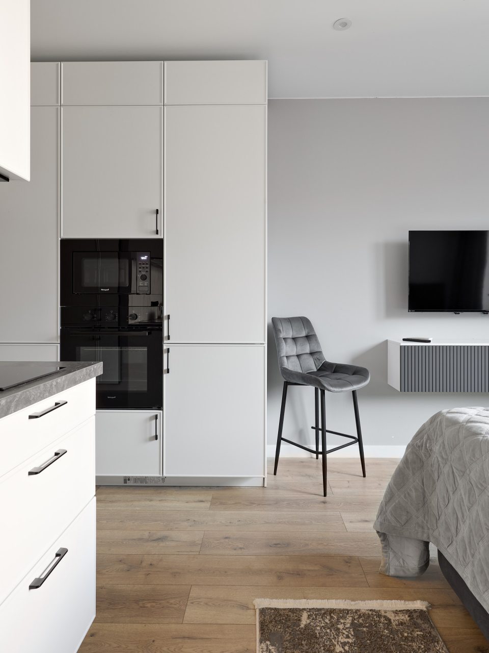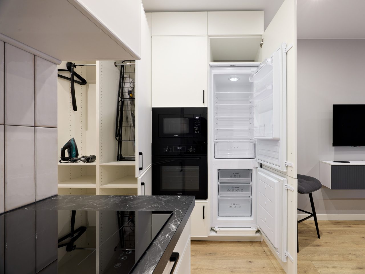 Кухонная зона порадует вас наличием посудомоечной машины, варочной панели, большого холодильника, духового шкафа, СВЧ-печи и электрического чайника, благодаря чему вы сможете приготовить абсолютно любое блюдо.