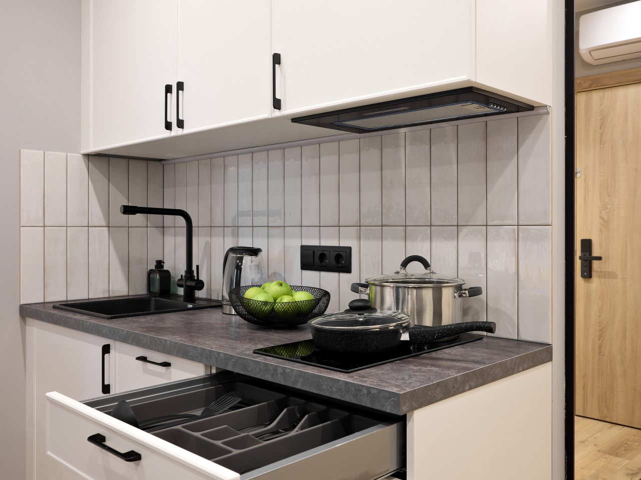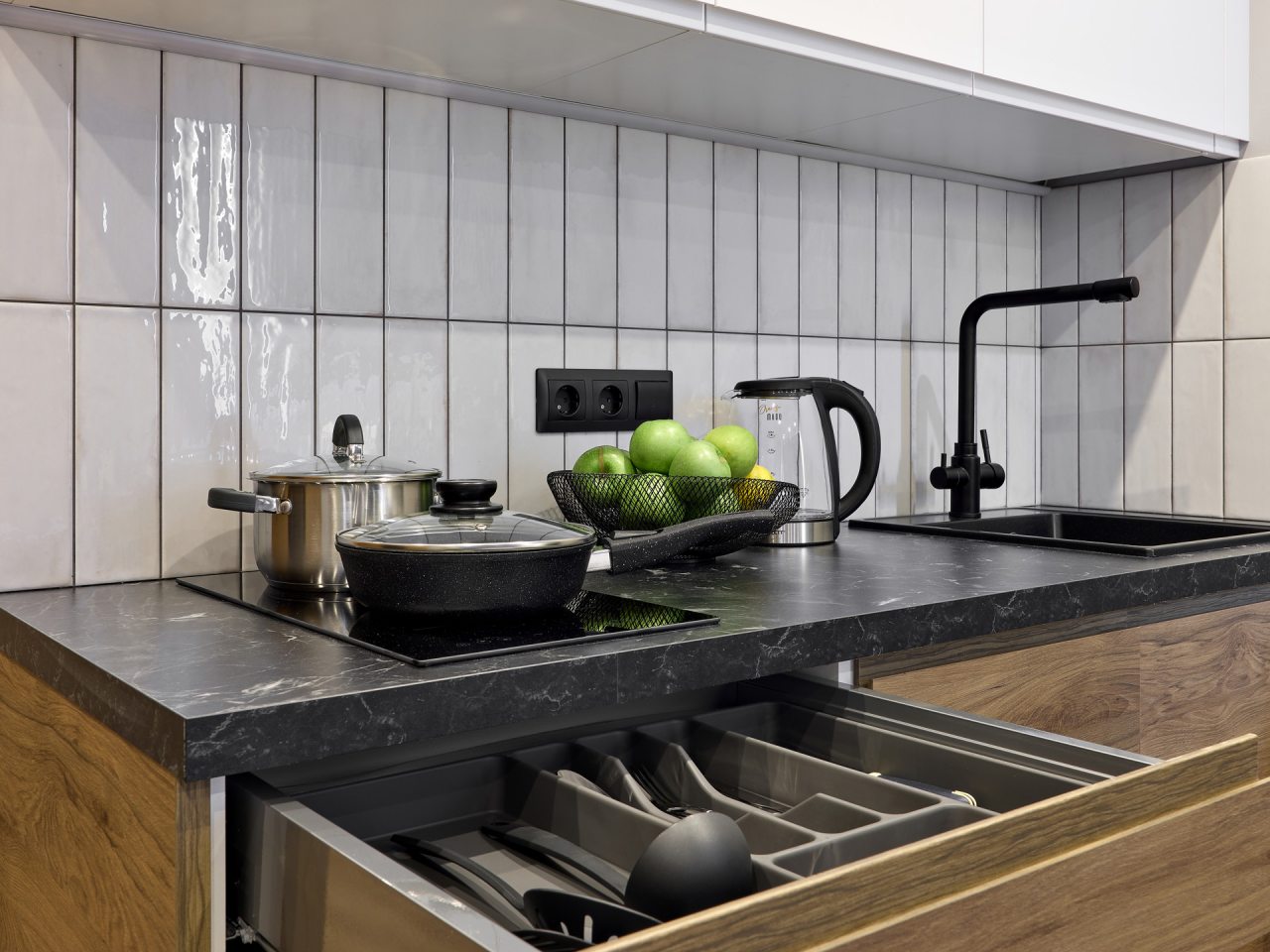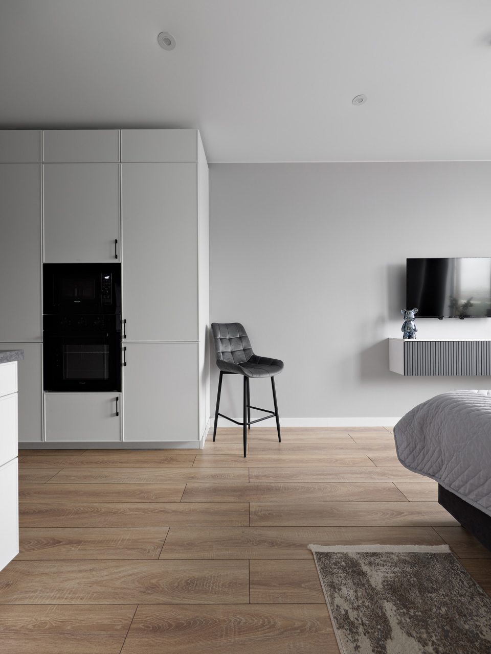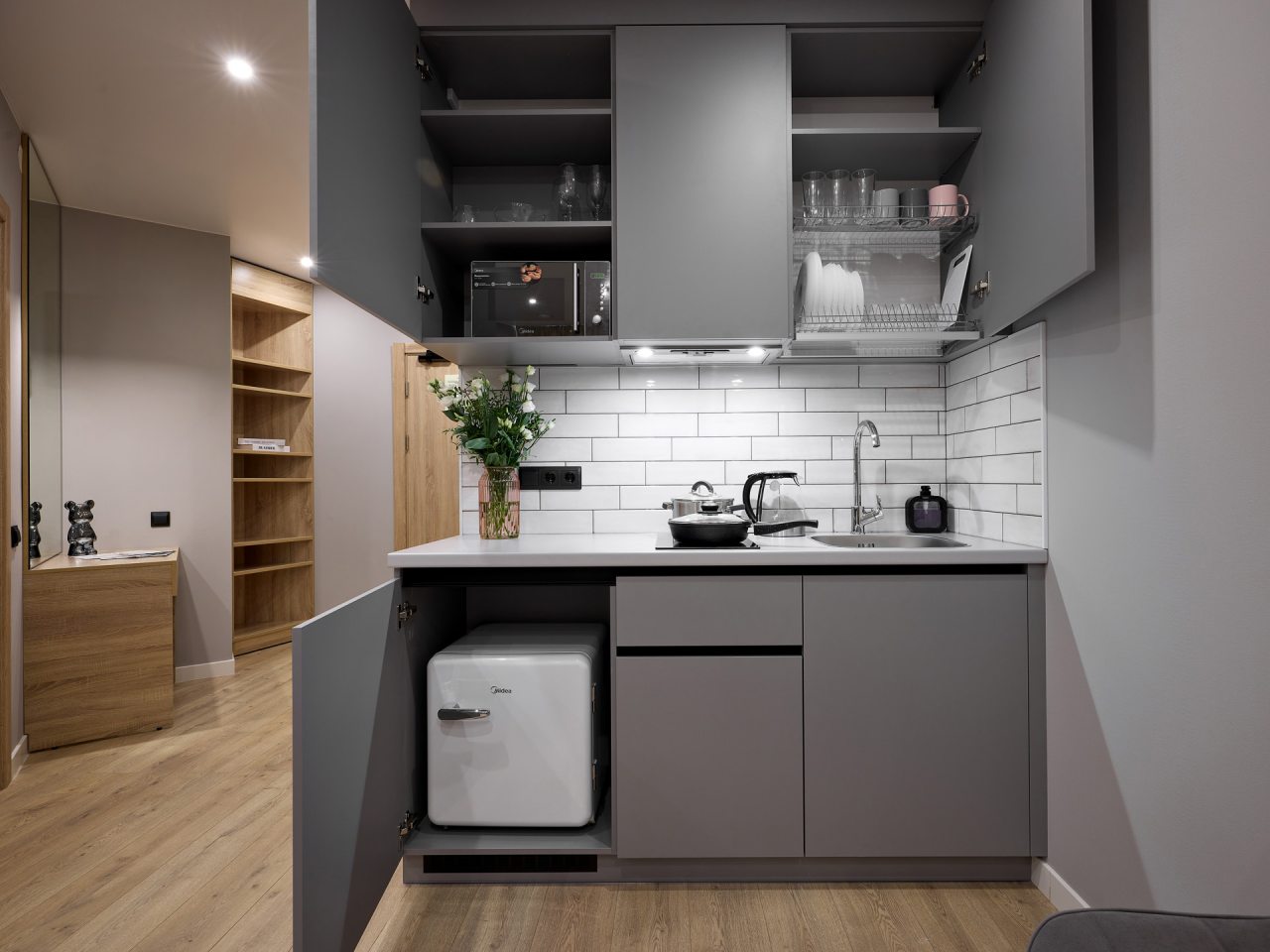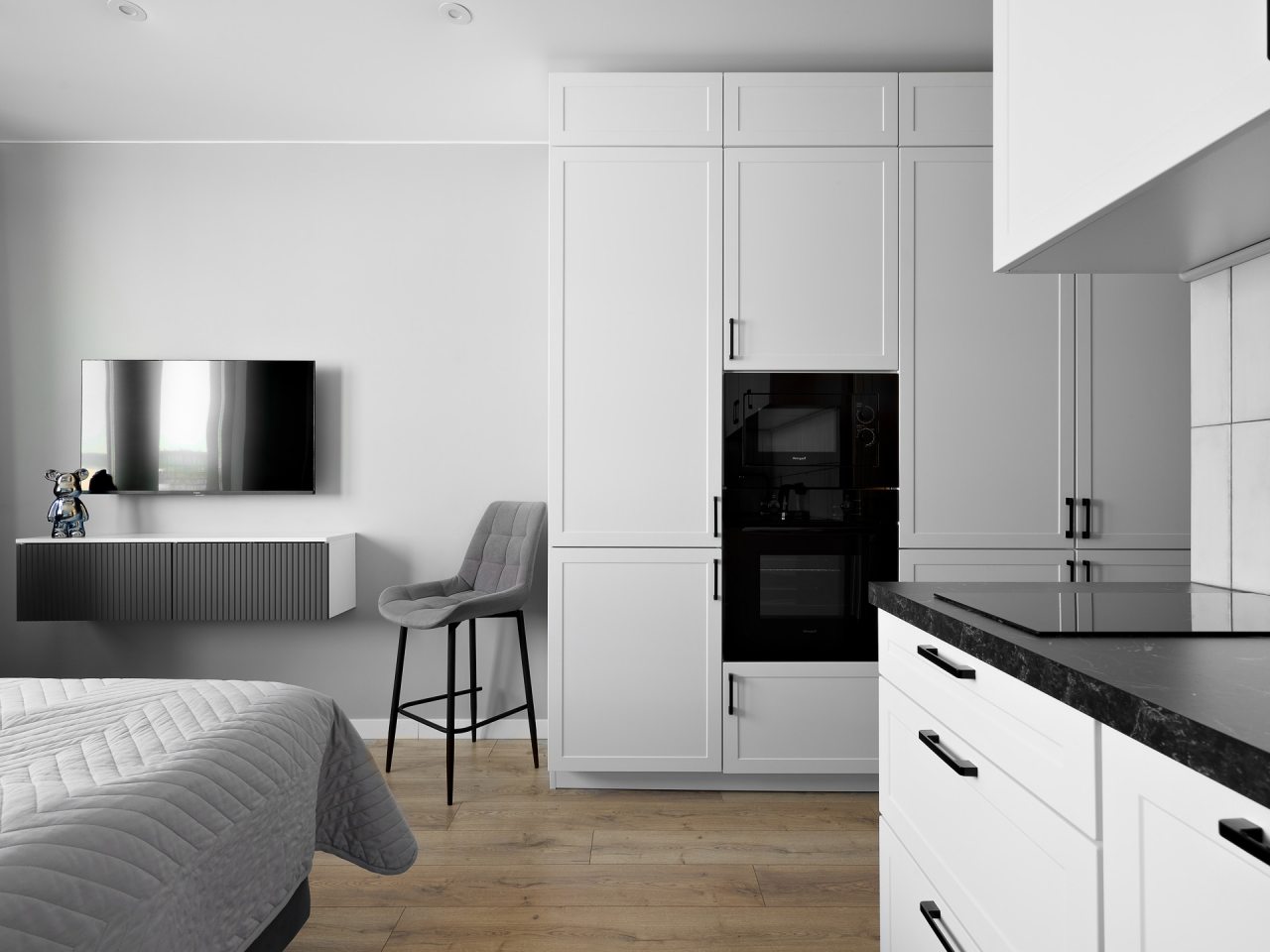 Кухонная зона порадует вас наличием посудомоечной машины, варочной панели, большого холодильника, духового шкафа, СВЧ-печи и электрического чайника, благодаря чему вы сможете приготовить абсолютно любое блюдо.