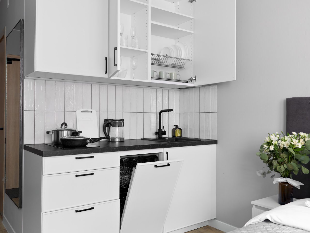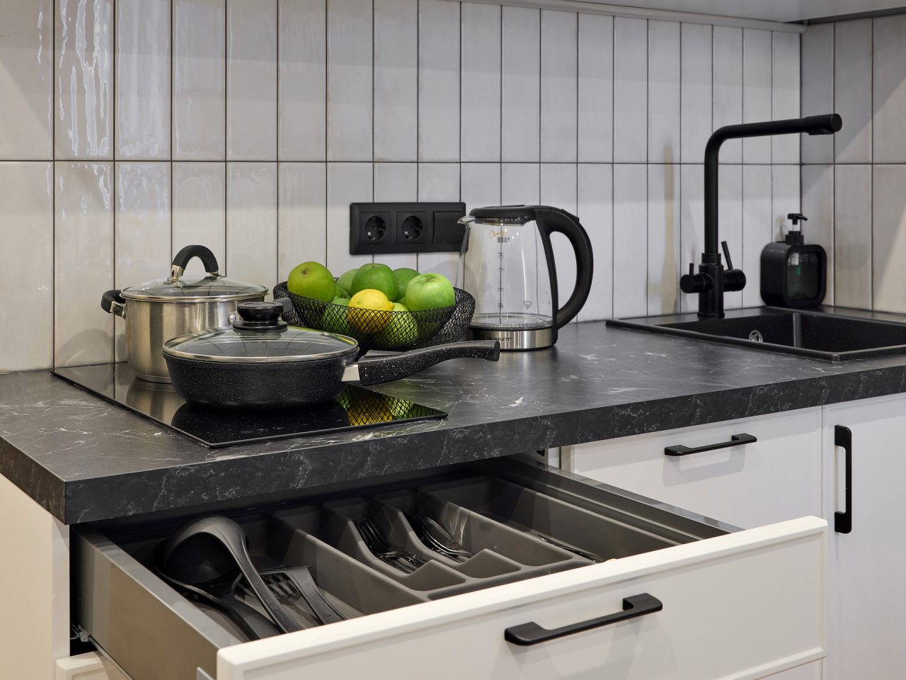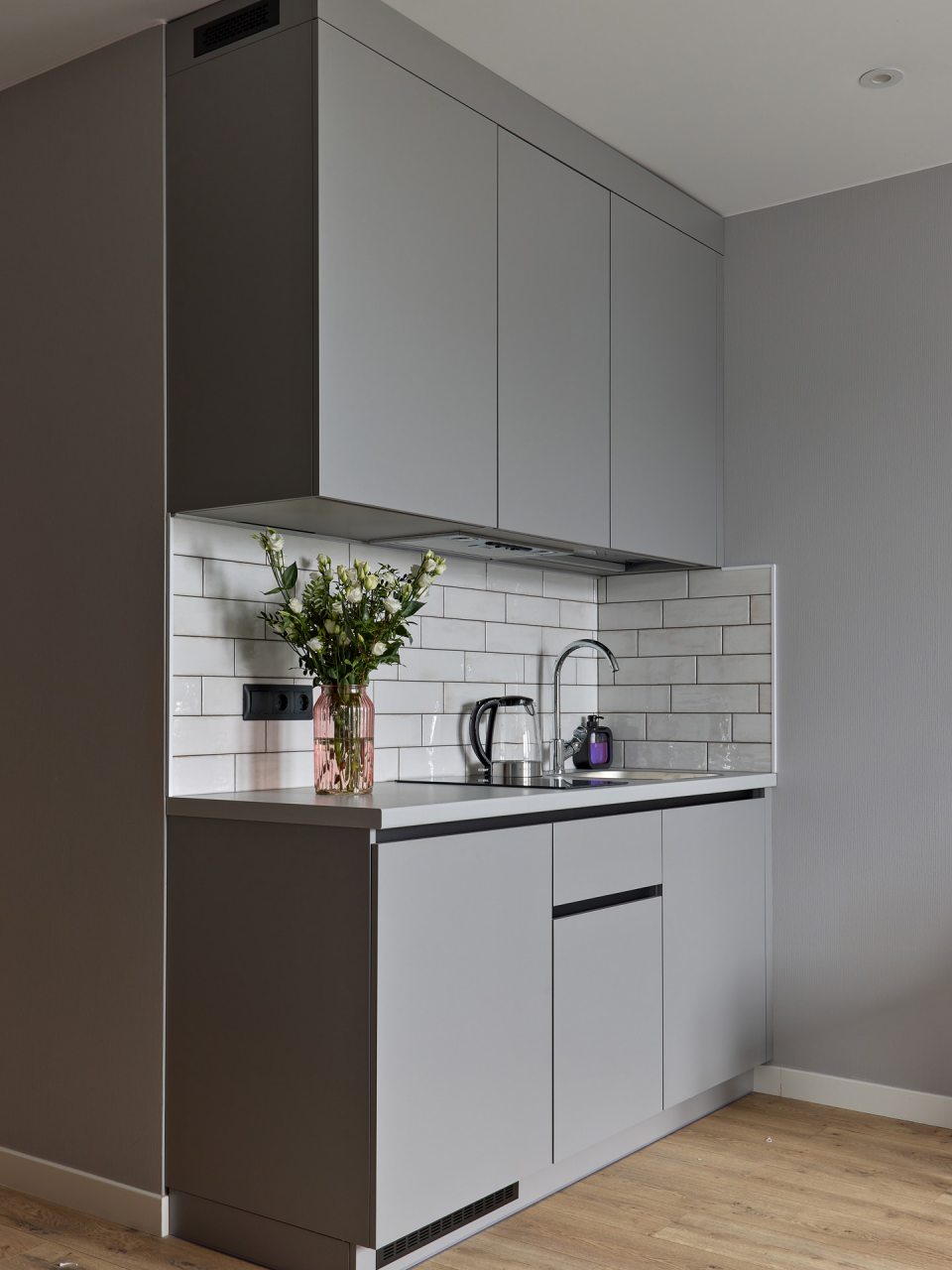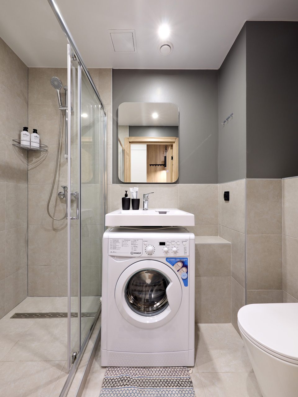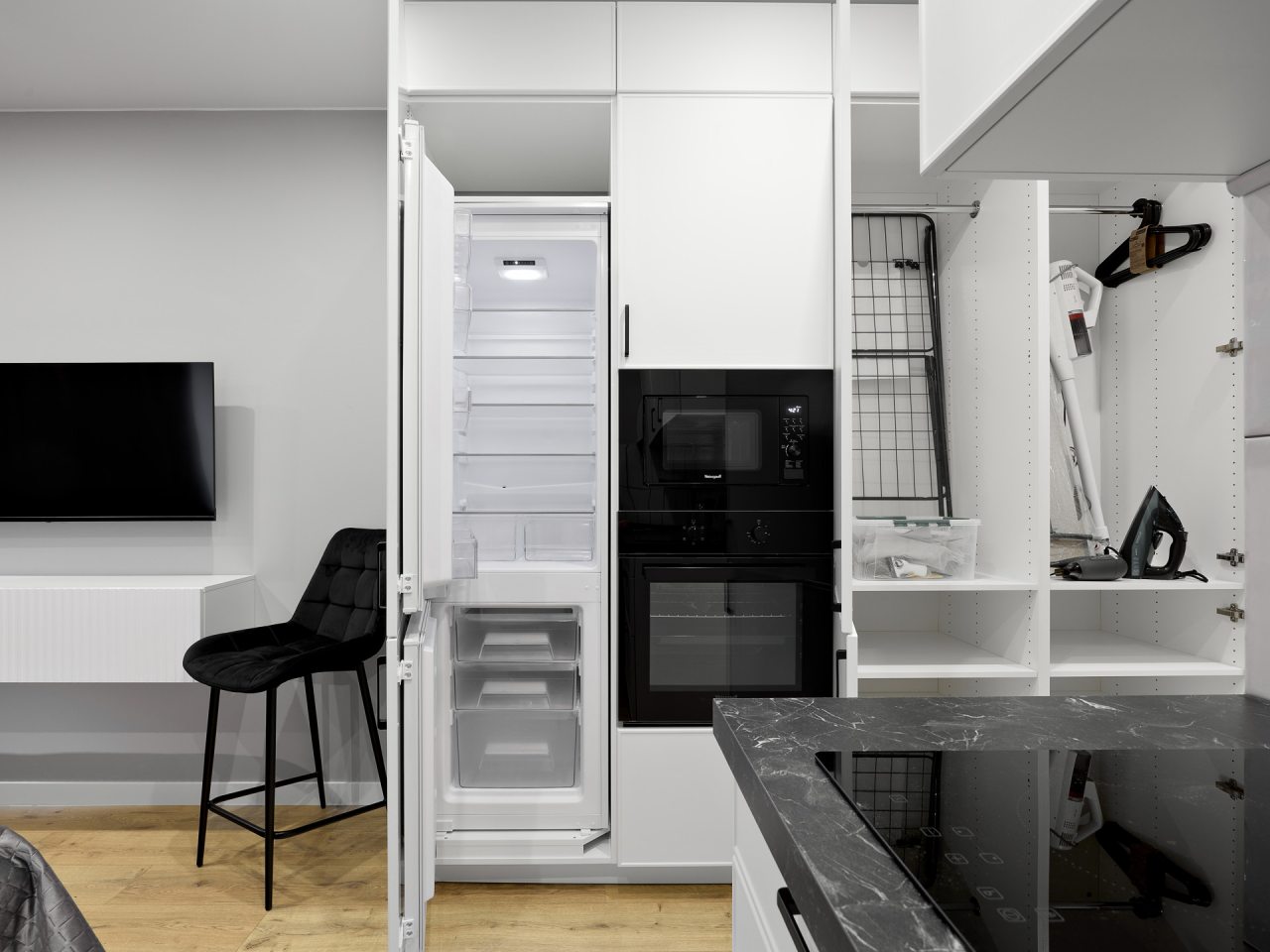 Кухонная зона порадует вас наличием посудомоечной машины, варочной панели, большого холодильника, духового шкафа, СВЧ-печи и электрического чайника, благодаря чему вы сможете приготовить абсолютно любое блюдо.