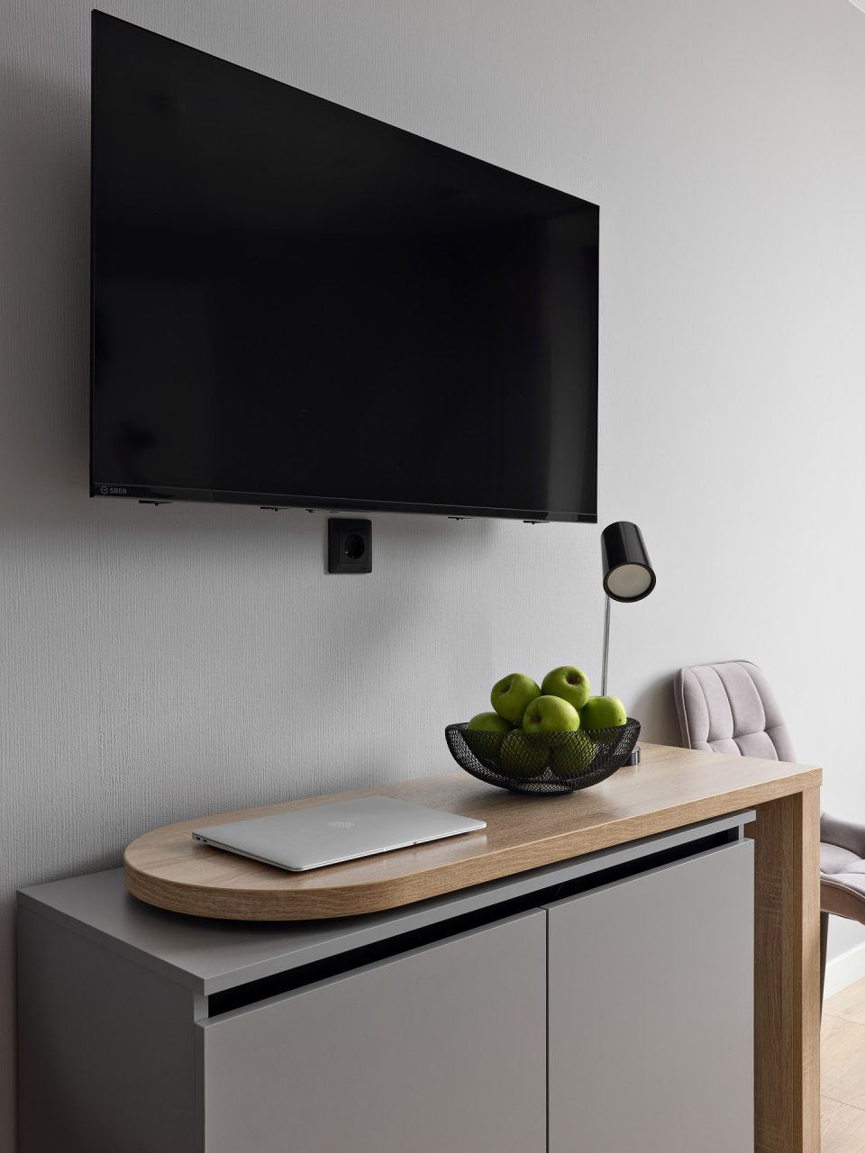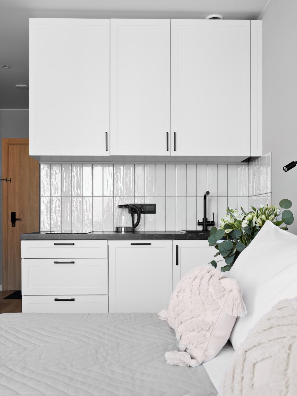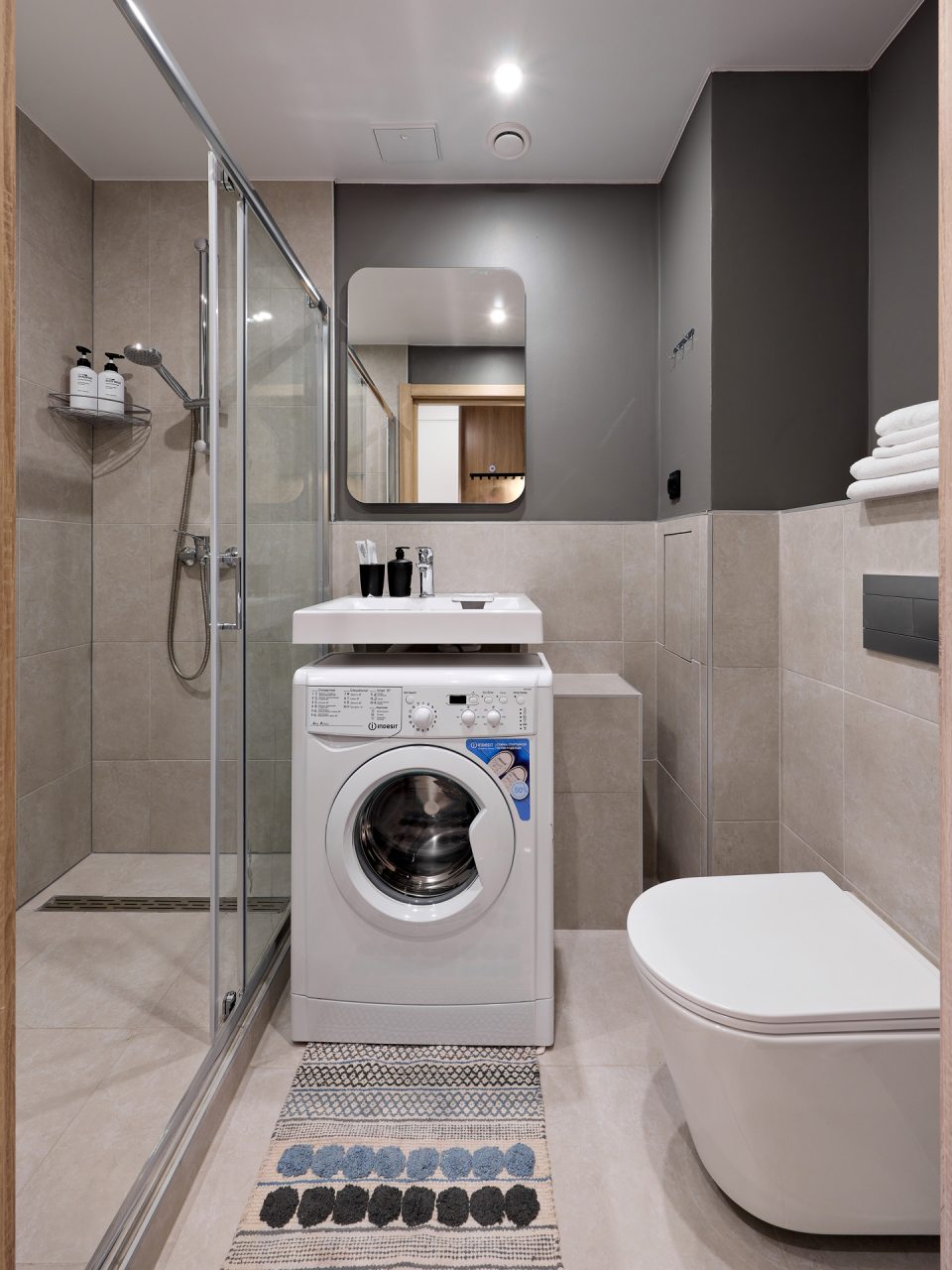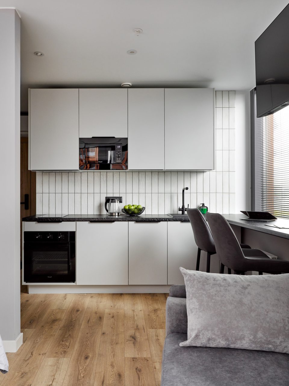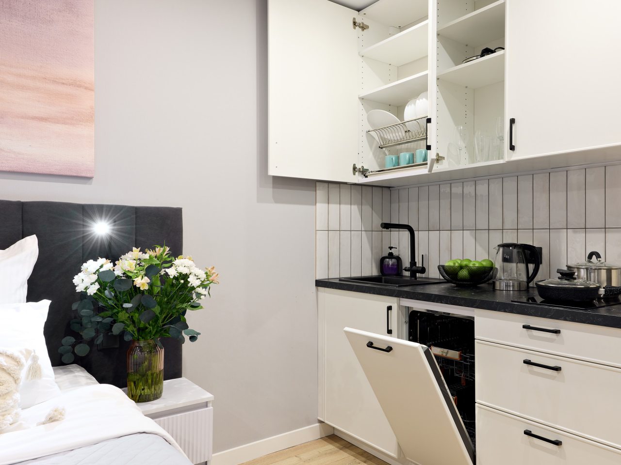 Кухонная зона порадует вас наличием посудомоечной машины, варочной панели, большого холодильника, духового шкафа, СВЧ-печи и электрического чайника, благодаря чему вы сможете приготовить абсолютно любое блюдо.