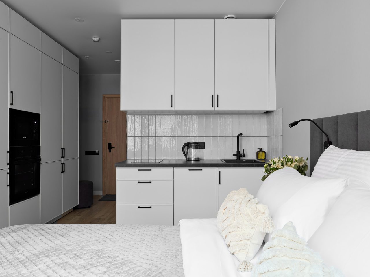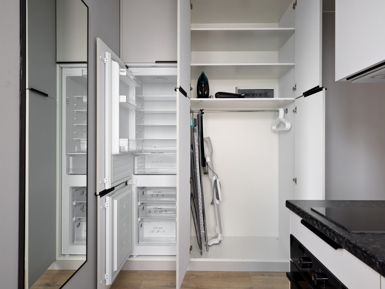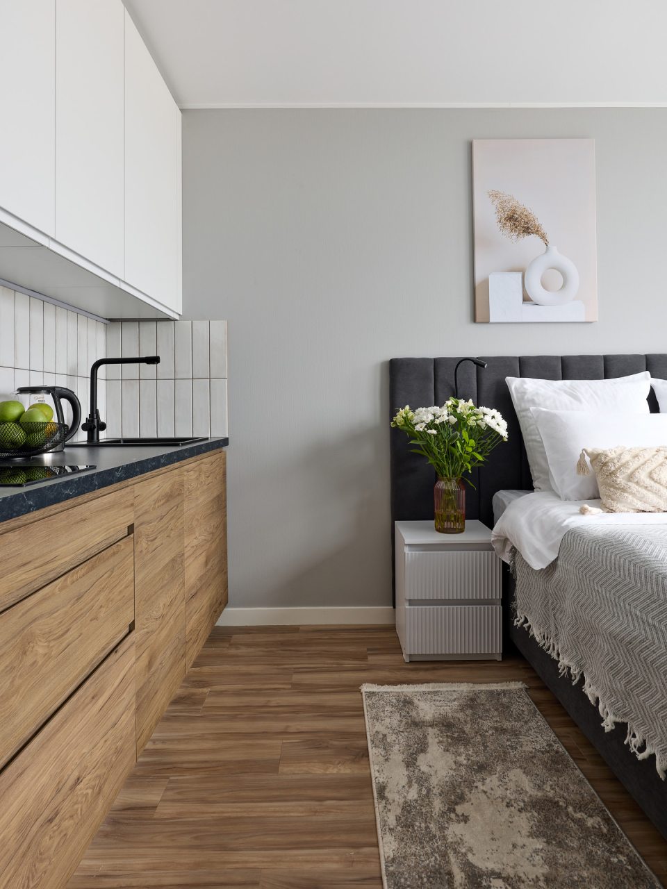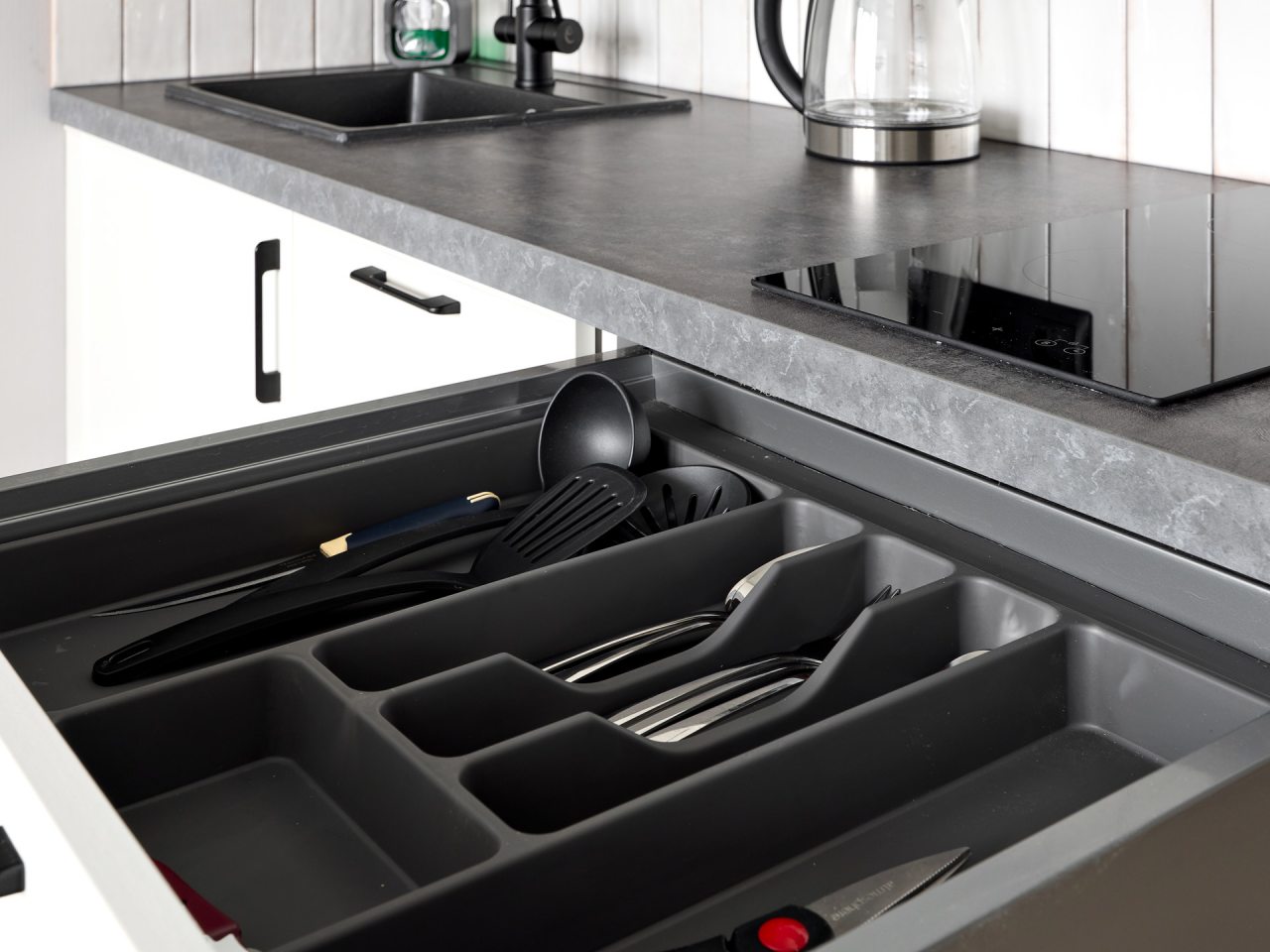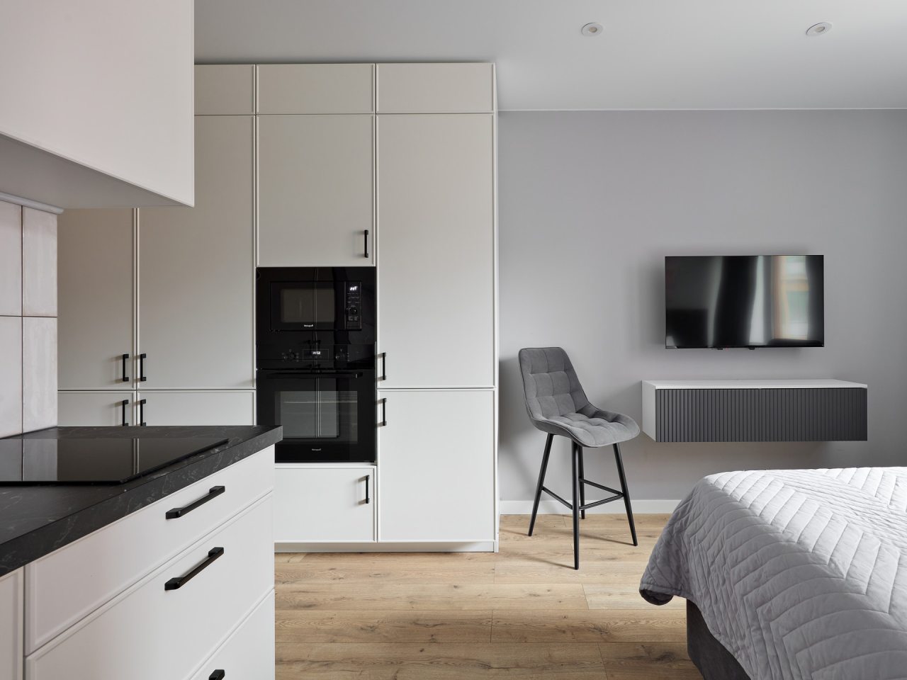 Кухонная зона порадует вас наличием посудомоечной машины, варочной панели, большого холодильника, духового шкафа, СВЧ-печи и электрического чайника, благодаря чему вы сможете приготовить абсолютно любое блюдо.