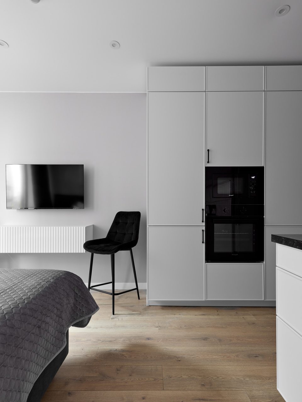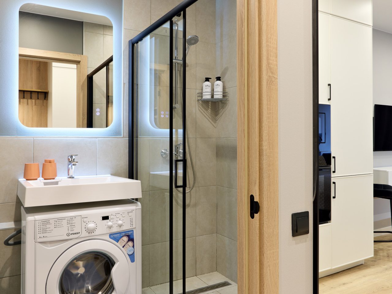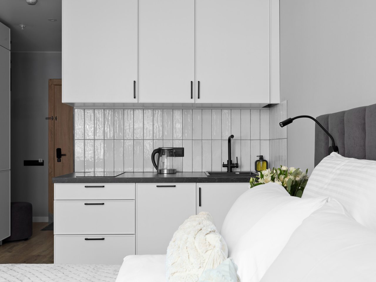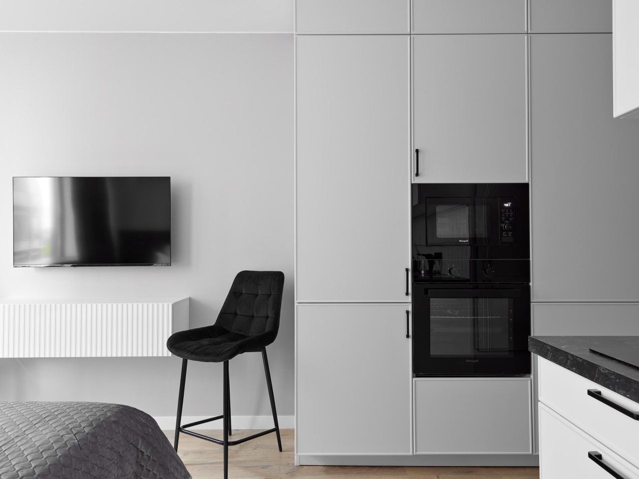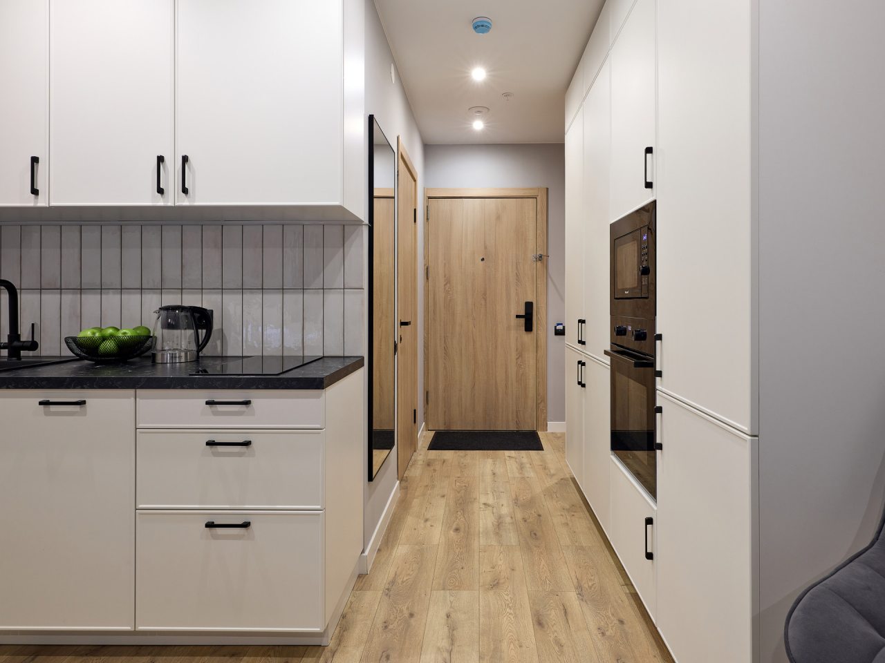 Кухонная зона порадует вас наличием посудомоечной машины, варочной панели, большого холодильника, духового шкафа, СВЧ-печи и электрического чайника, благодаря чему вы сможете приготовить абсолютно любое блюдо.