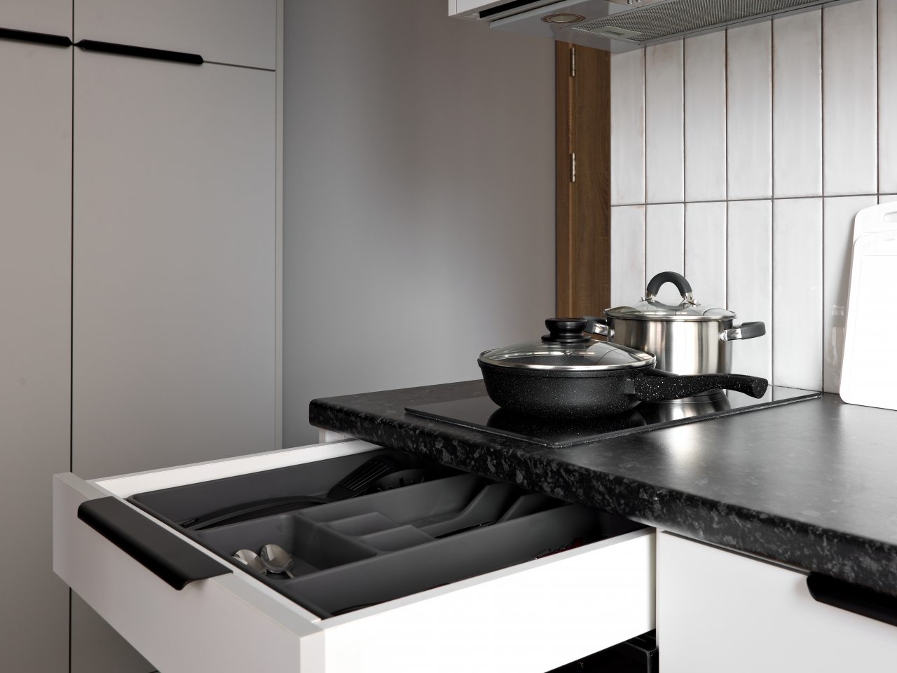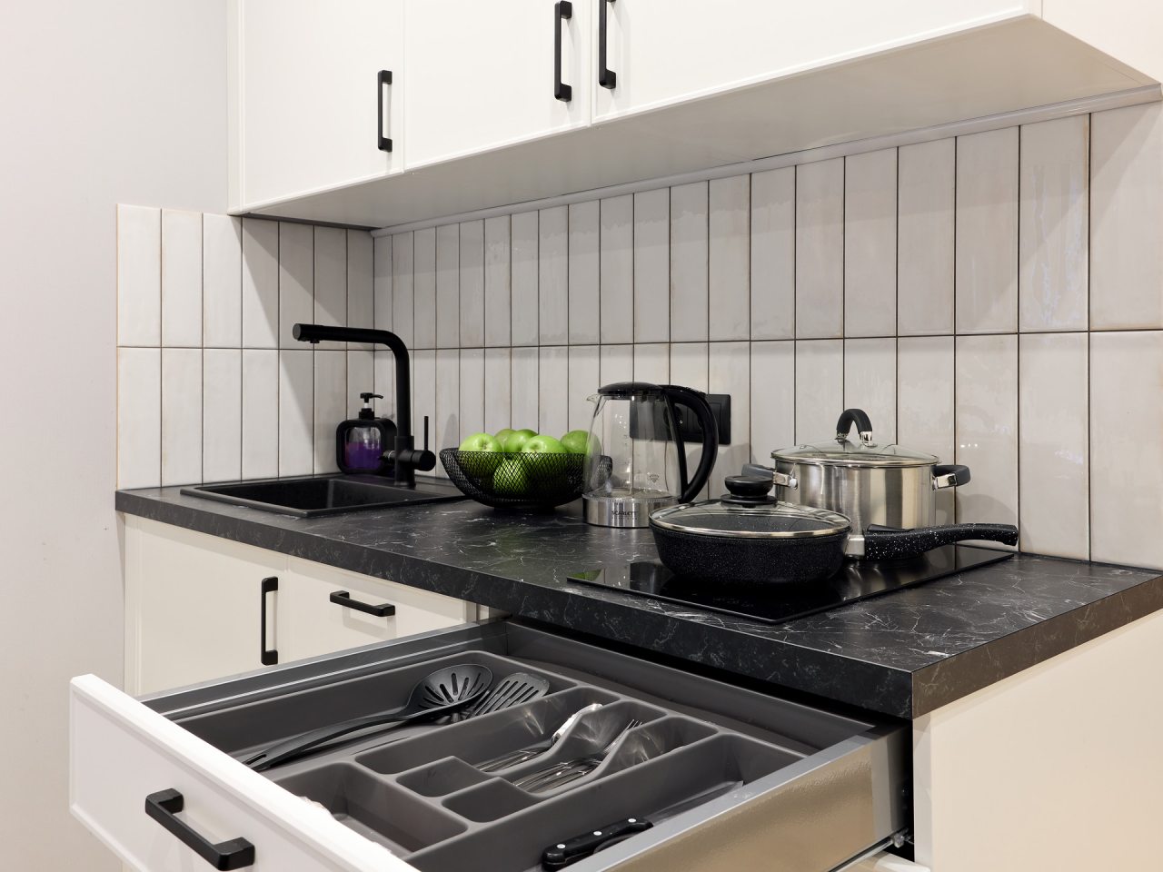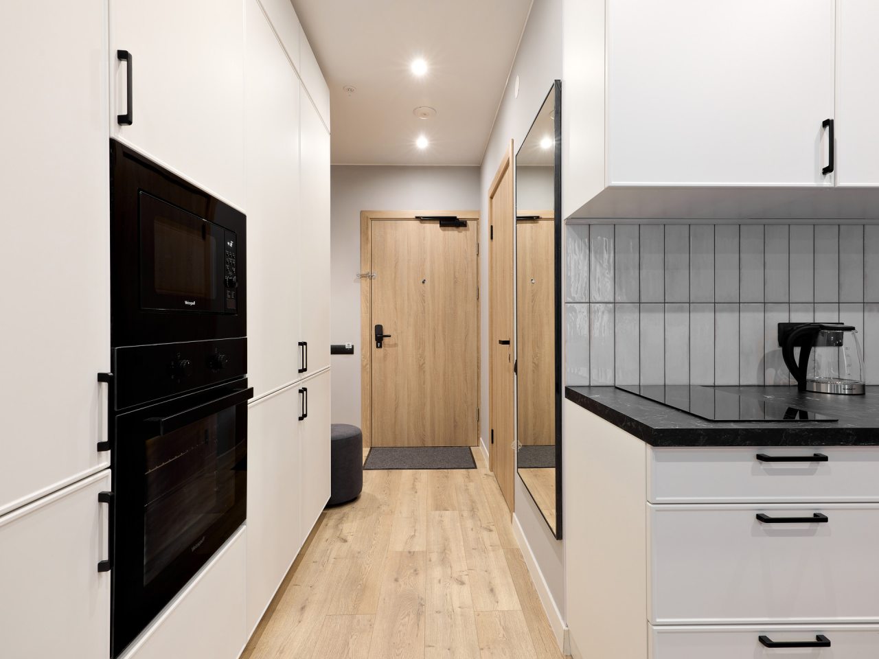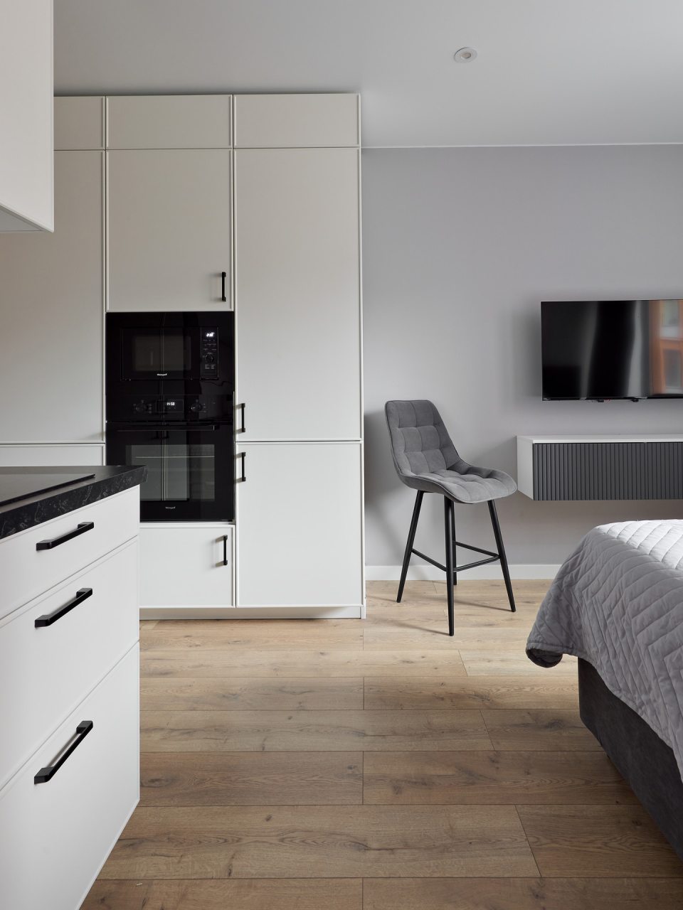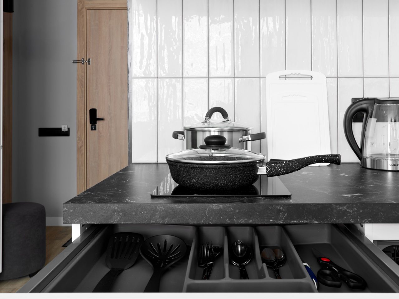 Кухонная зона порадует вас наличием посудомоечной машины, варочной панели, большого холодильника, духового шкафа, СВЧ-печи и электрического чайника, благодаря чему вы сможете приготовить абсолютно любое блюдо.