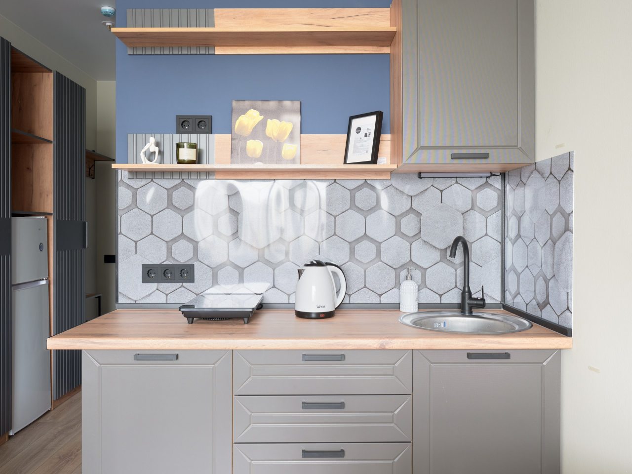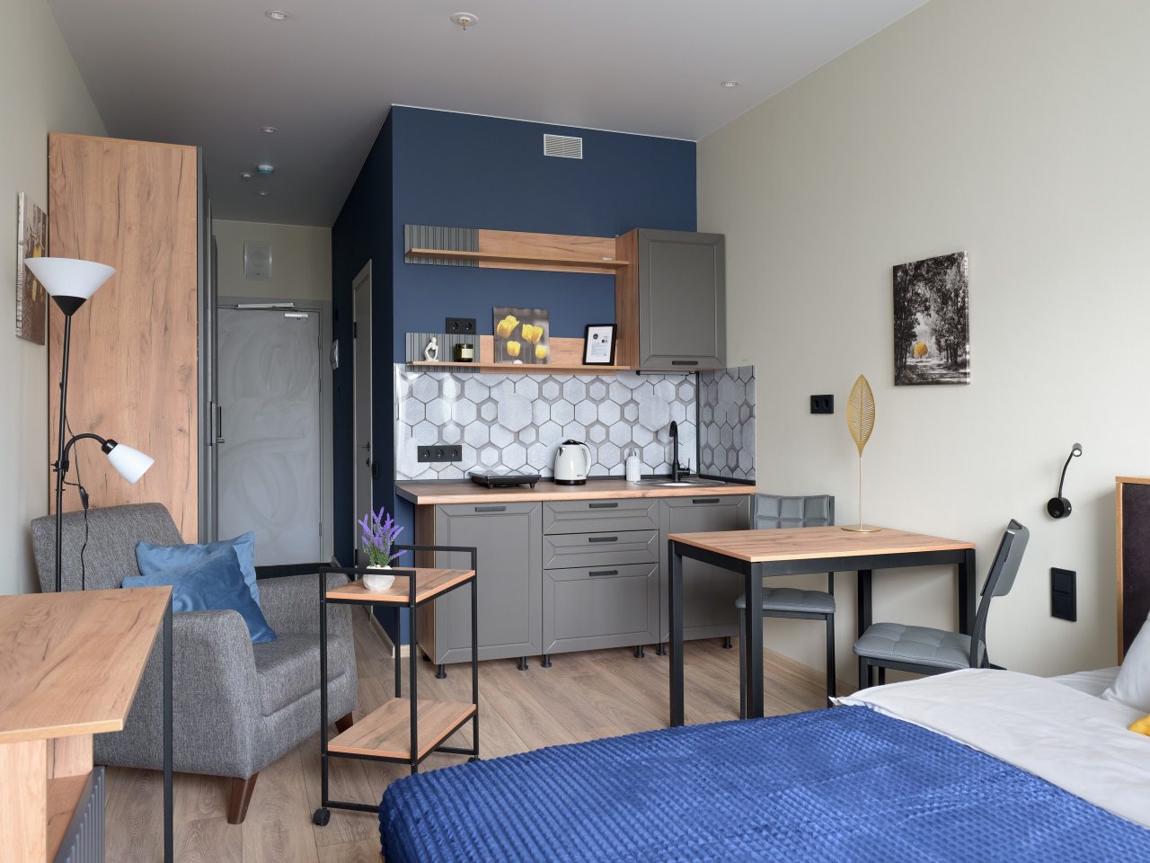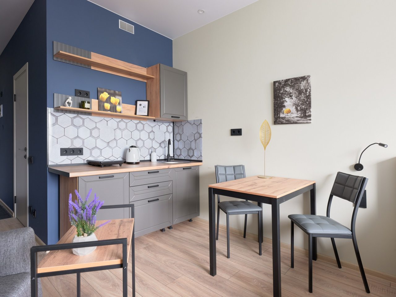 Небольшая кухня оснащены минимальным набором бытовой техники, благодаря которой можно организовать перекусы или полноценные приемы пищи. В пешей доступности находятся ресторан и кафе, где можно насладиться приятной атмосферой и поужинать.