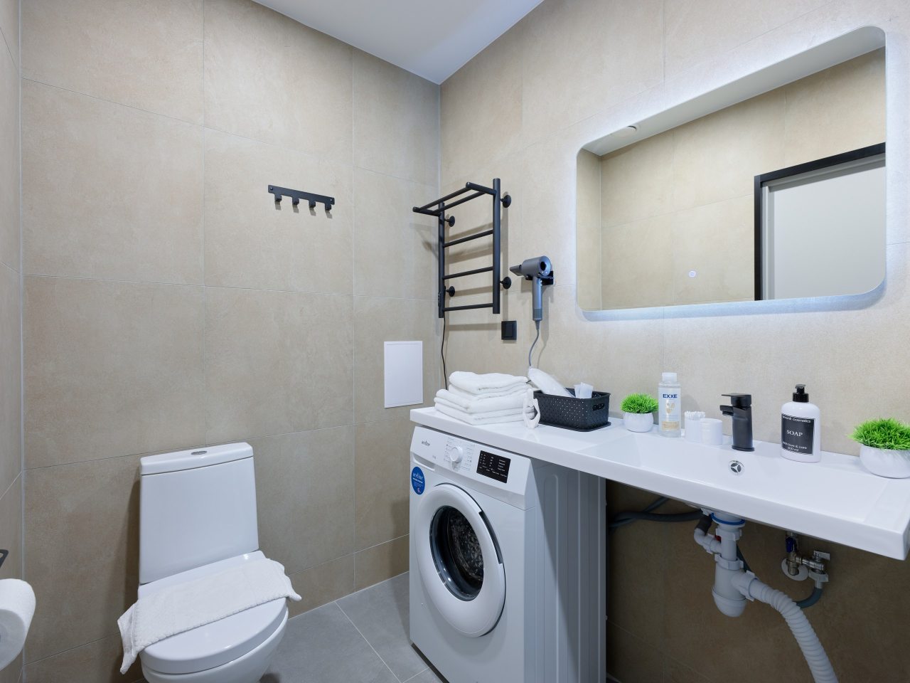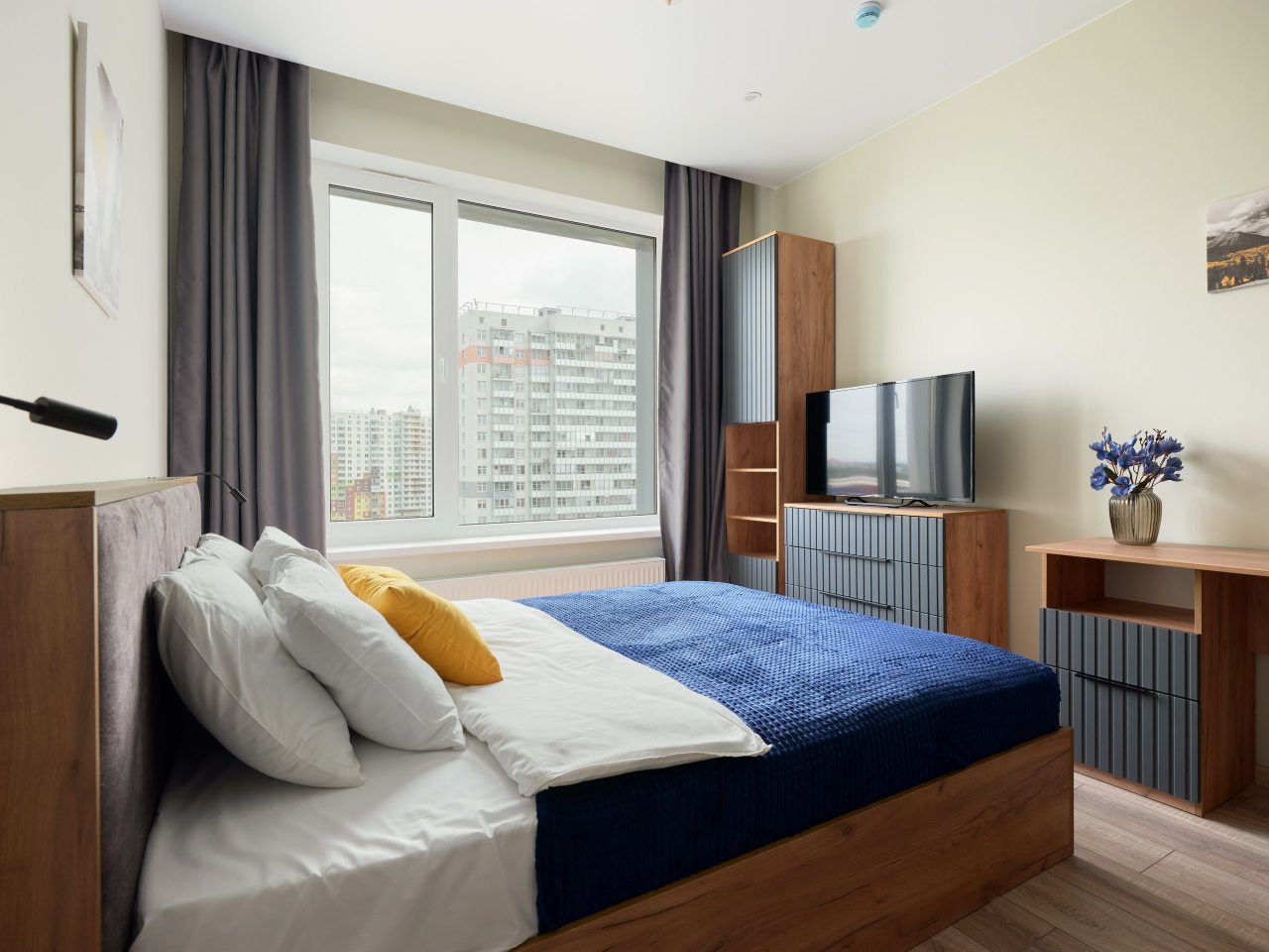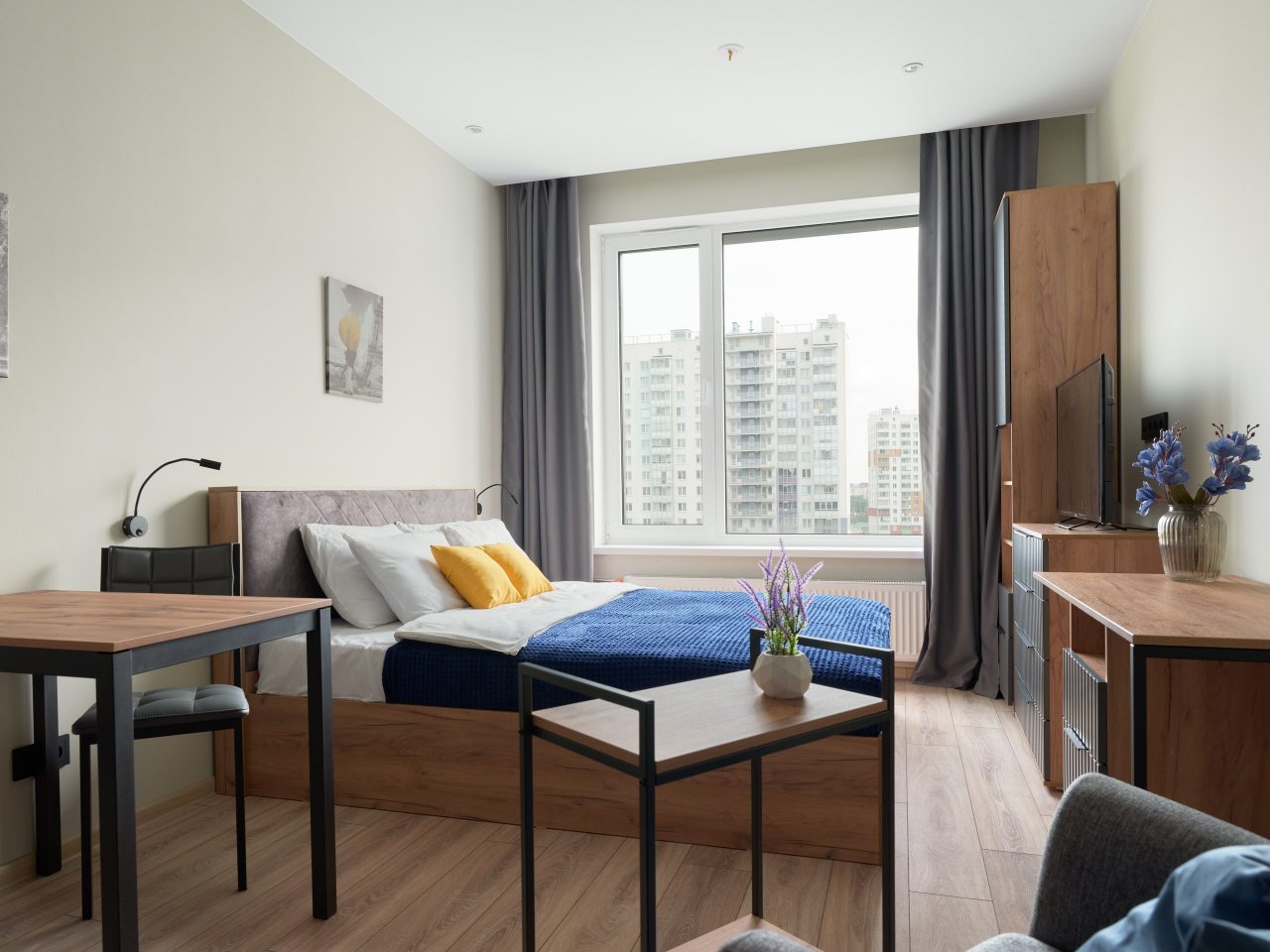 Современные апартаменты с ремонтом в приятных цветах подготовлены для пребывания гостей и укомплектованы качественной мебелью, техникой и собственной ванной комнатой с необходимым набором сантехники.