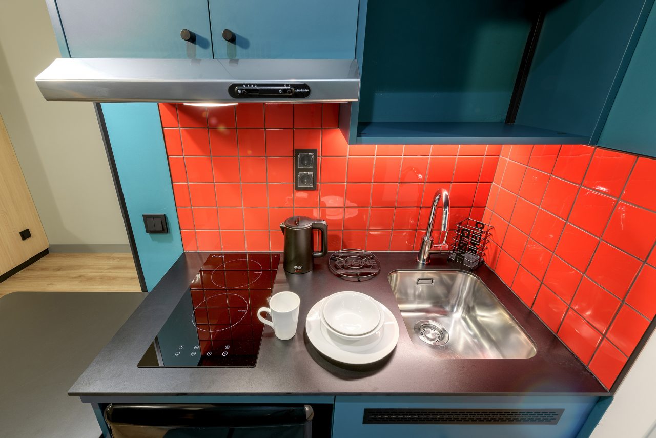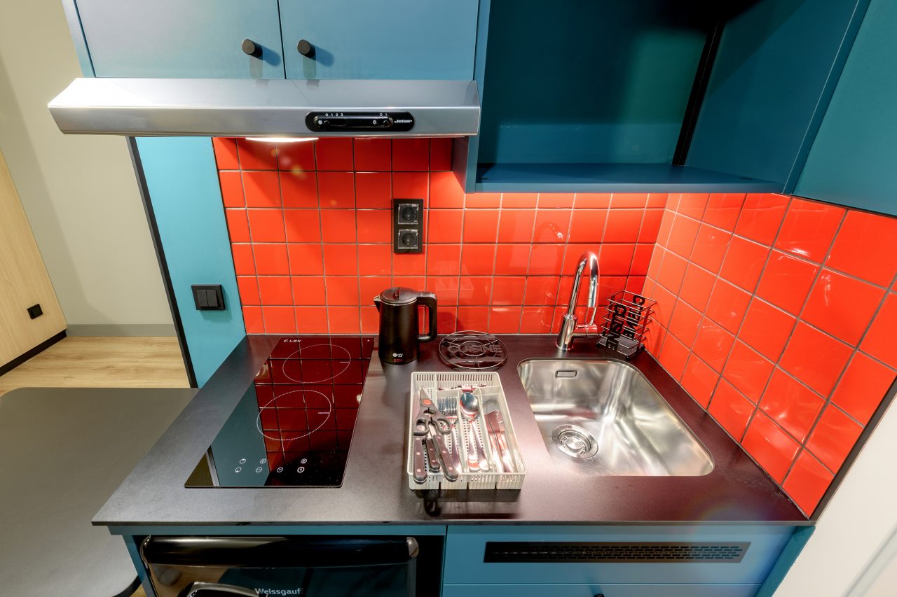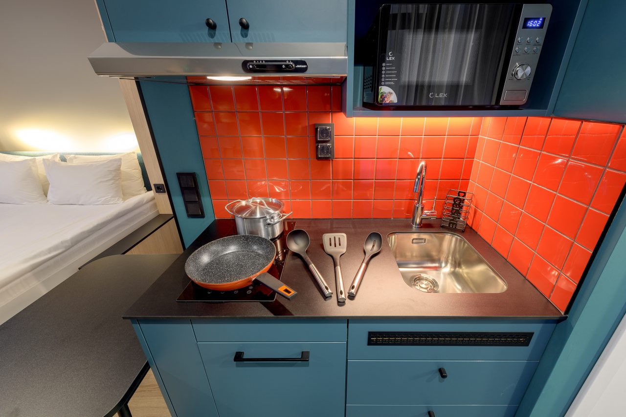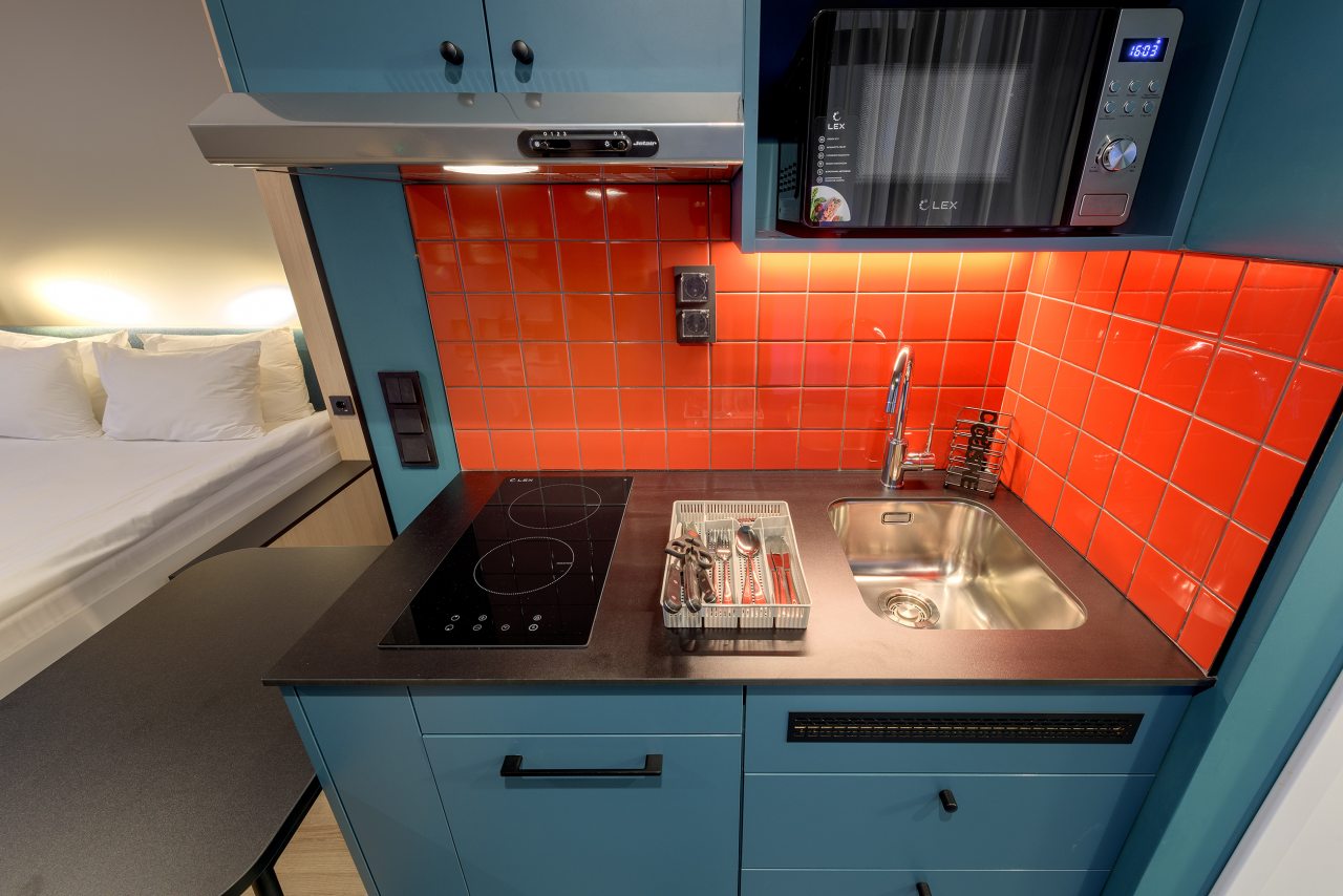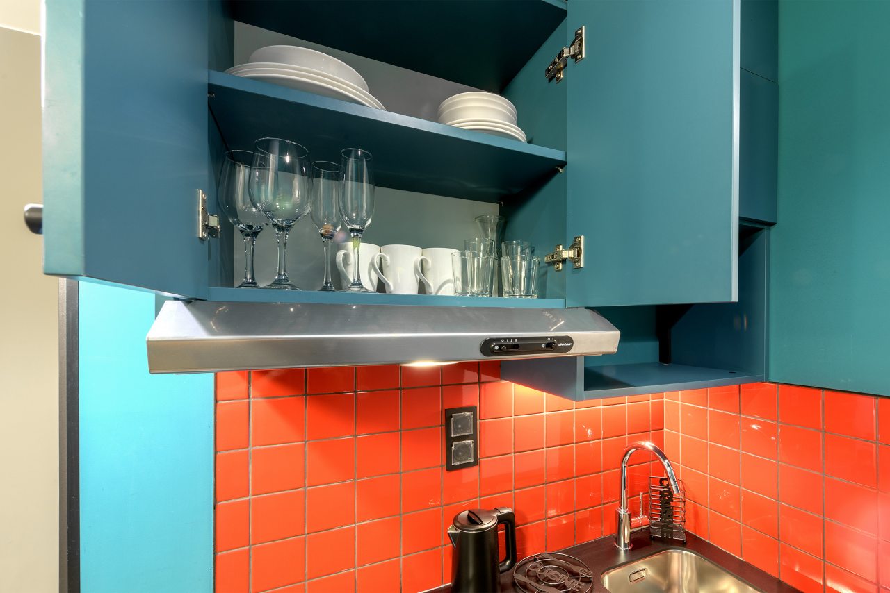 Кухня оборудована холодильником, варочной панелью, электрочайником, вытяжкой и др. Пообедать можно в ближайшем кафе.