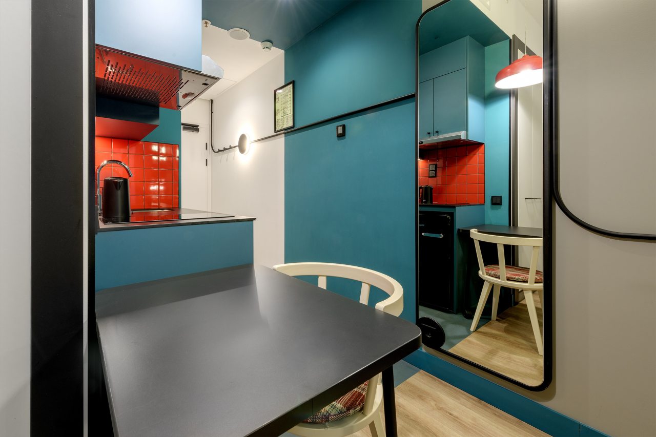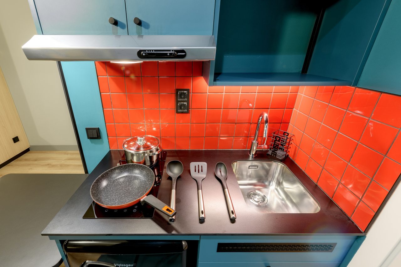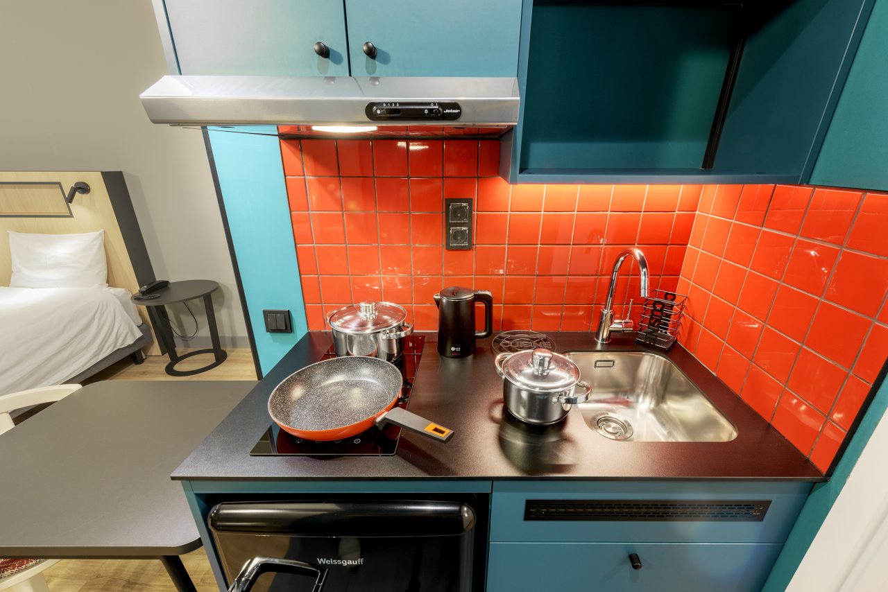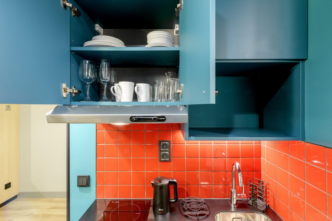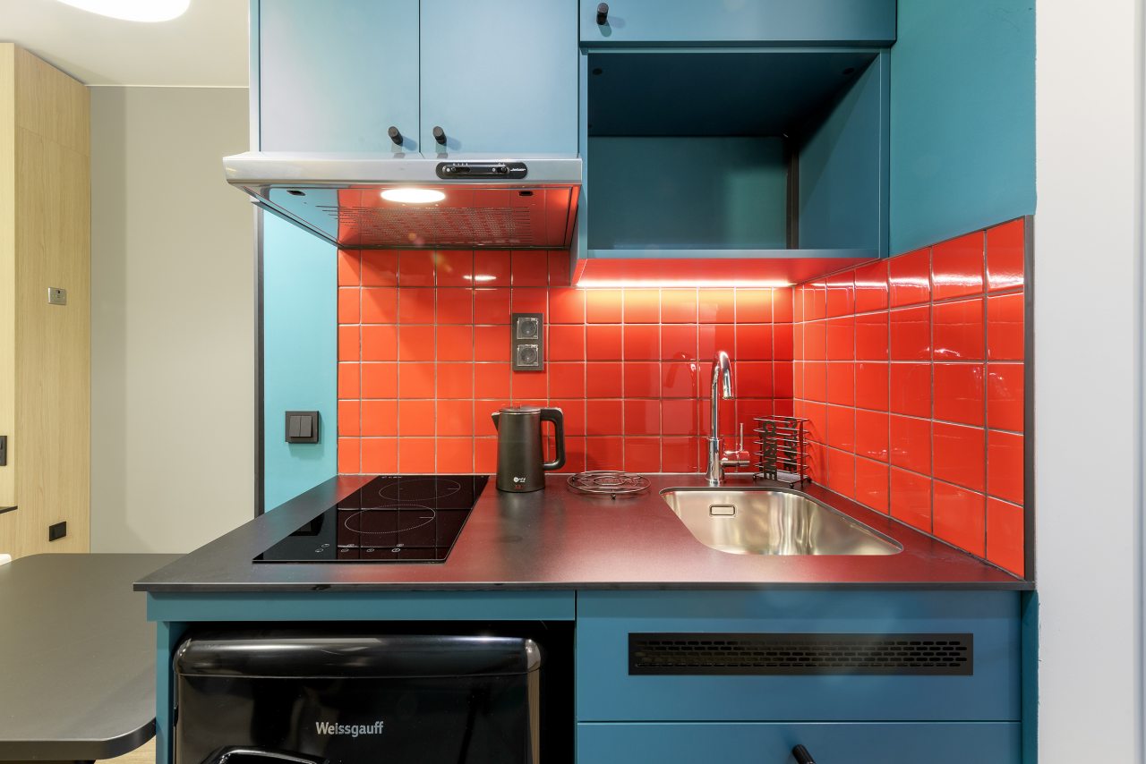 Кухня оборудована холодильником, варочной панелью, электрочайником, вытяжкой и др. Пообедать можно в ближайшем кафе.