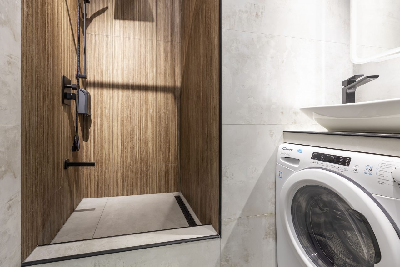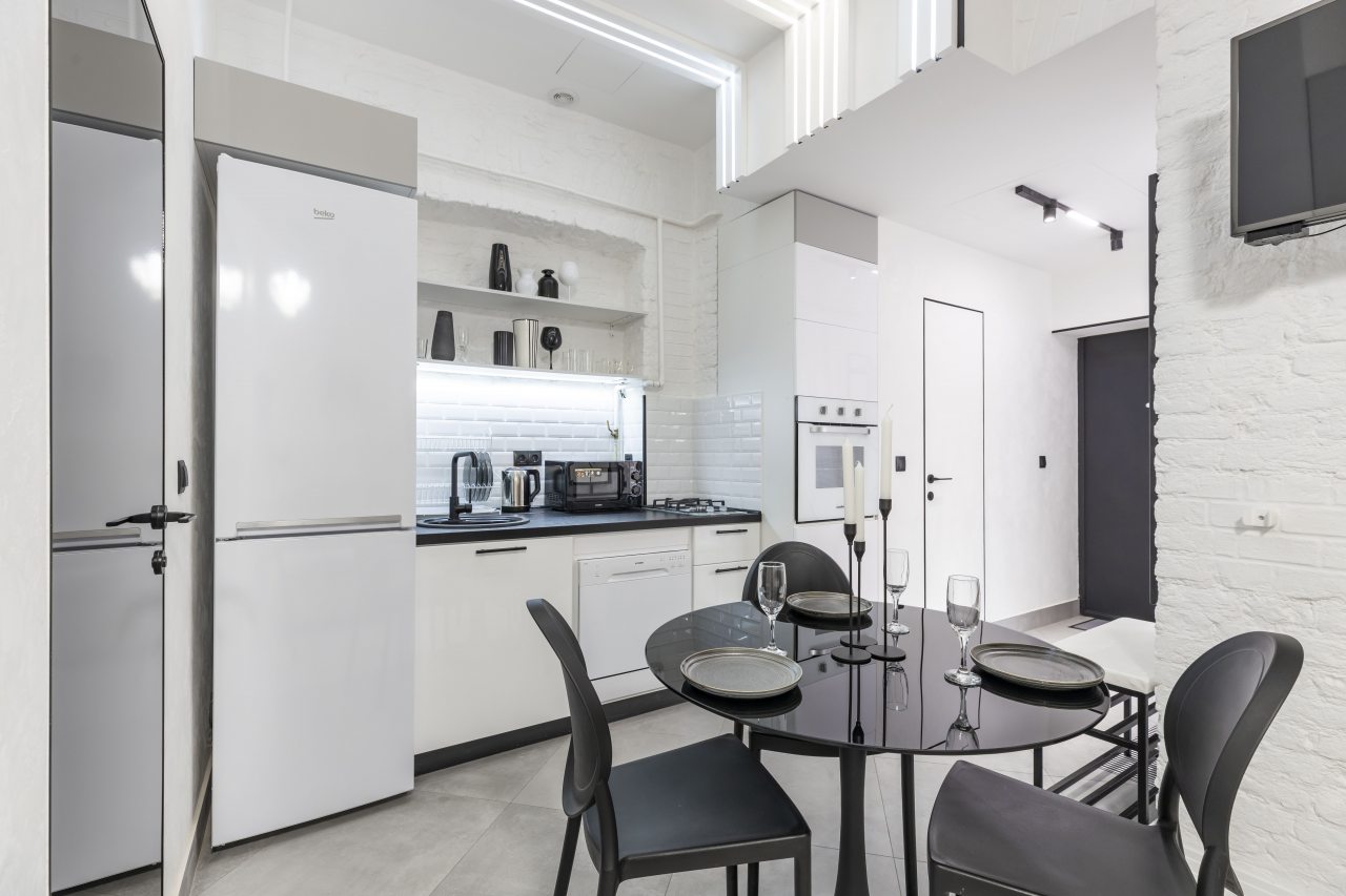 Стильная кухня оснащена комплектом гарнитура, обеденным столом и бытовой техникой. В шаговой доступности ресторан, пиццерия, бар, кафе и продуктовый магазин.