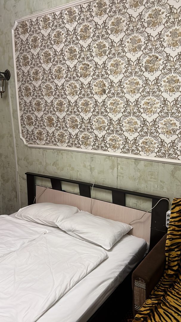 Из недостатков: достаточно старый ремонт внутри коридоров и номера. Во многих местах обои и потолочные карнизы уже отклеились. Рядом с кроватью нет электророзеток, вместо них проброшен удлинитель местами перемотанный изолентой.