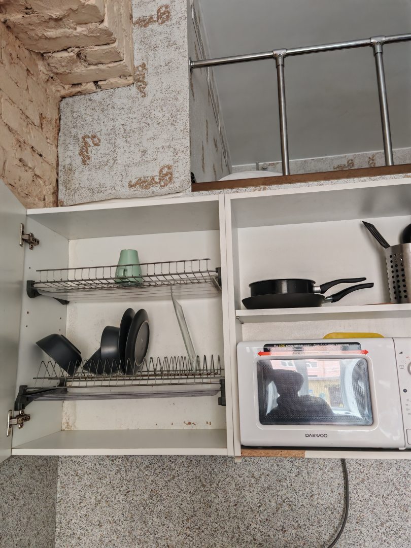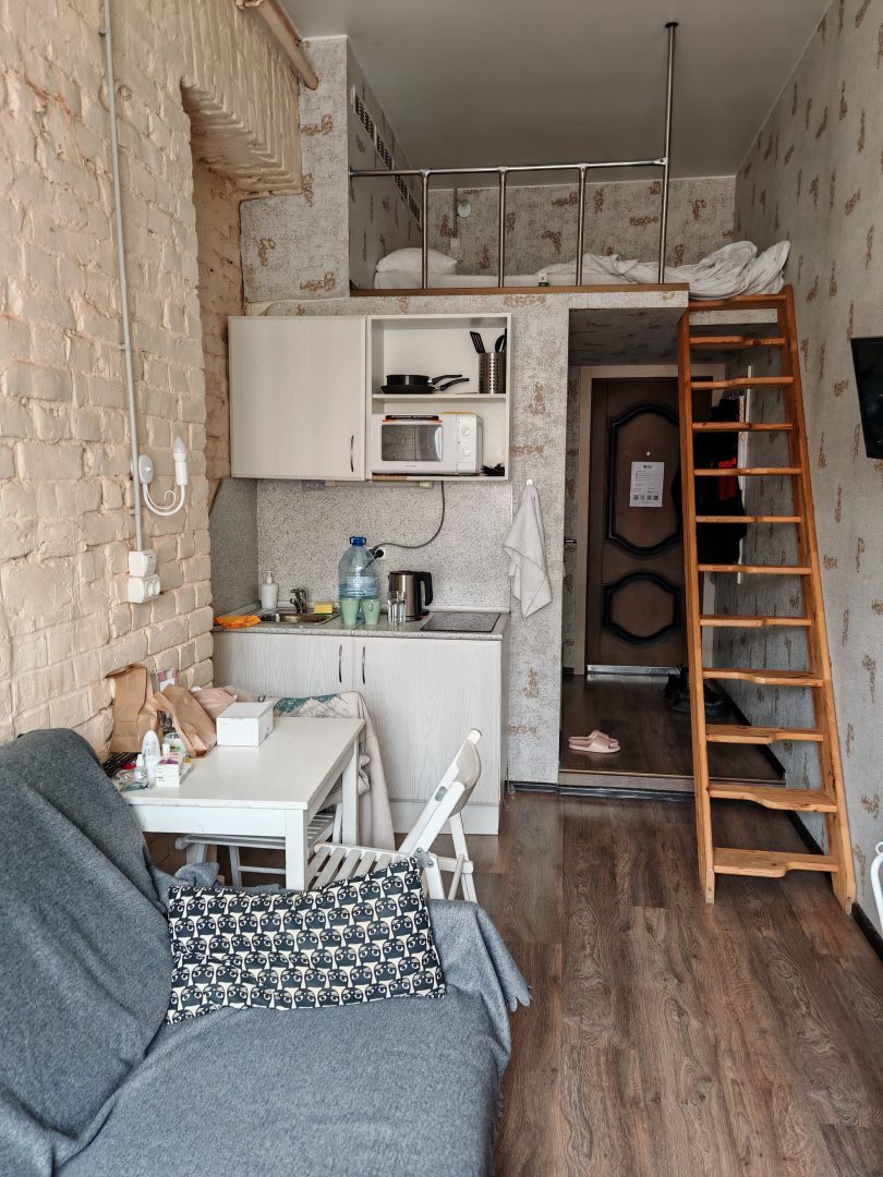 Очень компактные апартаменты и удобное заселение, администратор всегда находится на связи и помогает в решении вопросов. Есть небольшая кухонька, хорошая ванная, есть фен. Матрас на втором ярусе удобный, потолок не слишком низко, поэтому все нормально. Всем осталась довольна.