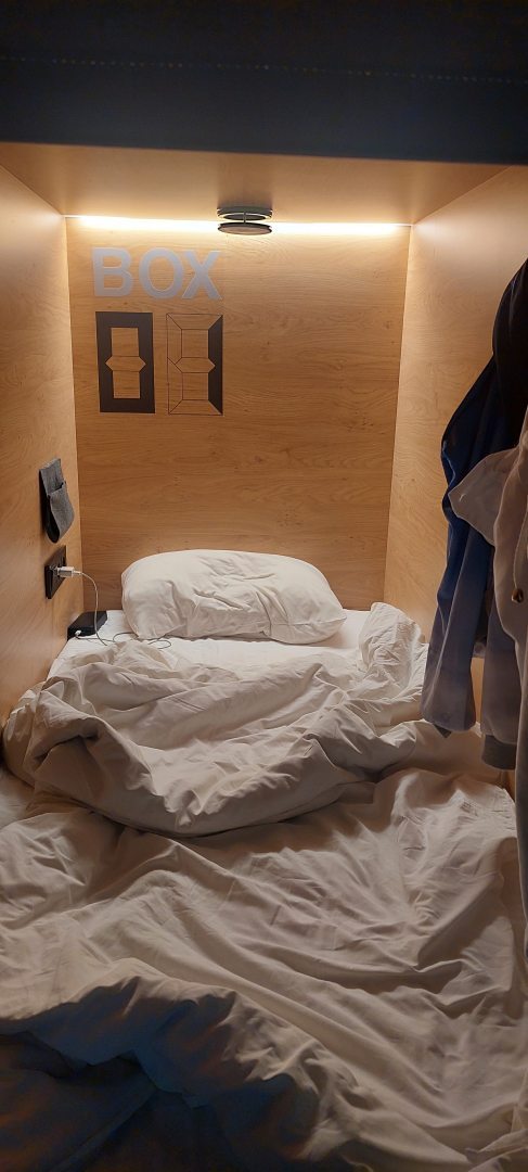 Хостел очень даже ничего. Достаточно уютно. Хорошее постельное белье в капсулах, тишина. В коридорах играет приятная музыка, администраторы улыбчивые и приветливые. Кстати, очень приятно было узнать что в счет проживания включен мини-завтрак в виде тостов, кофе и йогурта. С этим учетом цена на размещение здесь очень низкая. Советую!