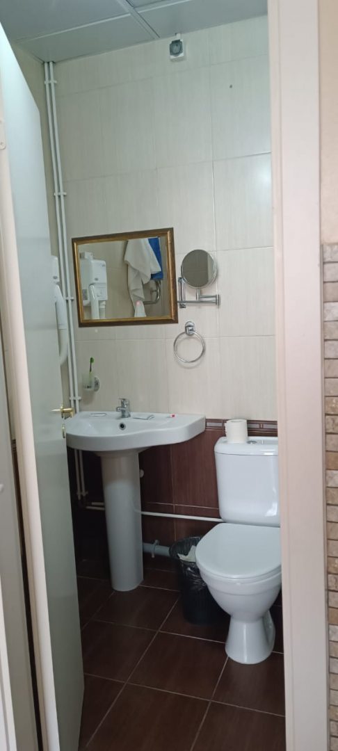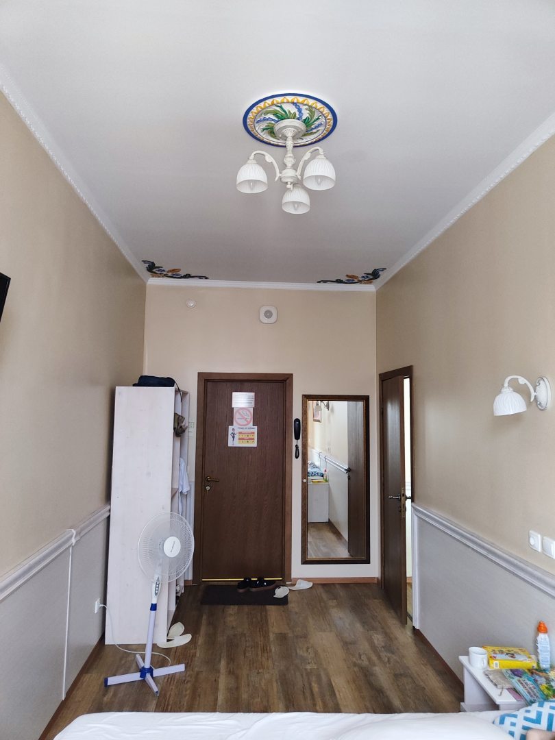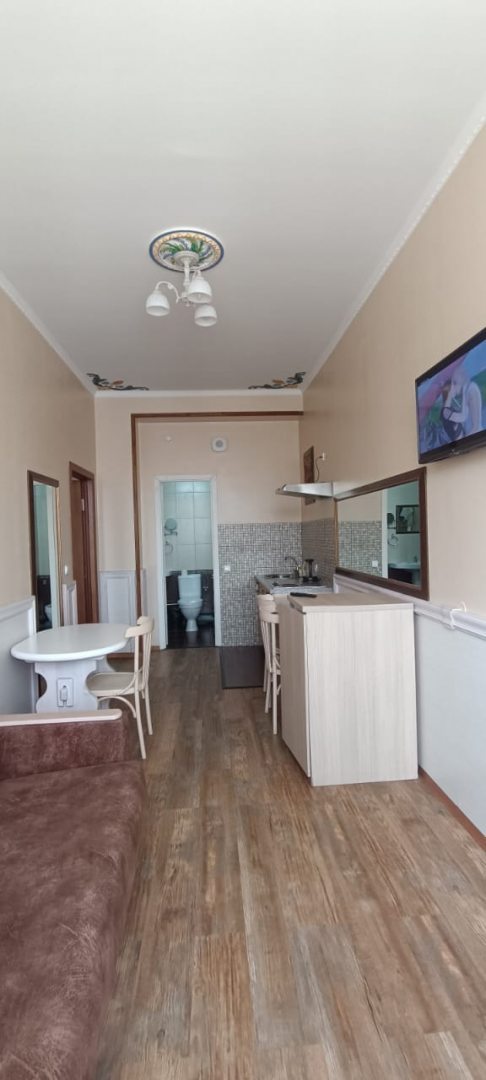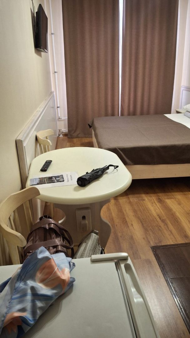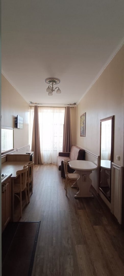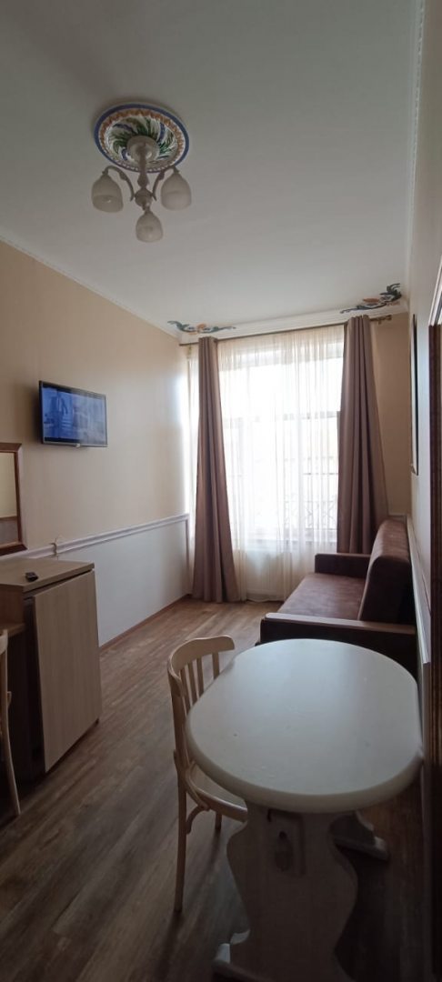 Мы проживали в номере апартаменты. Двухуровневый номер, немалая площадь, много воздуха, наверху - двуспальная кровать, туалет и душ ( санитарно-гигиенические принадлежности, фен), кресло, тумба для одежды. Над кроватью - светильники, имеются прикроватные тумбочки, большой телевизор. Внизу - диван, отрытый шкаф, холодильник, стол для четверых гостей, кухонная зона с необходимой посудой. Белье - хорошее, полотенца, халаты. Номер просторный. Имеются вентиляторы. Мусор убирали каждый день. Завтраки в кафе - каша, блины, творог, нарезка, овощи, арбуз, чай, кофе, вполне сытные. Удобное, близкое расположение от исторических мест города, можно дойти и пешком. Багажная комната для хранения вещей до заселения или после. Считаю, хорошее соотношение цены и качества. Советую данный отель.