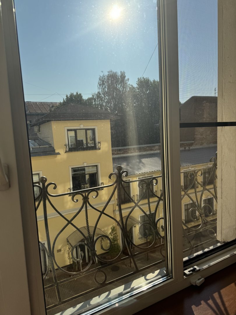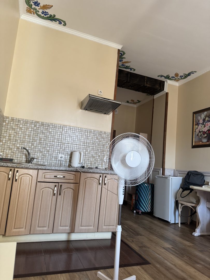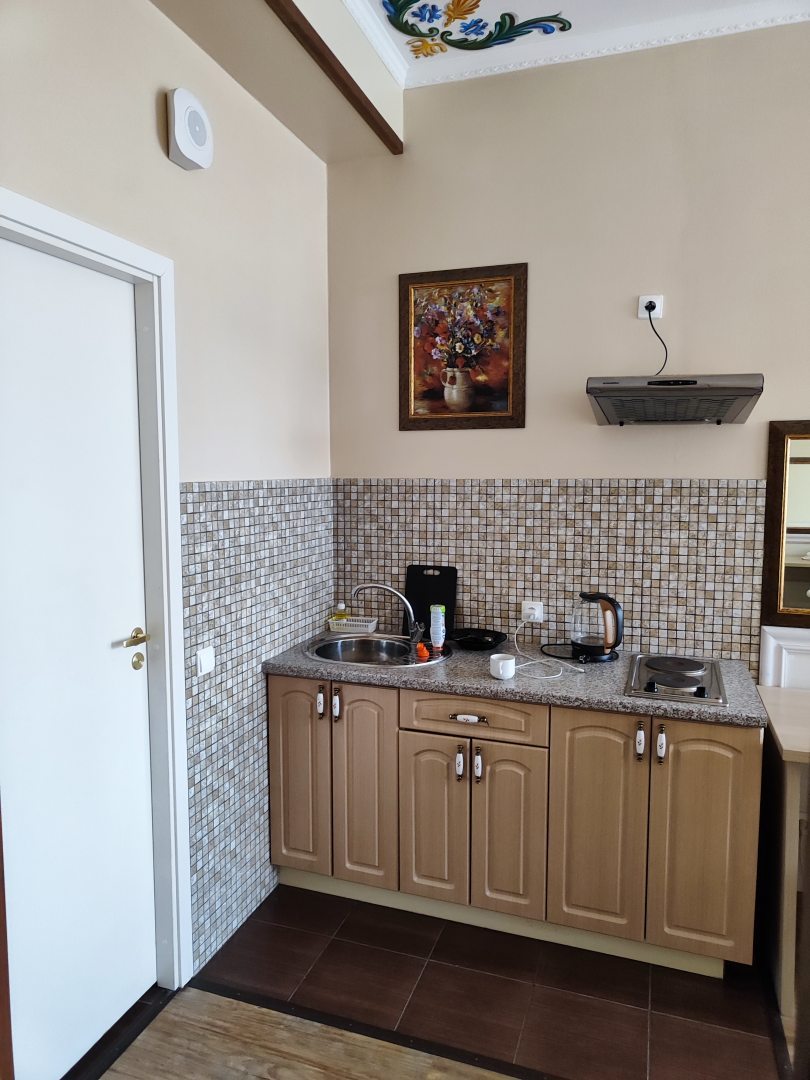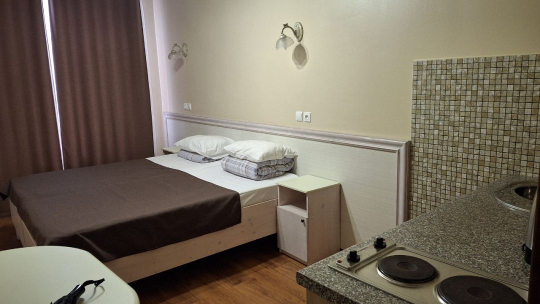 Мы проживали в номере апартаменты. Двухуровневый номер, немалая площадь, много воздуха, наверху - двуспальная кровать, туалет и душ ( санитарно-гигиенические принадлежности, фен), кресло, тумба для одежды. Над кроватью - светильники, имеются прикроватные тумбочки, большой телевизор. Внизу - диван, отрытый шкаф, холодильник, стол для четверых гостей, кухонная зона с необходимой посудой. Белье - хорошее, полотенца, халаты. Номер просторный. Имеются вентиляторы. Мусор убирали каждый день. Завтраки в кафе - каша, блины, творог, нарезка, овощи, арбуз, чай, кофе, вполне сытные. Удобное, близкое расположение от исторических мест города, можно дойти и пешком. Багажная комната для хранения вещей до заселения или после. Считаю, хорошее соотношение цены и качества. Советую данный отель.