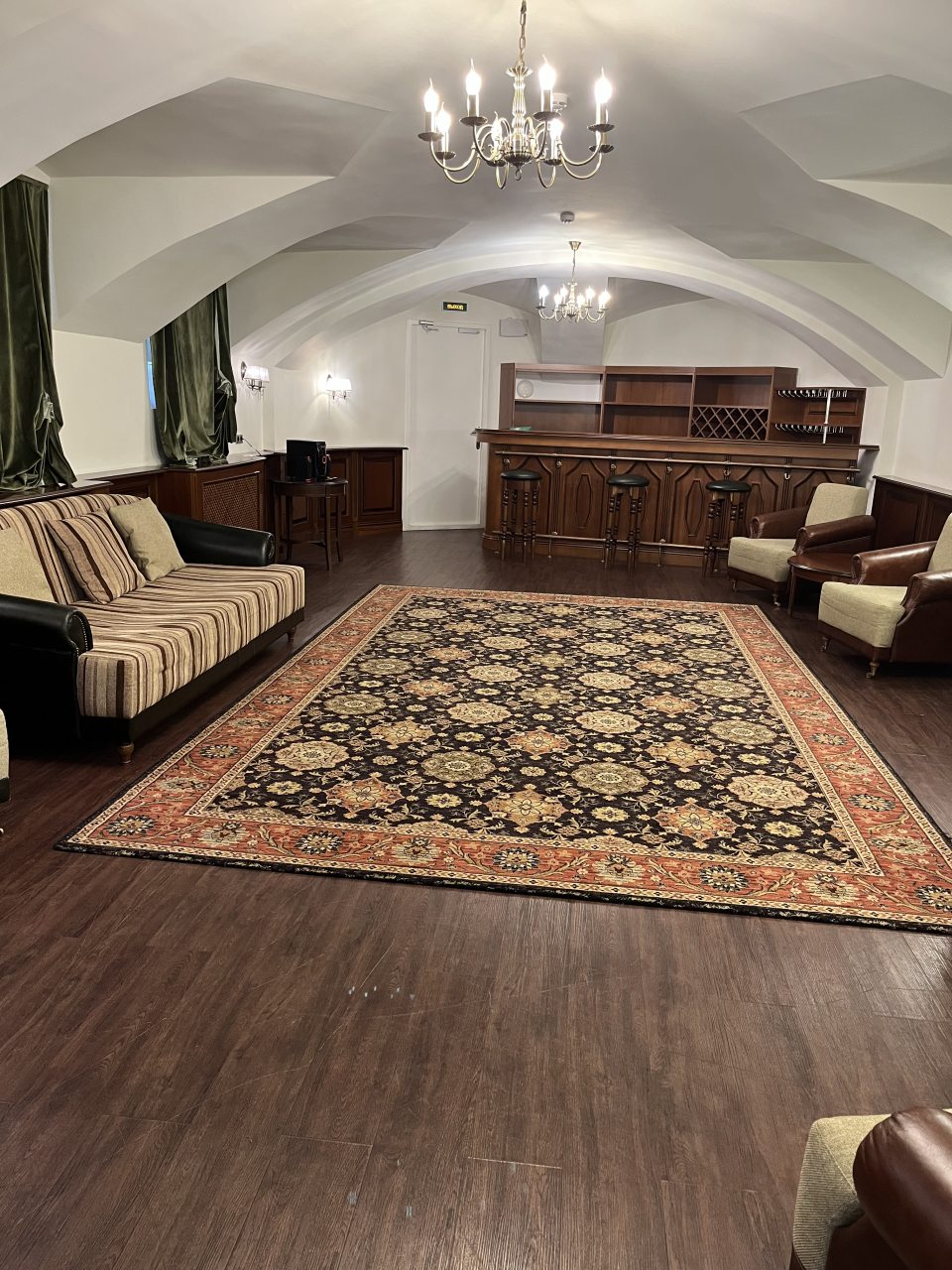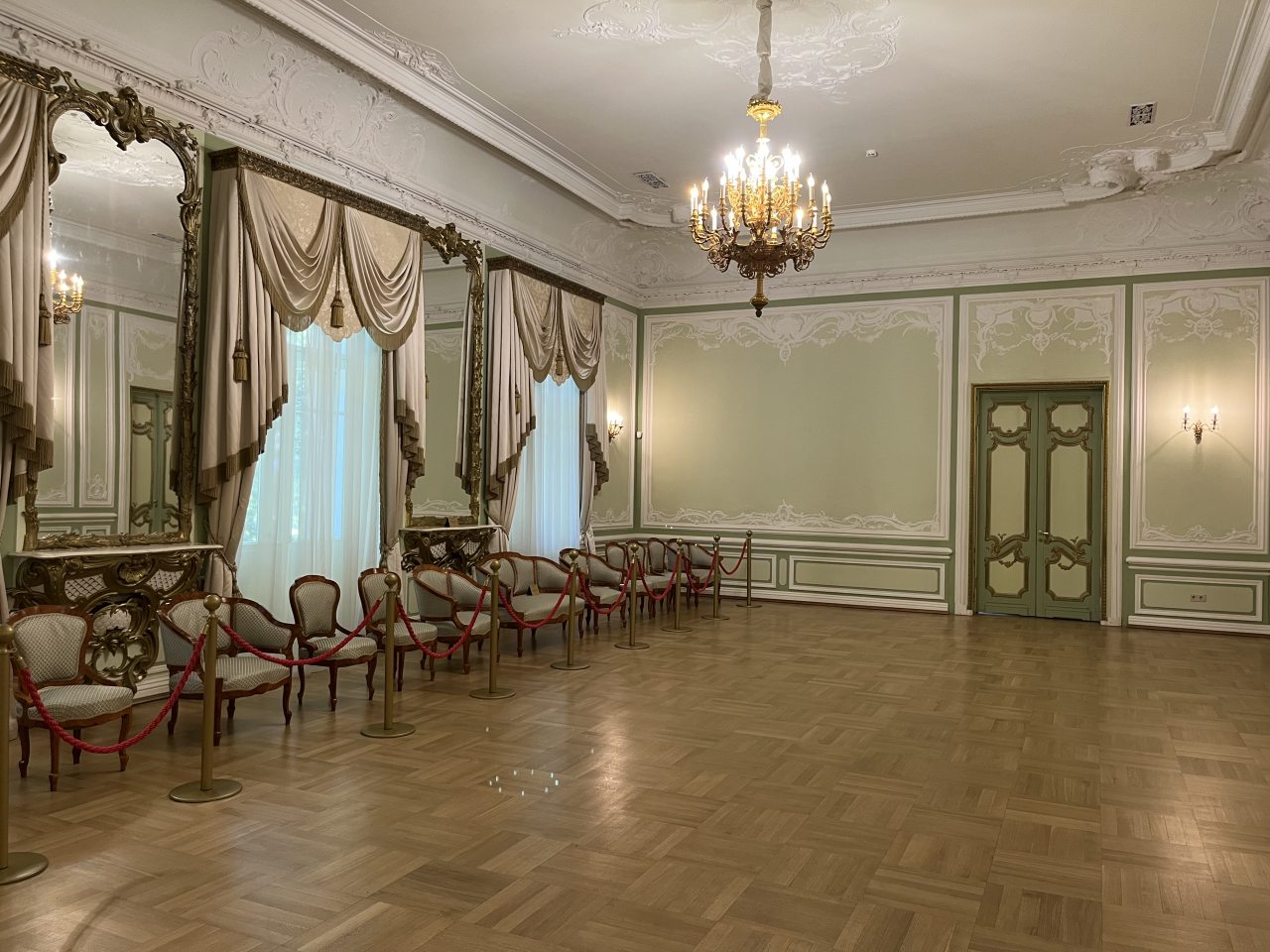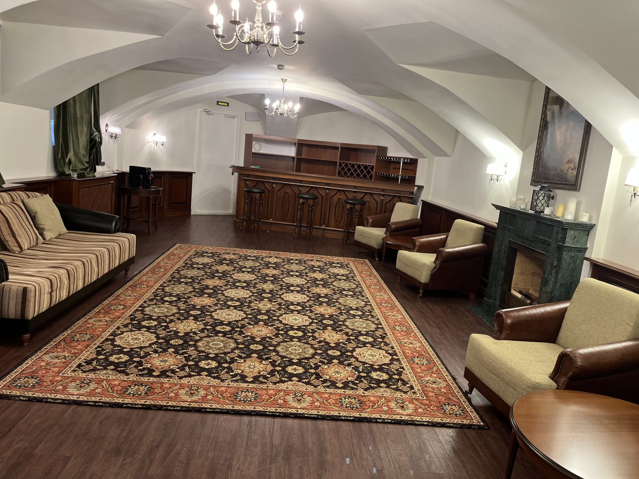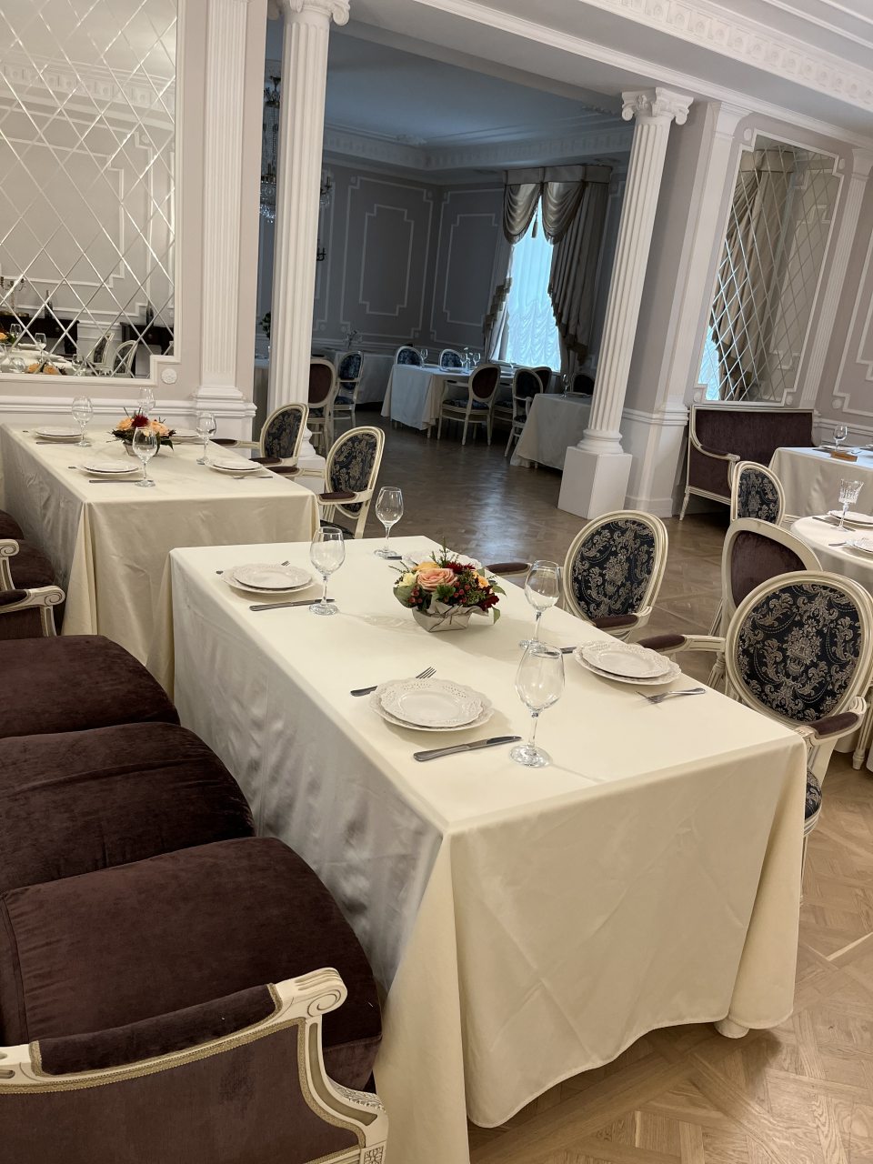 Для организации деловых встреч, фотосессий и корпоративных мероприятий в гостинице предлагаются парадные залы. Каждый зал роскошно оформлен, имеет индивидуальный интерьер и вместимость: Розовый зал: площадь составляет 60 кв.м. Вместимость 40 человек; Зелёный зал: центральный зал (бальный зал) - нарядный, светлый, самый большой. Площадь 100 кв.м; Охотничий зал: площадь 60 кв.м; Голубой кабинет: площадь 60 кв.м; Переговорная комната: 40 кв.м.