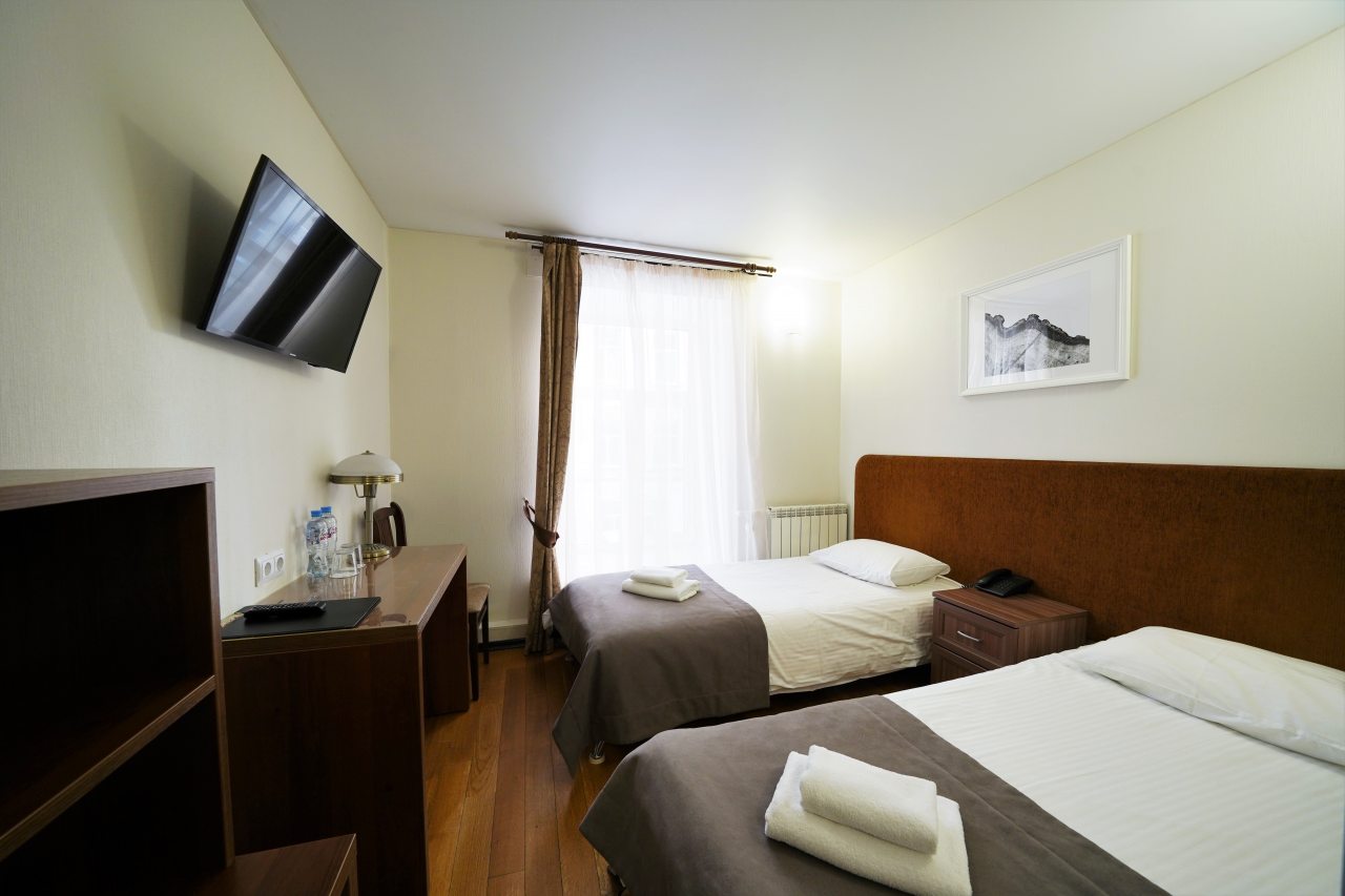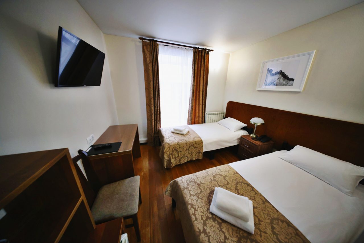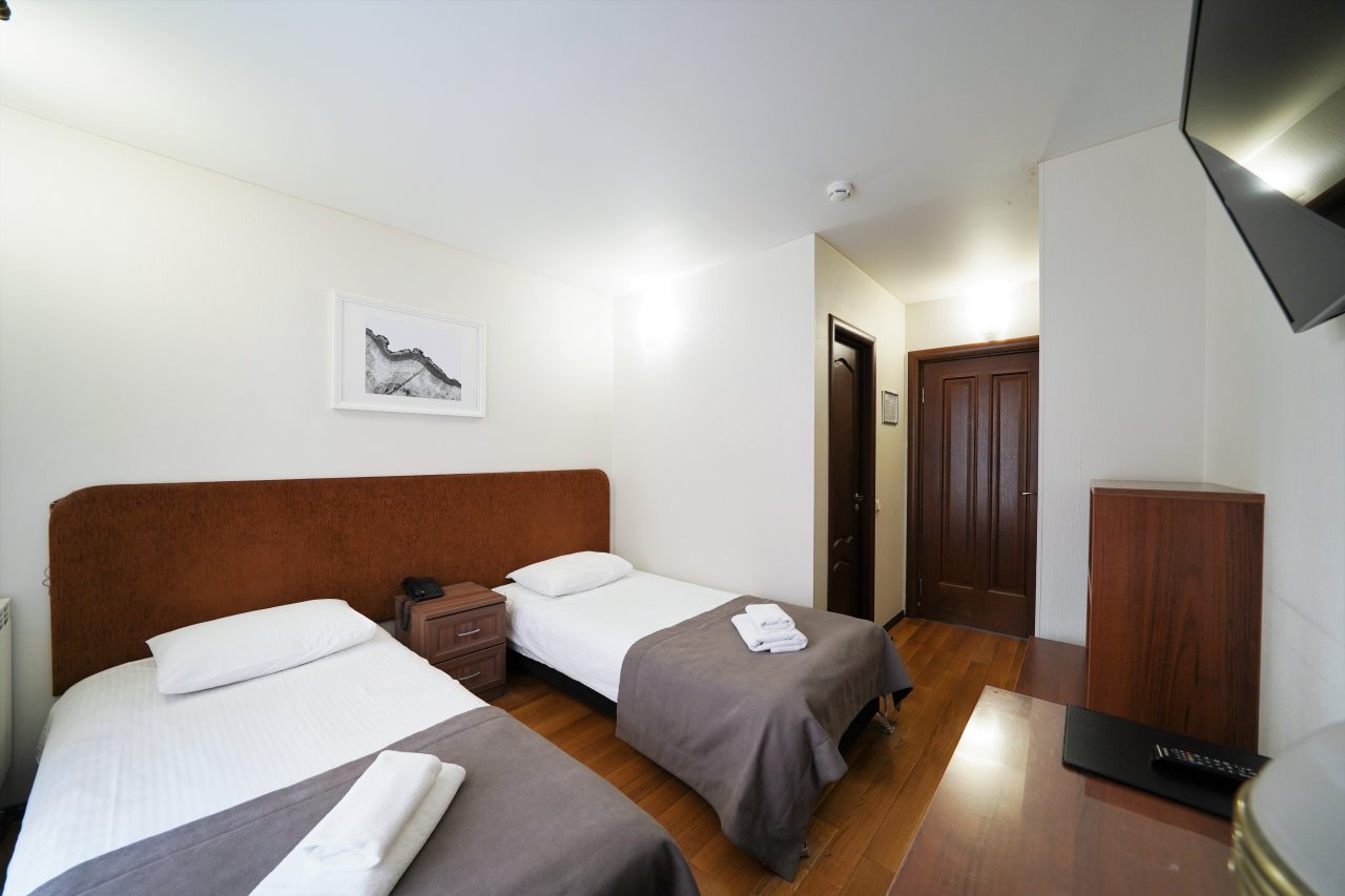 Интерьер комнат выдержан в приятных светлых тонах. Внутри есть всё для вашего комфортного проживания, включая доступ в интернет, удобную кровать, телевизор, качественную мебель. В зависимости от выбранного номера, в санузле будет душ или ванна, а также другая необходимая сантехника.