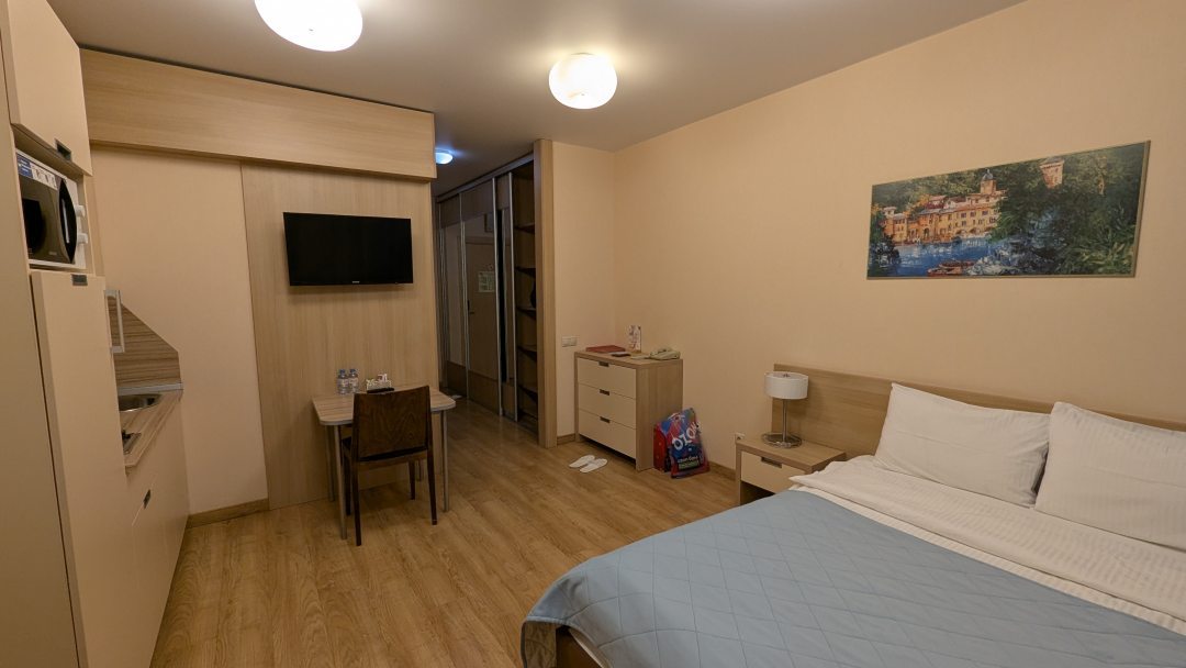 Разместиться предлагается в комфортабельных номерах, оборудованных полноценной кухней с посудой как для приготовления, так и для приема пищи, удобной мебелью, современной техникой, кондиционером, и индивидуальными ванными комнатами, совмещенными с санузлом. Для каждого отдыхающего предназначен набор полотенец и средств личной гигиены. Благодаря бесплатному Wi-Fi на всей территории комплекса можно оставаться на связи в любое время.