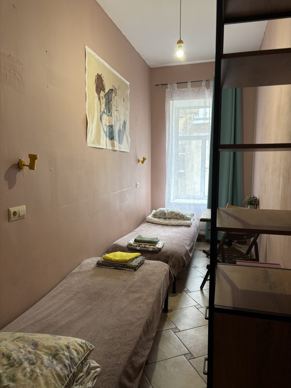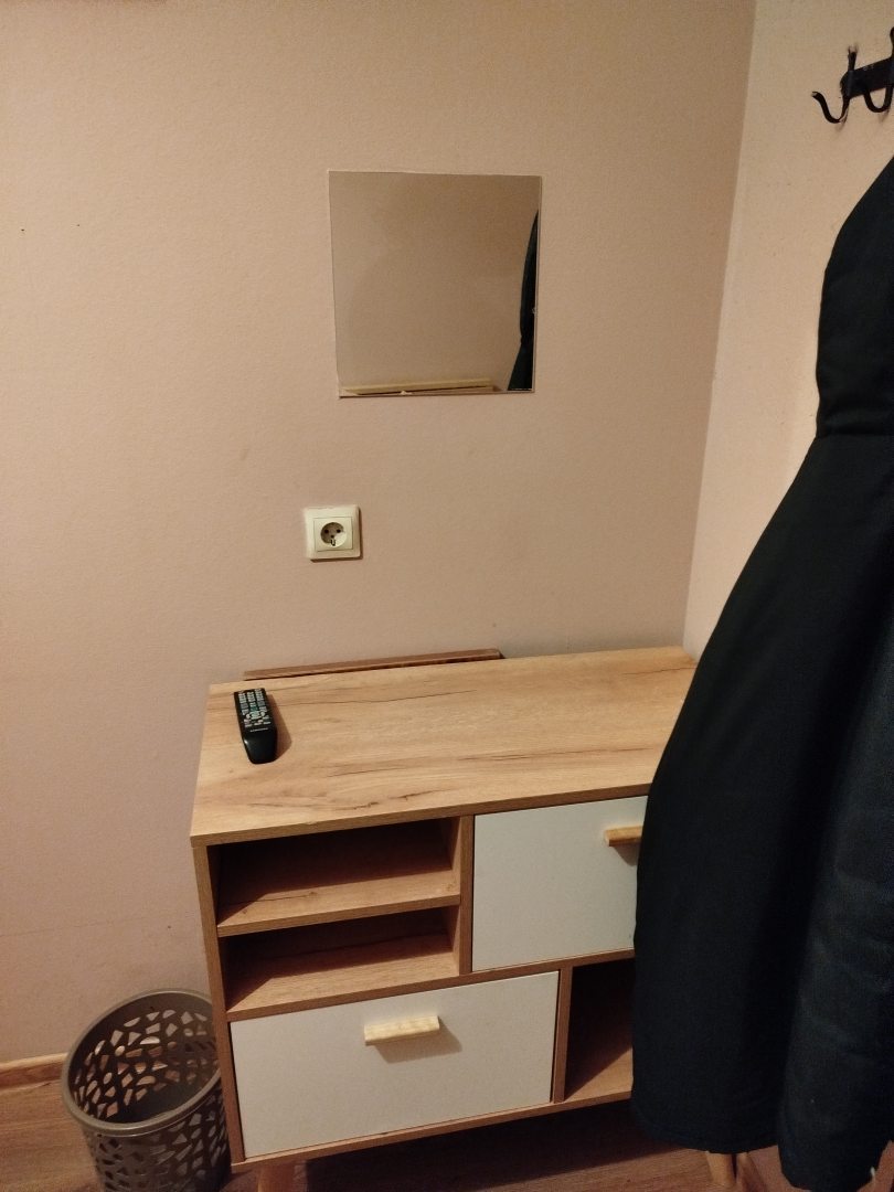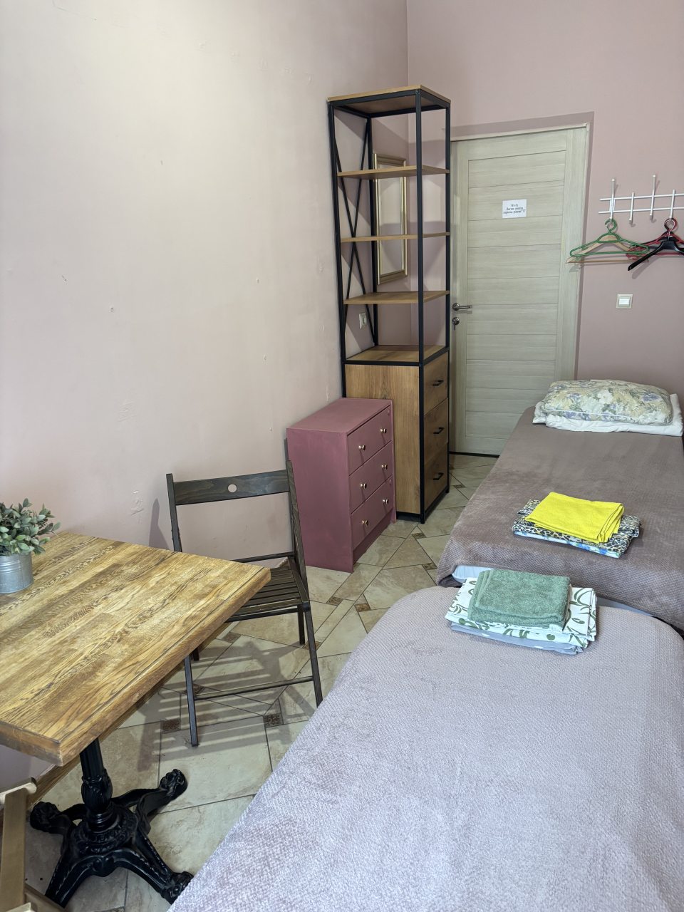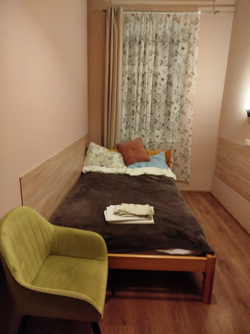 Из недостатков: очень старое застиранное постельное белье. Вместо шкафа грубо сколоченный короб без дверей. Кровати проваливаются посередине. Не до пола, но ощутимо.