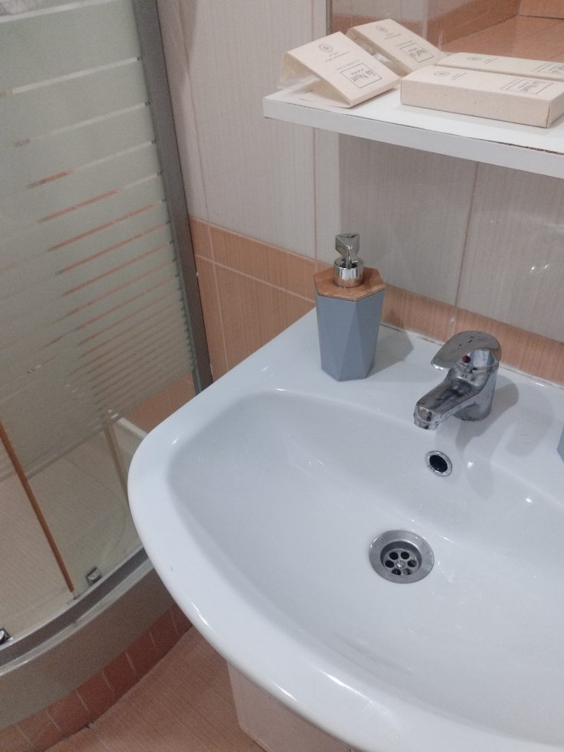 Из недостатков: я бронировала двухместный, хотя проживала одна. При бронировании были фото номера, где была двухспальная кровать и над кроватью красивое панно. Все меня устроило. Но при заселении мне дали очень маленький номер с двухспальной кроватью, которая занимала весь номер. В номере не было стола, гардероба, стула. В ванной комнате была душевая и маленькая раковина. В душевой при пользовании постоянной стояла вода. Я поставила в известность администратора, но засор не устранили. Позже я увидела свой номер и в который меня не заселили почему-то. Наверное здесь так принято. Это обстоятельство, к сожалению омрачило мое пребывание в этом отеле.