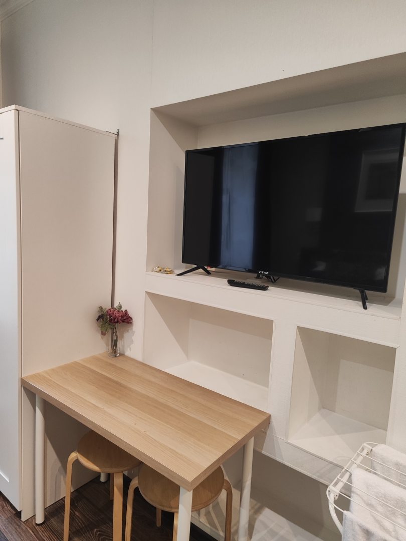 На мой взгляд, здесь есть все, что необходимо для проживания: гладилка с утюгом, стиральная машинка с порошком, холодильник с плитой, посуда, чайник, фен, полотенца и так далее. Порадовал мягкий матрац без пружин и вместительный шкаф с вешалками. Тумбочка, конечно, маловата, но зато есть огромный подоконник, который компенсирует эту проблему. Также было в новинку проходить кучу дверей с различными паролями (в один день у меня сел телефон, на котором был записан шестизначный код от двери, так что пришлось подбирать его по памяти, но это уже моя оплошность. Кстати потом его поменяли на гораздо более простой в запоминании), но в общем я быстро привыкла. Спасибо этому мини-отелю за приятные условия проживания.