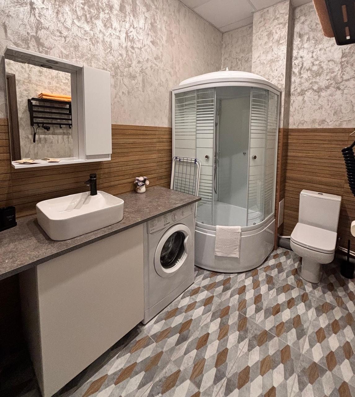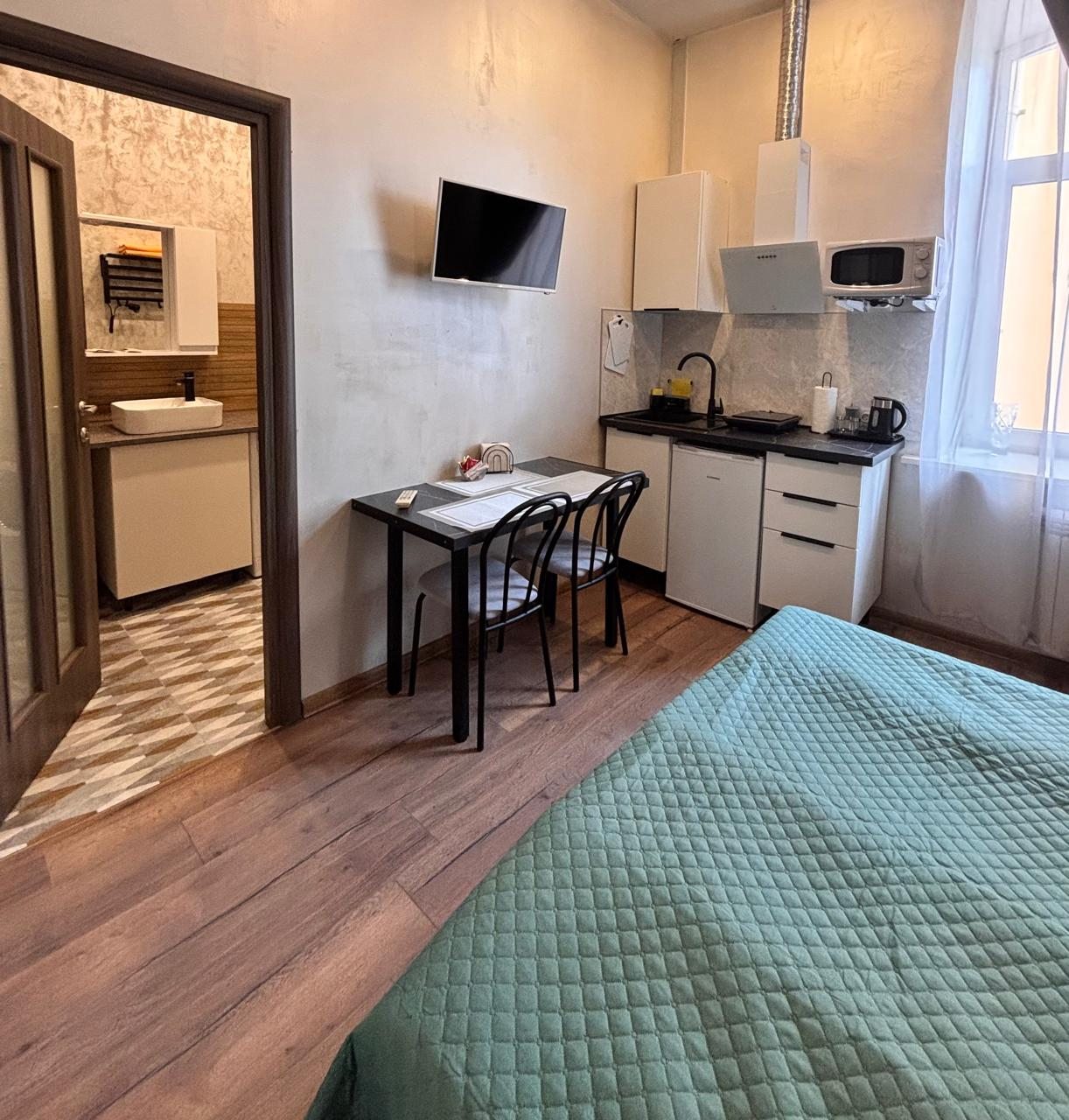 В атмосфере мы провели 7 дней. Нам понравился этот современный гостевой дом с актуальным ремонтом. Стоимость за сутки получается средняя, а условия проживания при этом комфортабельные. Вокзал находится рядом. Санузел у нас был в номере свой. Кухня общая в гостевом доме есть. Но так как занимали мы номер студио, у нас был свой кухонный гарнитур. Все рядом!