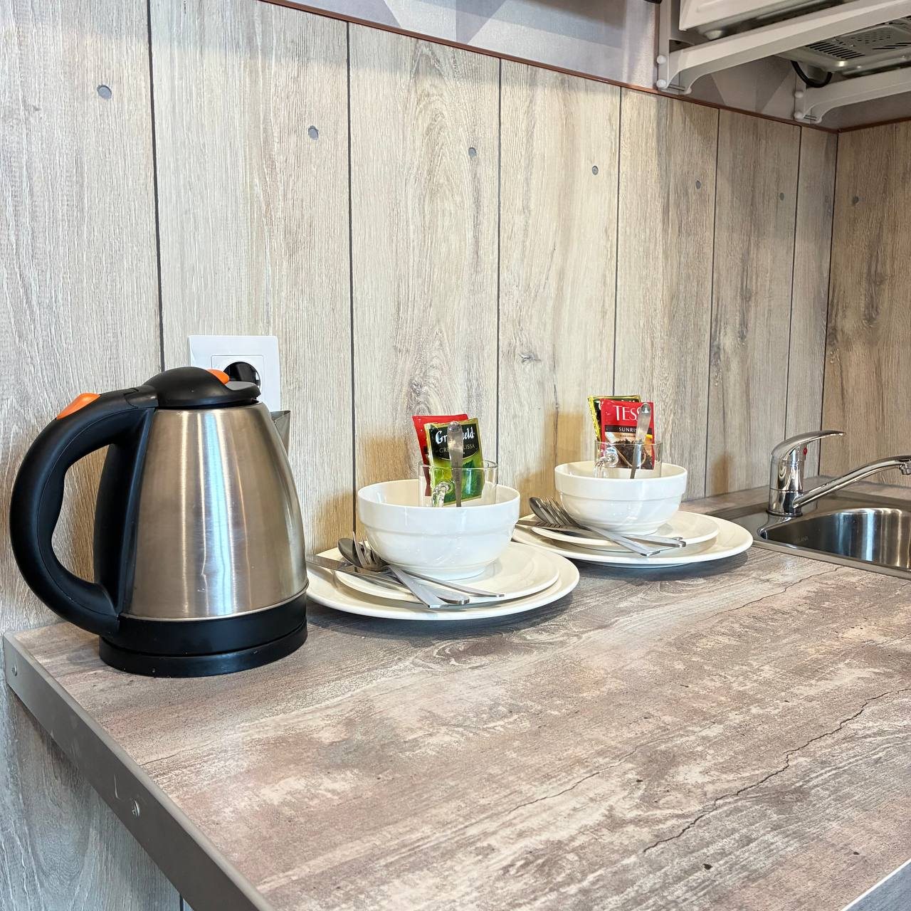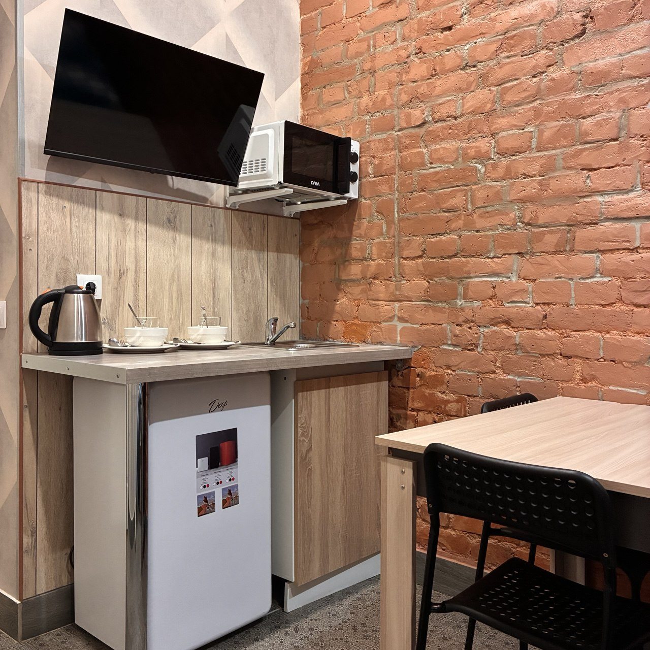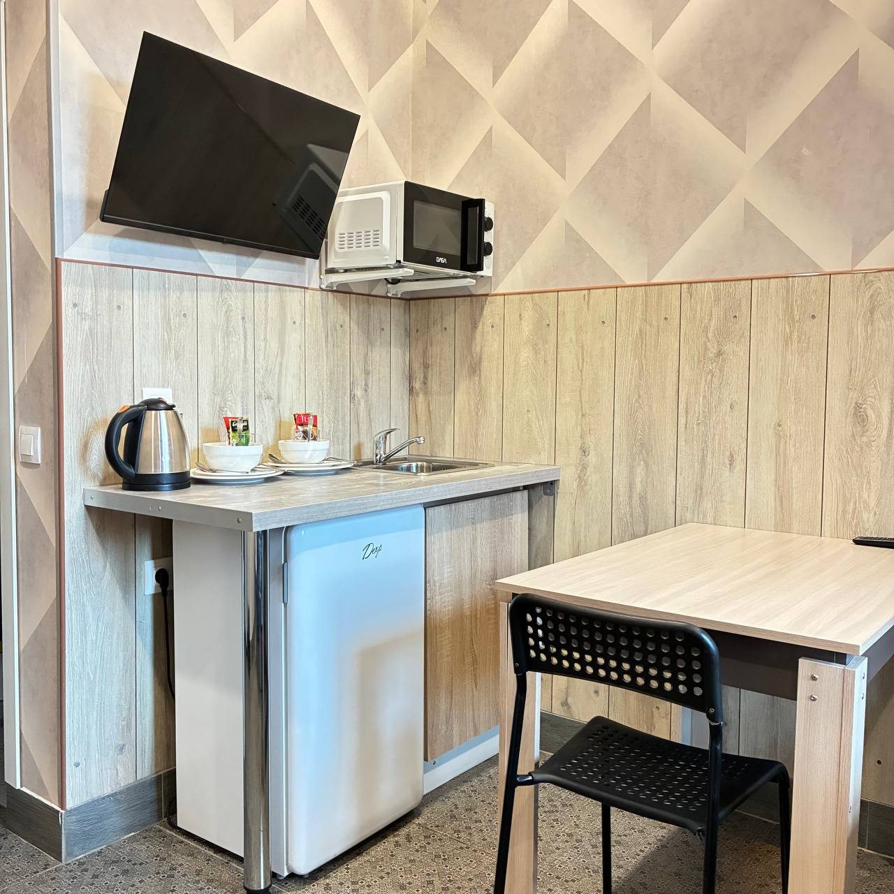 Мини-отель понравился. Я здесь был с женой, места на двоих достаточно. В номере есть кухонная зона с холодильником, посудой и разной техникой. Достаточно удобно, можно тут же готовить, а не на этаже, если вы предпочитаете готовить, а не питаться в кафе или в сухомятку. Отель неплох.