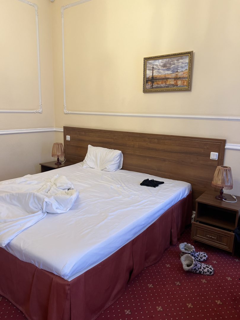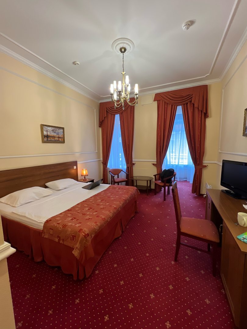 Близости в метро. И близость от московского вокзала. Можно просто пешком прийти с московского вокзала. Очень большая комната. И очень большая ванна. А также есть достаточно большой балкон. То есть есть куда положить вещи. Для двух людей точно хватит. Очень большая кровать. Даже больше чем двуспальная. Есть стол за которым можно работать. Если обогреватель. Греет очень хорошо. Есть три стула, две тумбочки, и два торшера, можно выключить свет и пользоваться только торшерами. Очень красивый стены. В стиле барской комнаты. Все очень чисто. Особенно понравилось очень чистая ванная и очень чистая душевая кабинка. Видно что новая. Есть также прикроватный столик. Туда можно складывать еду а также есть холодильник. Холодильник бесшумный. Шума в комнате вообще нету. Очень хорошая шумоизоляция хотя окна выходят на проезжую часть. Никаких вечеринок здесь нет. Все очень тихо и спокойно. Очень приятный персонал. Всегда помогут всегда расскажут. По меркам Петербурга вне сезон очень даже дёшево