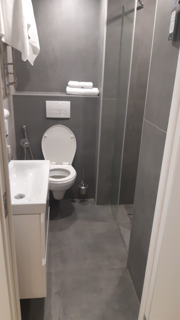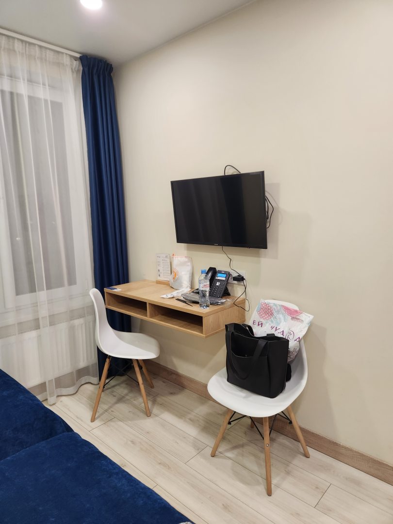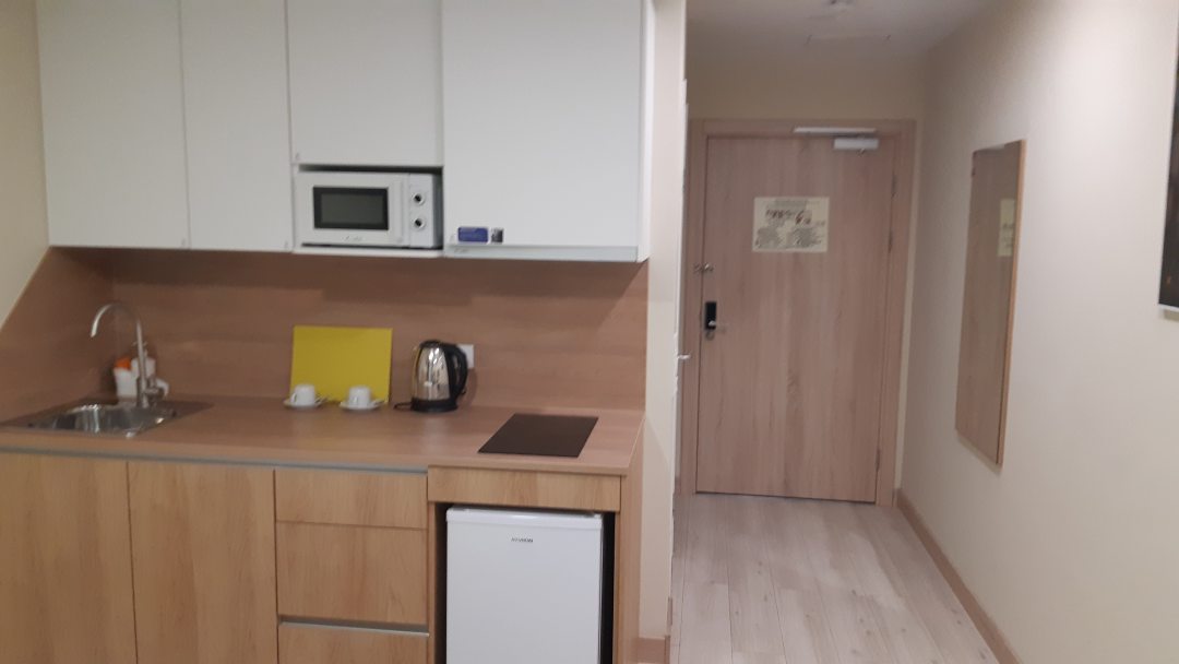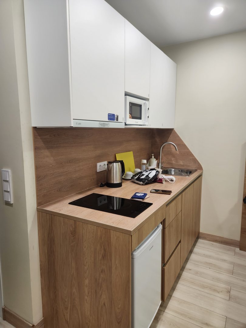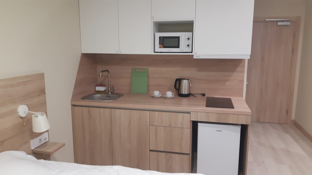 Прекрасное место, чтобы остановиться не на очень долгий срок, маленький компактный номер. В номере есть кухонька, можно что-то элементарно перекусить. Чайник, мини-холодильник. Отличный душ.