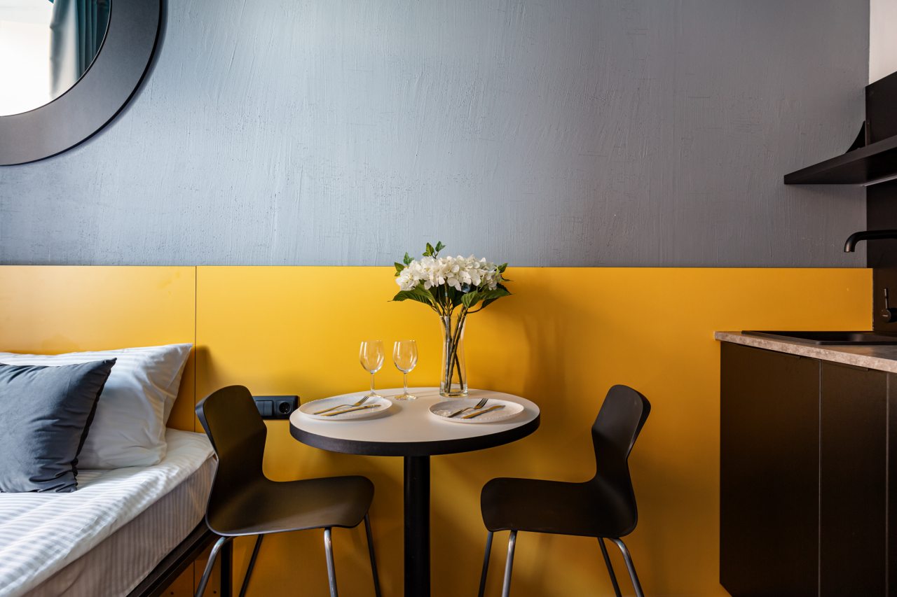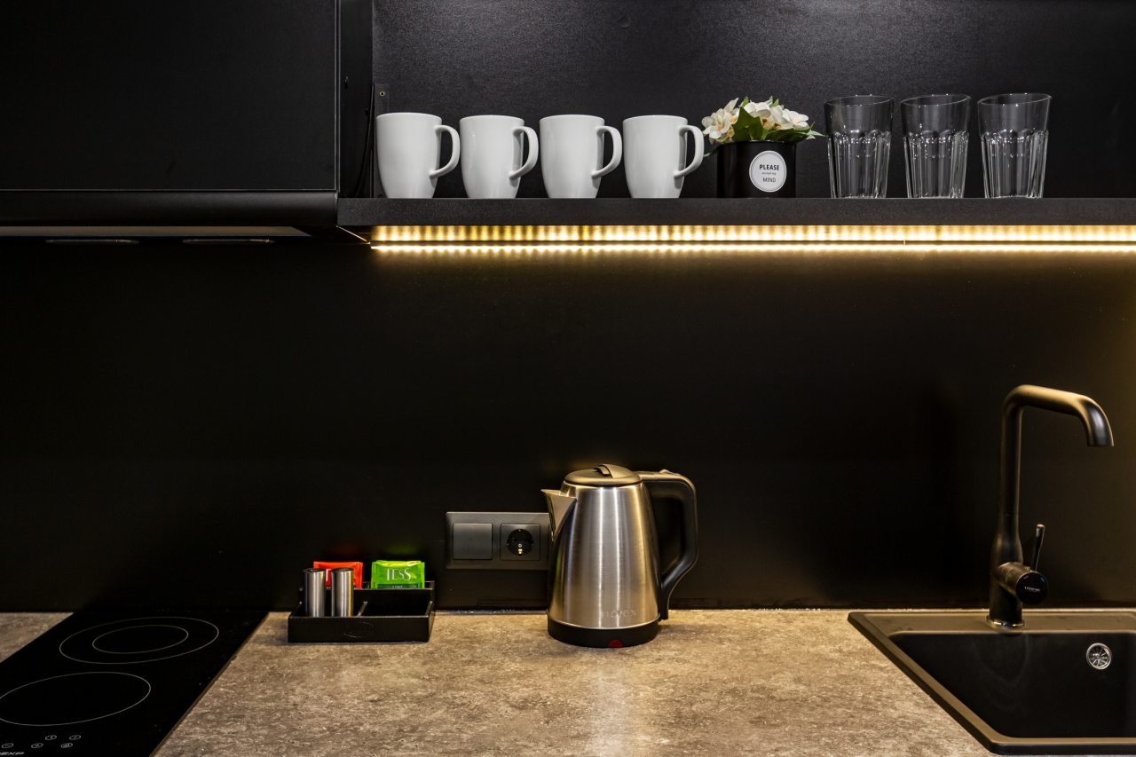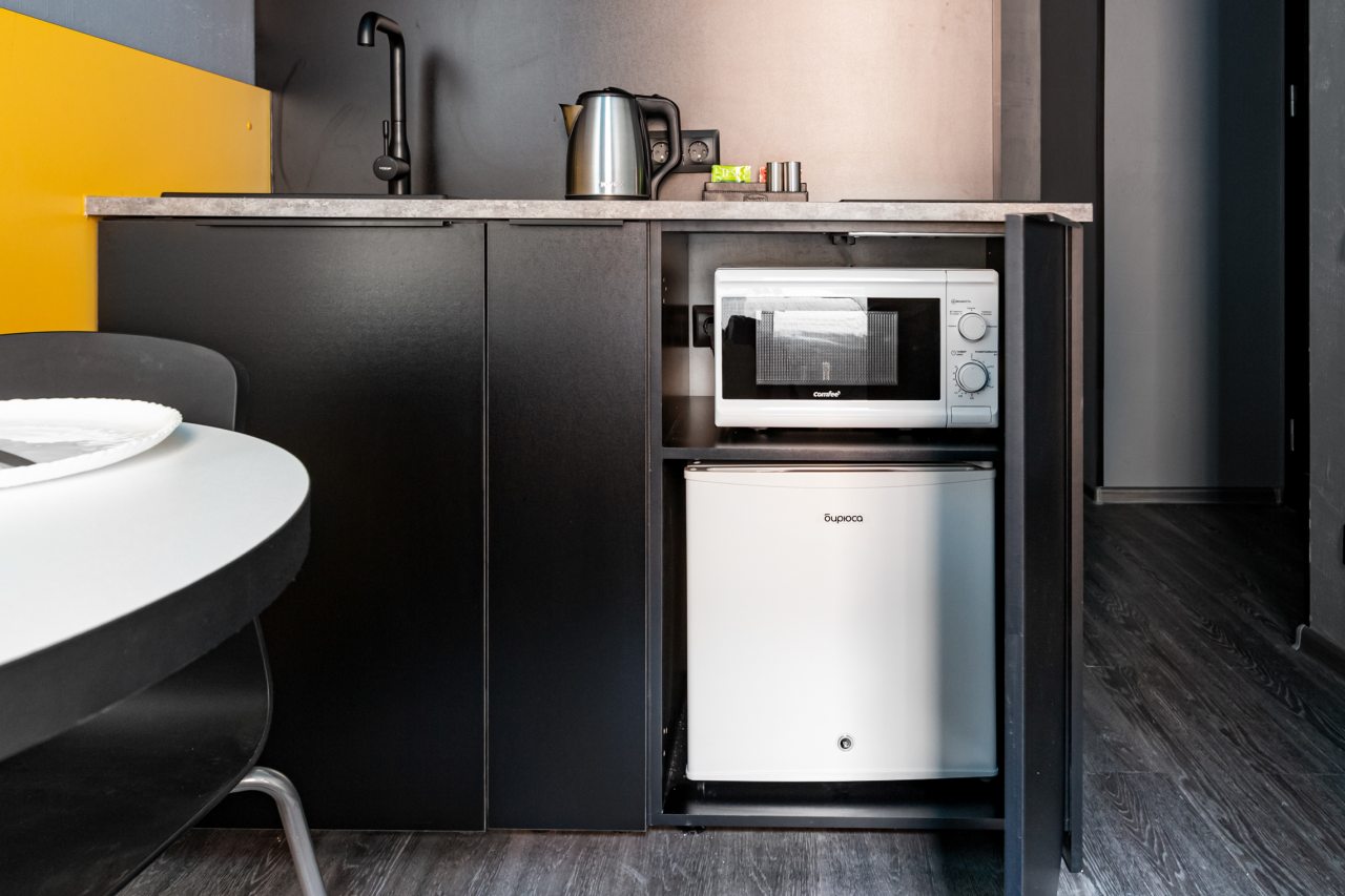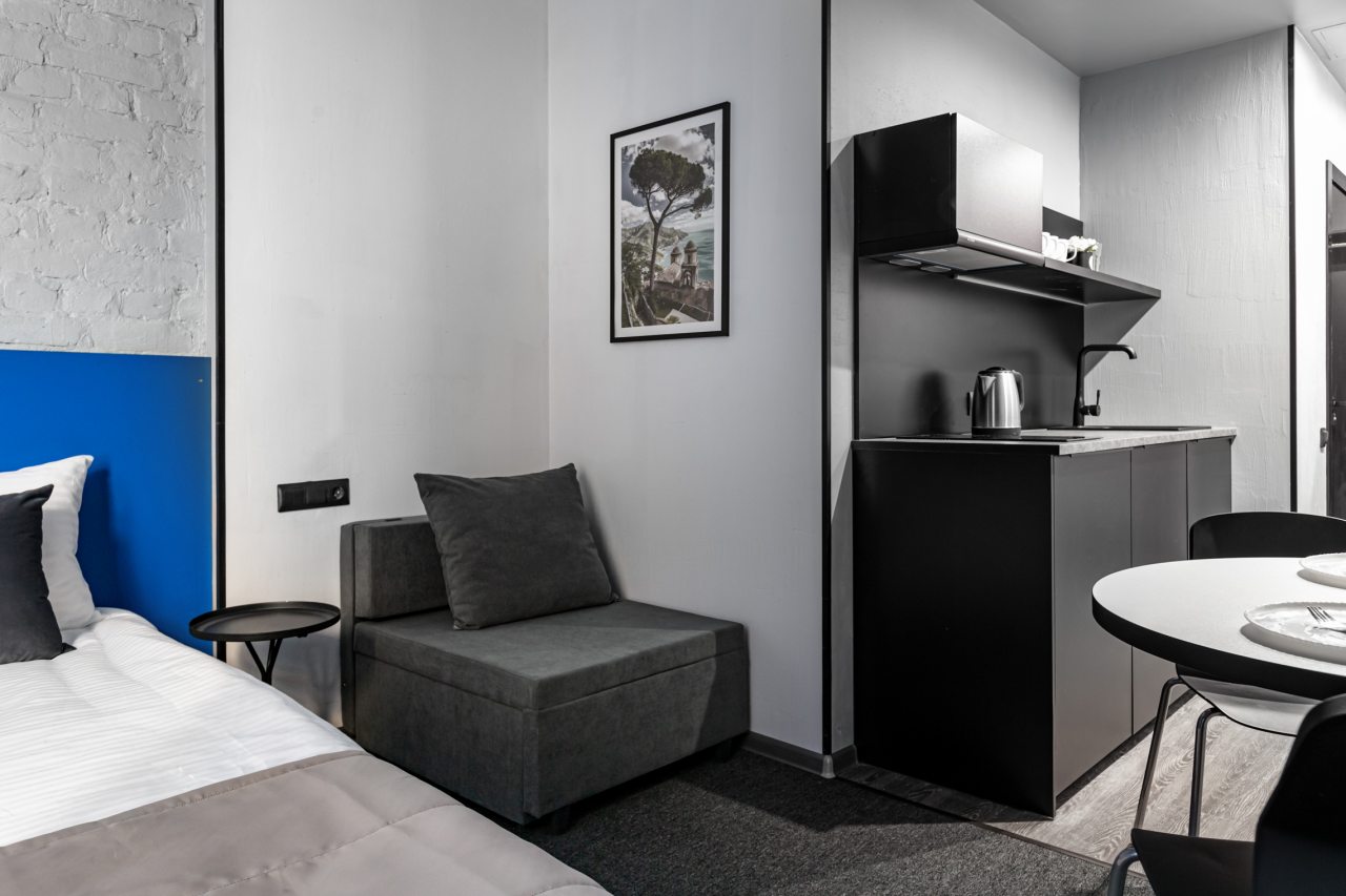 Часть номеров оборудована кухней, что позволяет чувствовать себя в гостинице как дома. Категория студия располагает полностью оборудованными зонами с современными бытовыми приборами. В окрестностях расположено множество заведений с разнообразной кухней, где можно вкусно поесть.