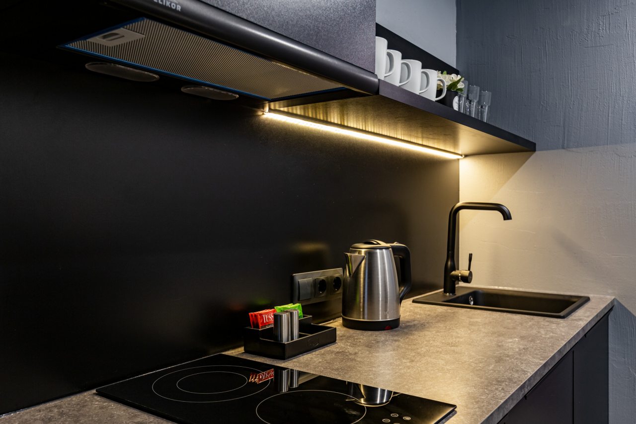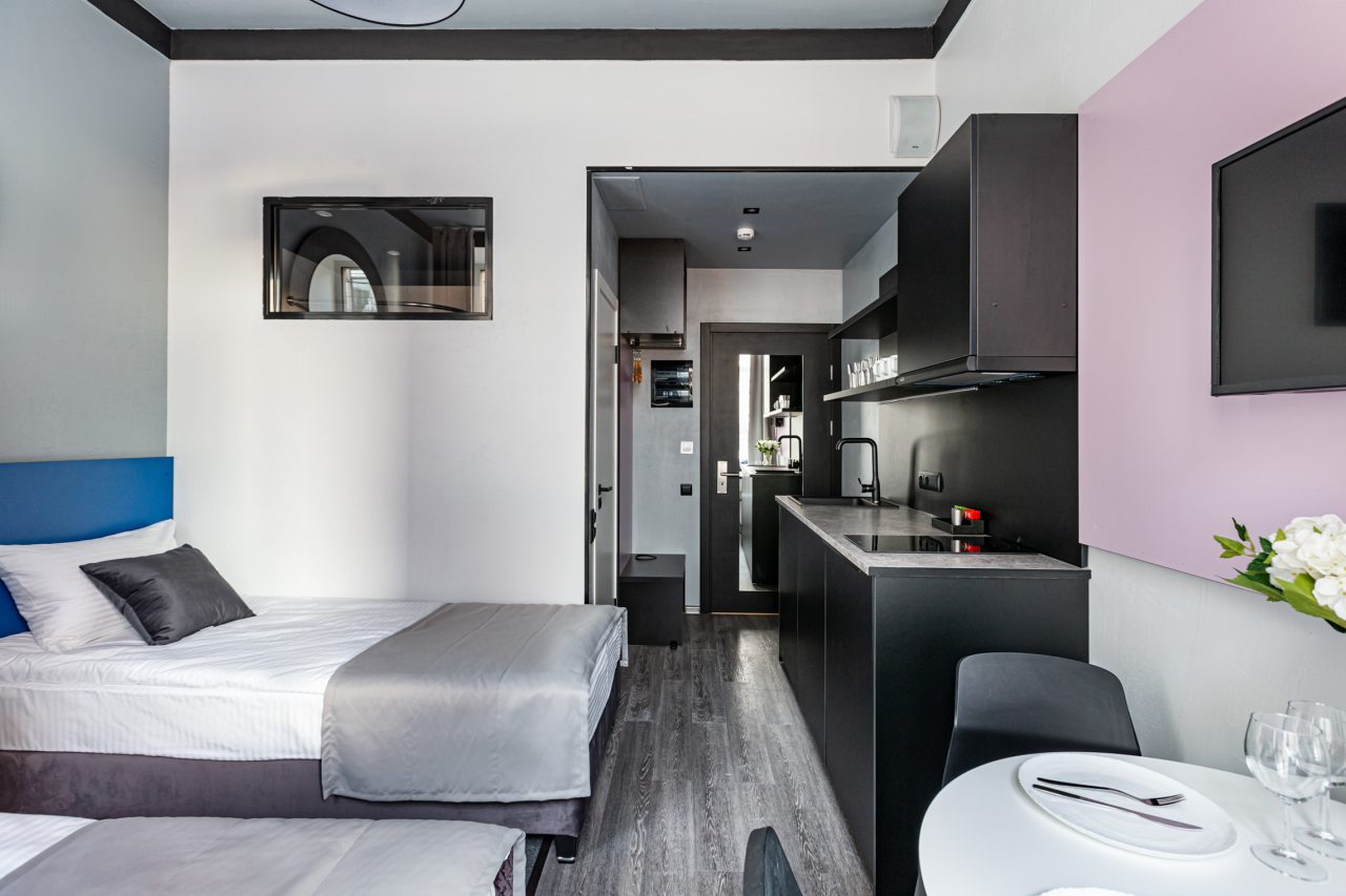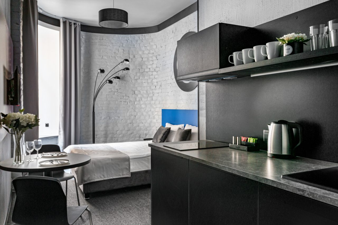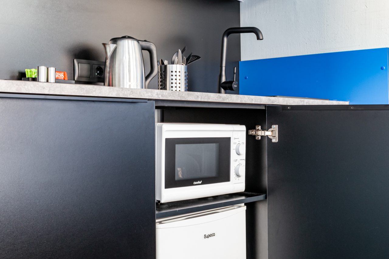 Часть номеров оборудована кухней, что позволяет чувствовать себя в гостинице как дома. Категория студия располагает полностью оборудованными зонами с современными бытовыми приборами. В окрестностях расположено множество заведений с разнообразной кухней, где можно вкусно поесть.