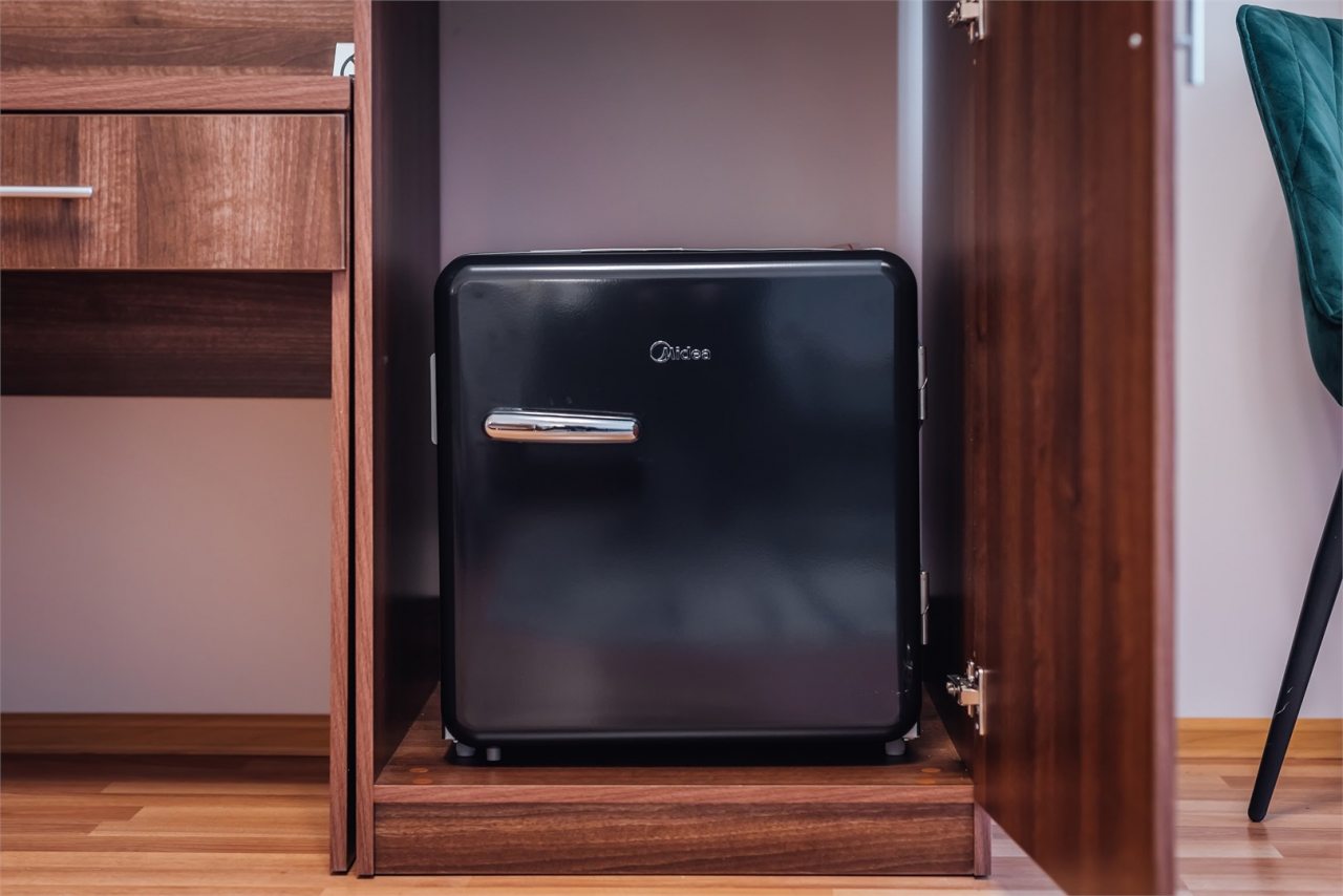 Есть небольшой удобный холодильник.